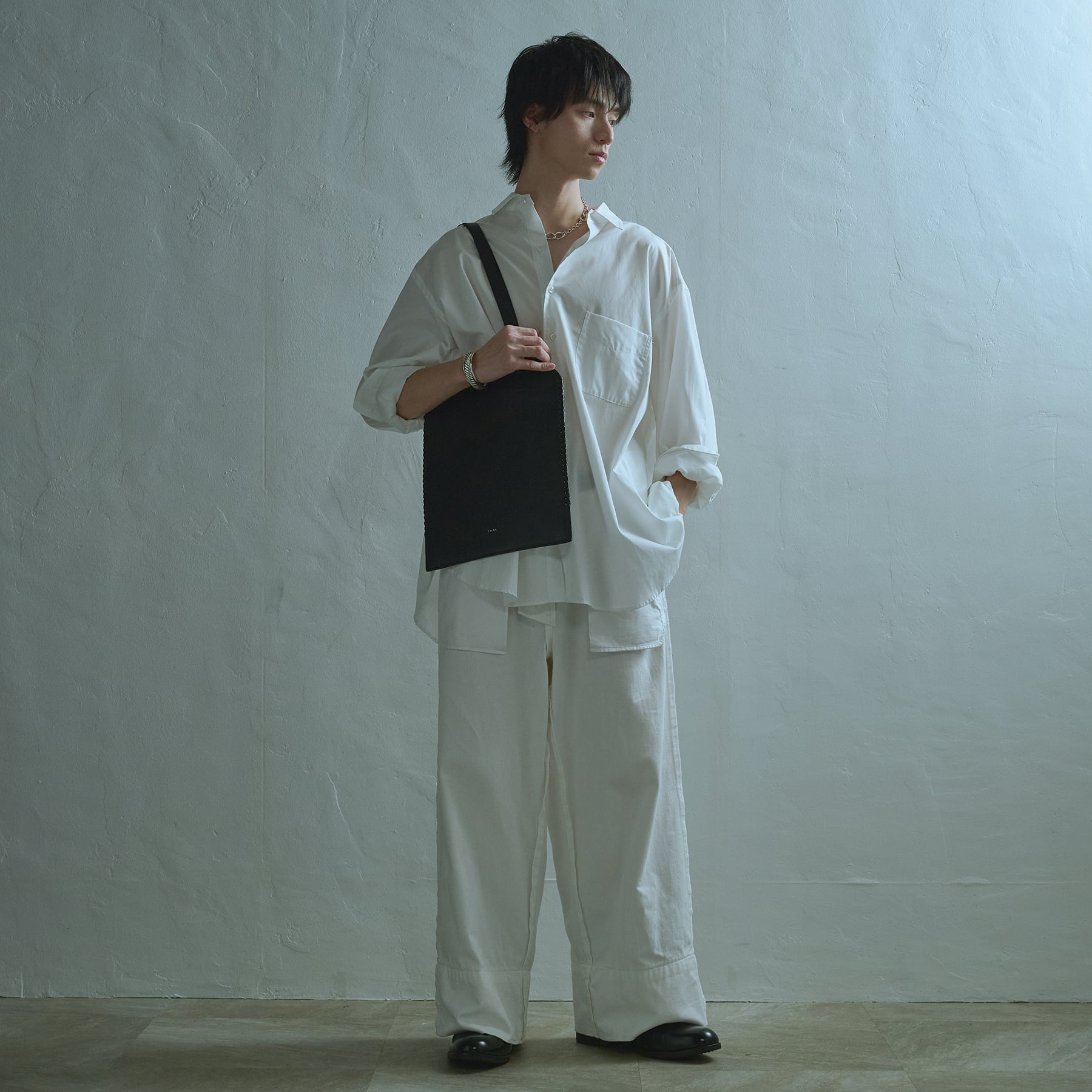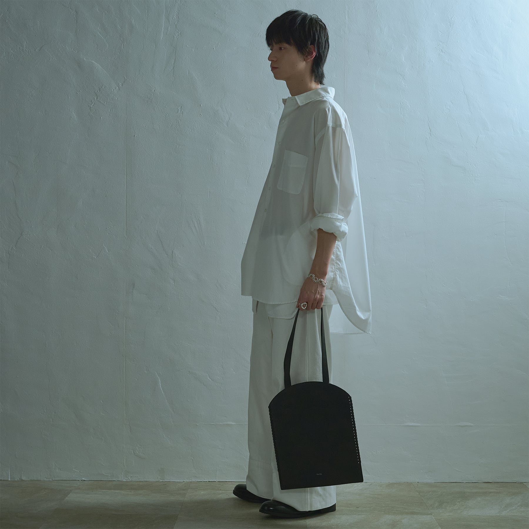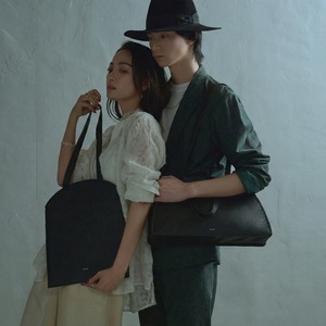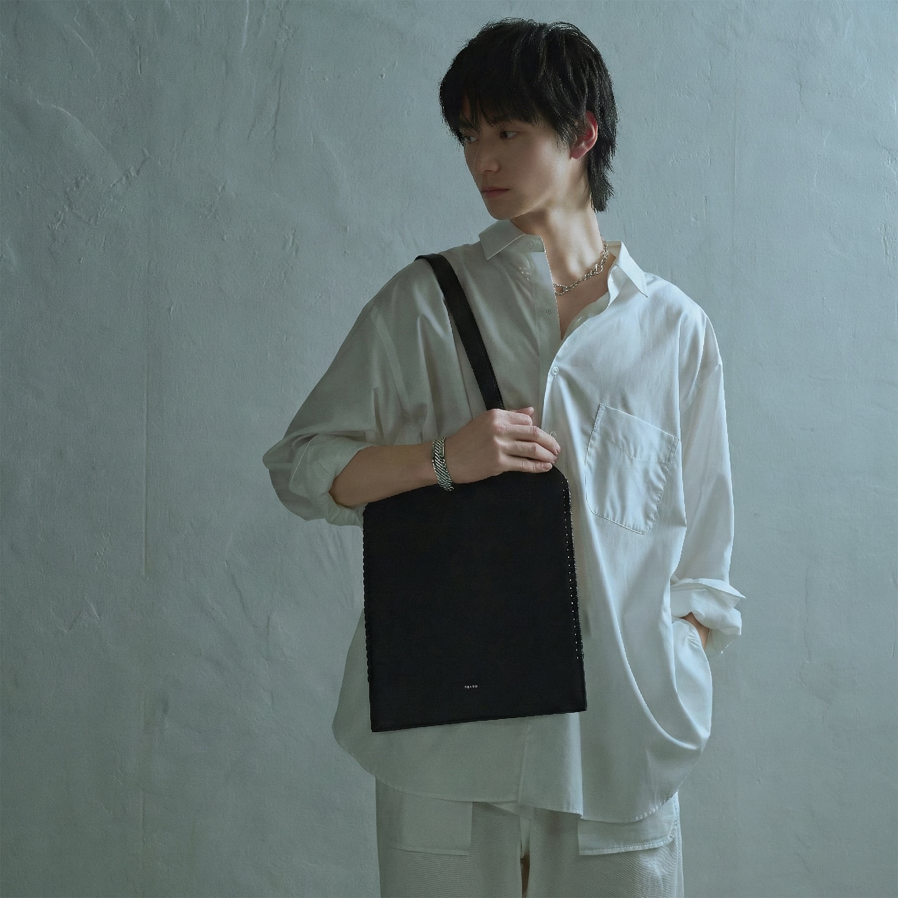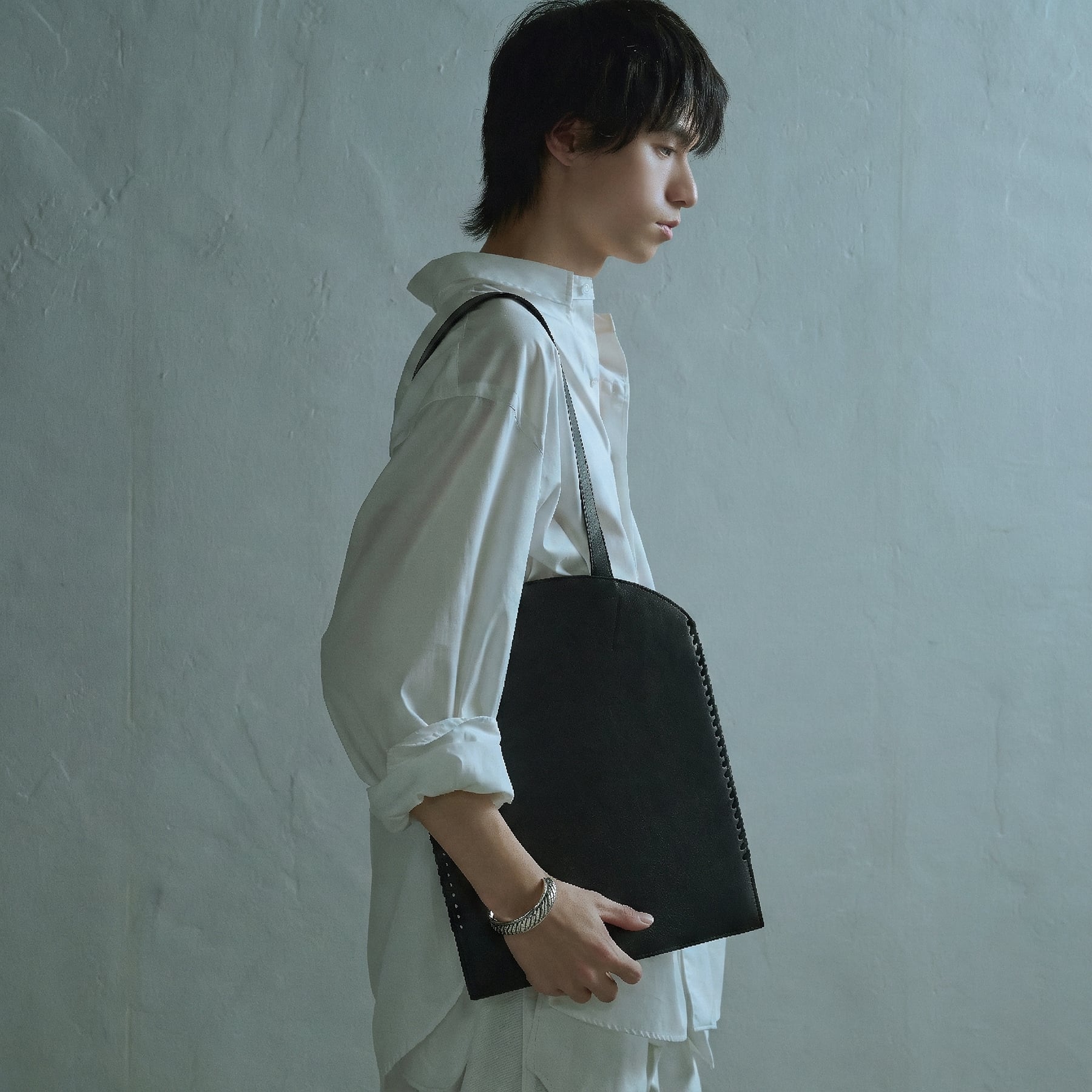 レザーコードで編み上げたデザインがポイントの薄型トートバッグ