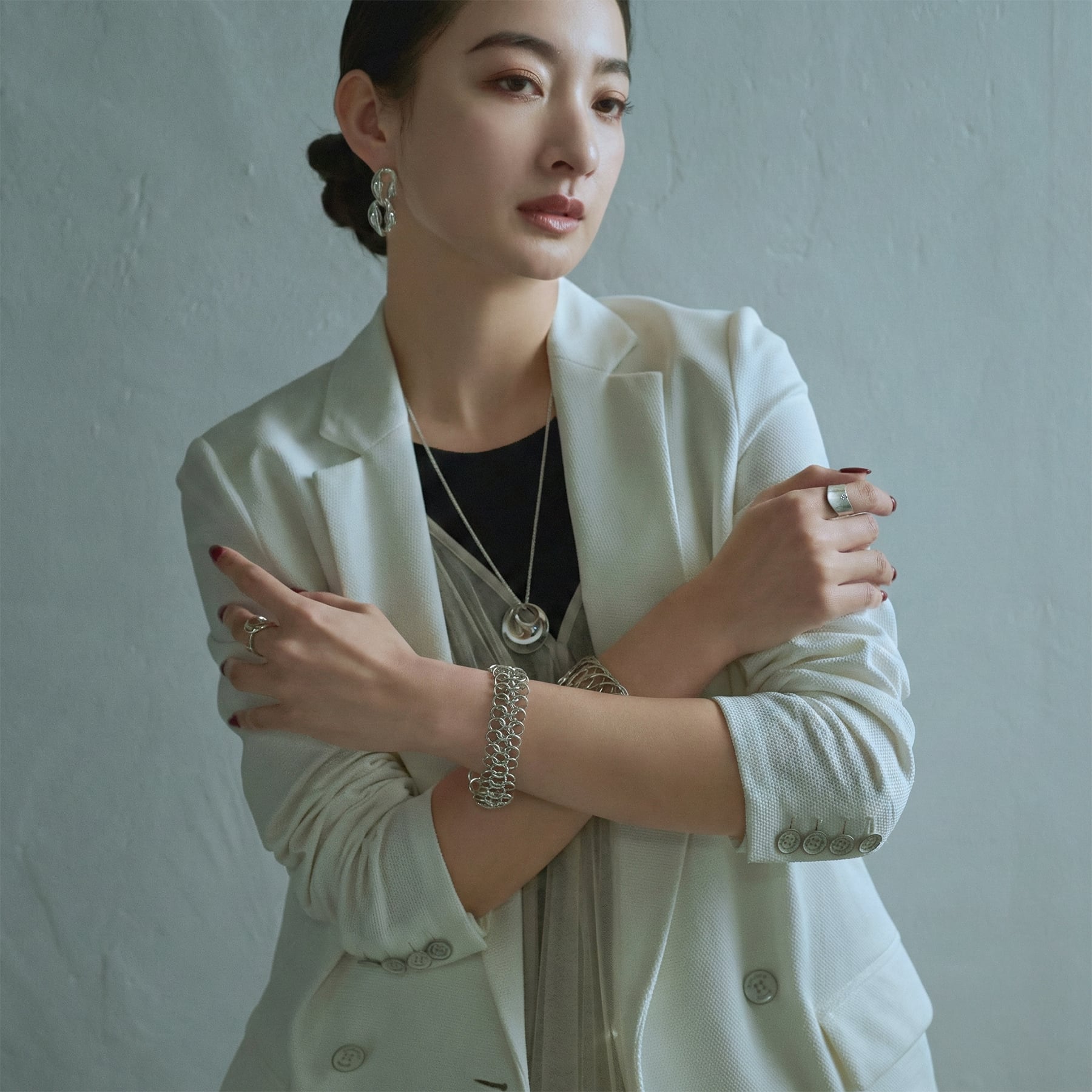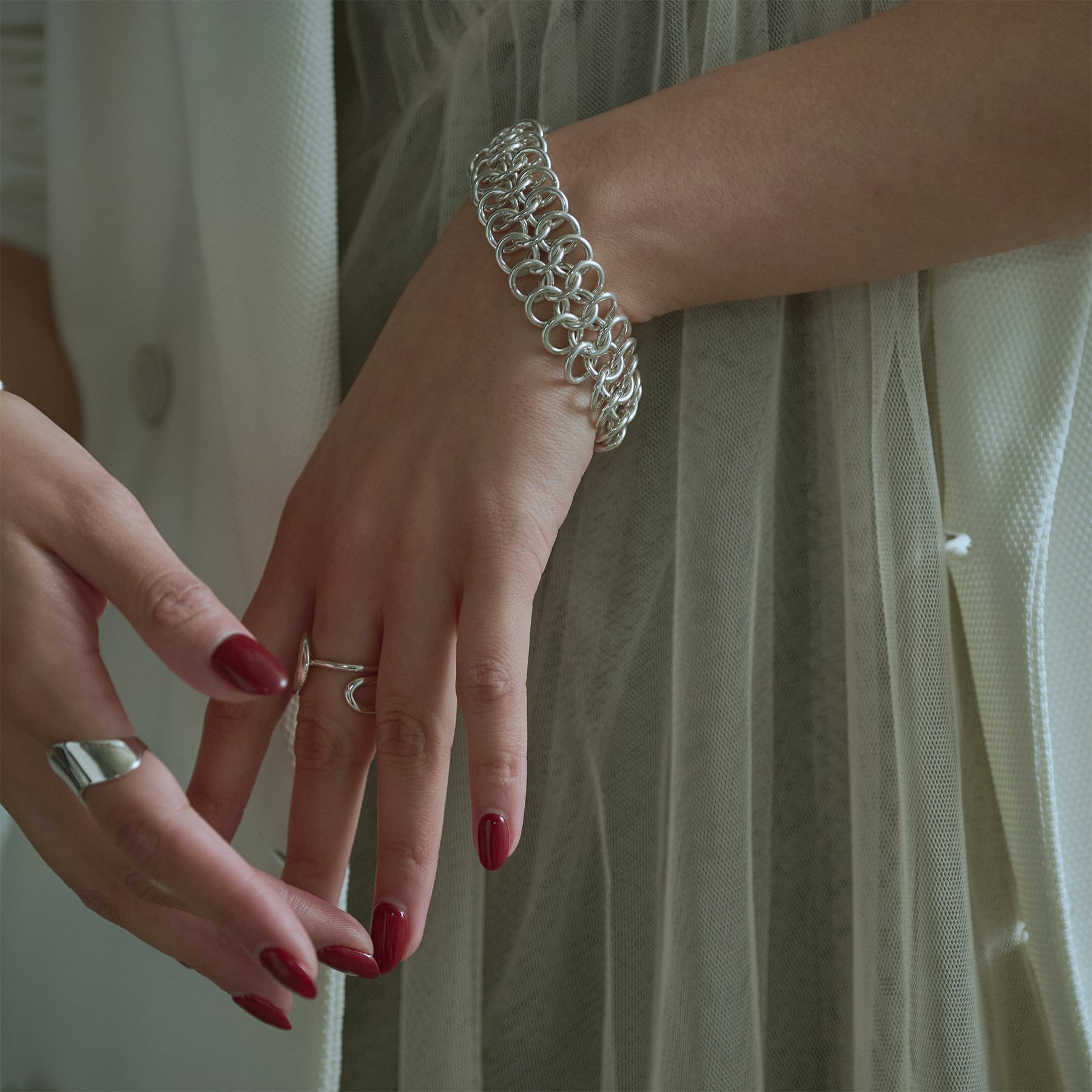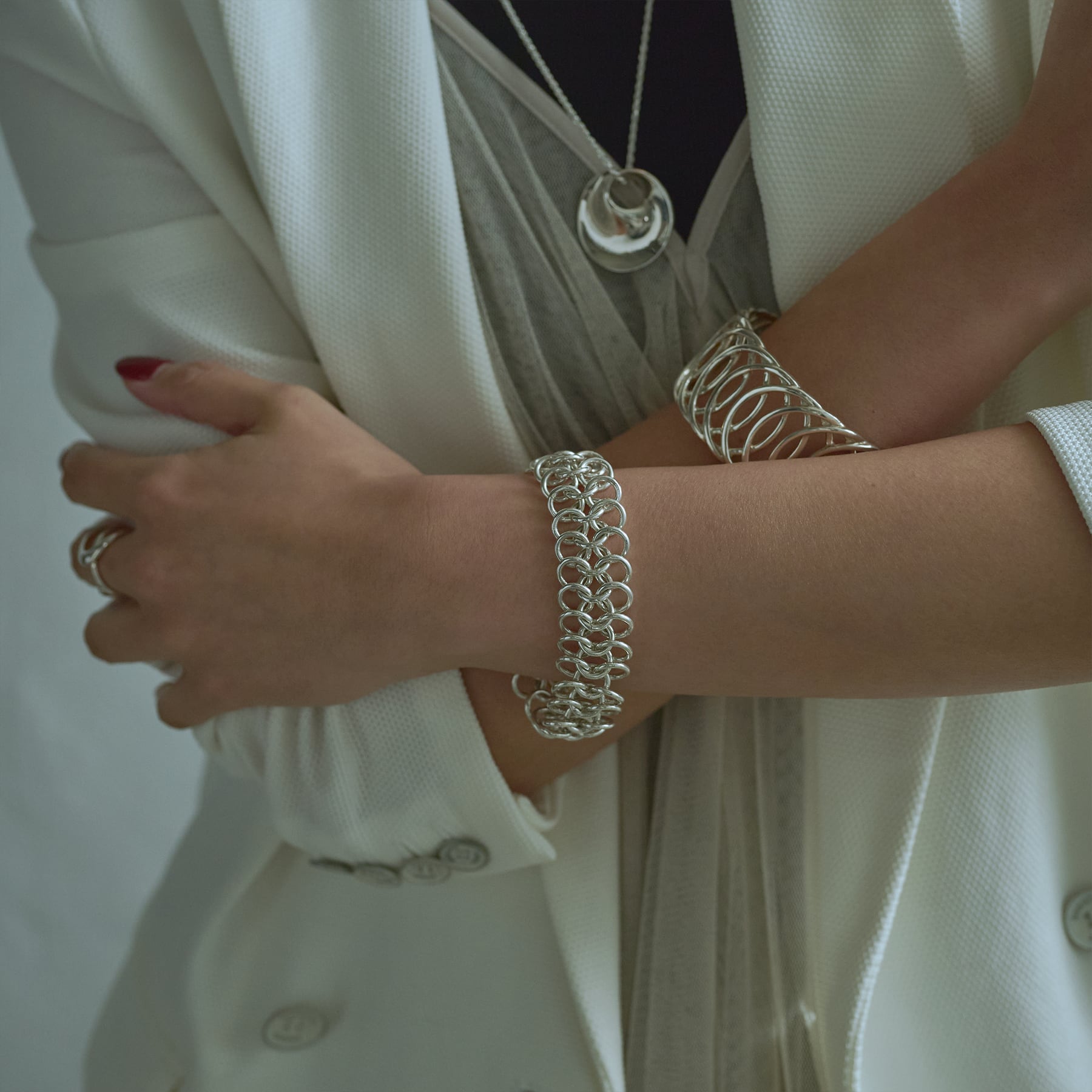 銀環が連なり、立体的な陰影と上質な輝きを奏でる。