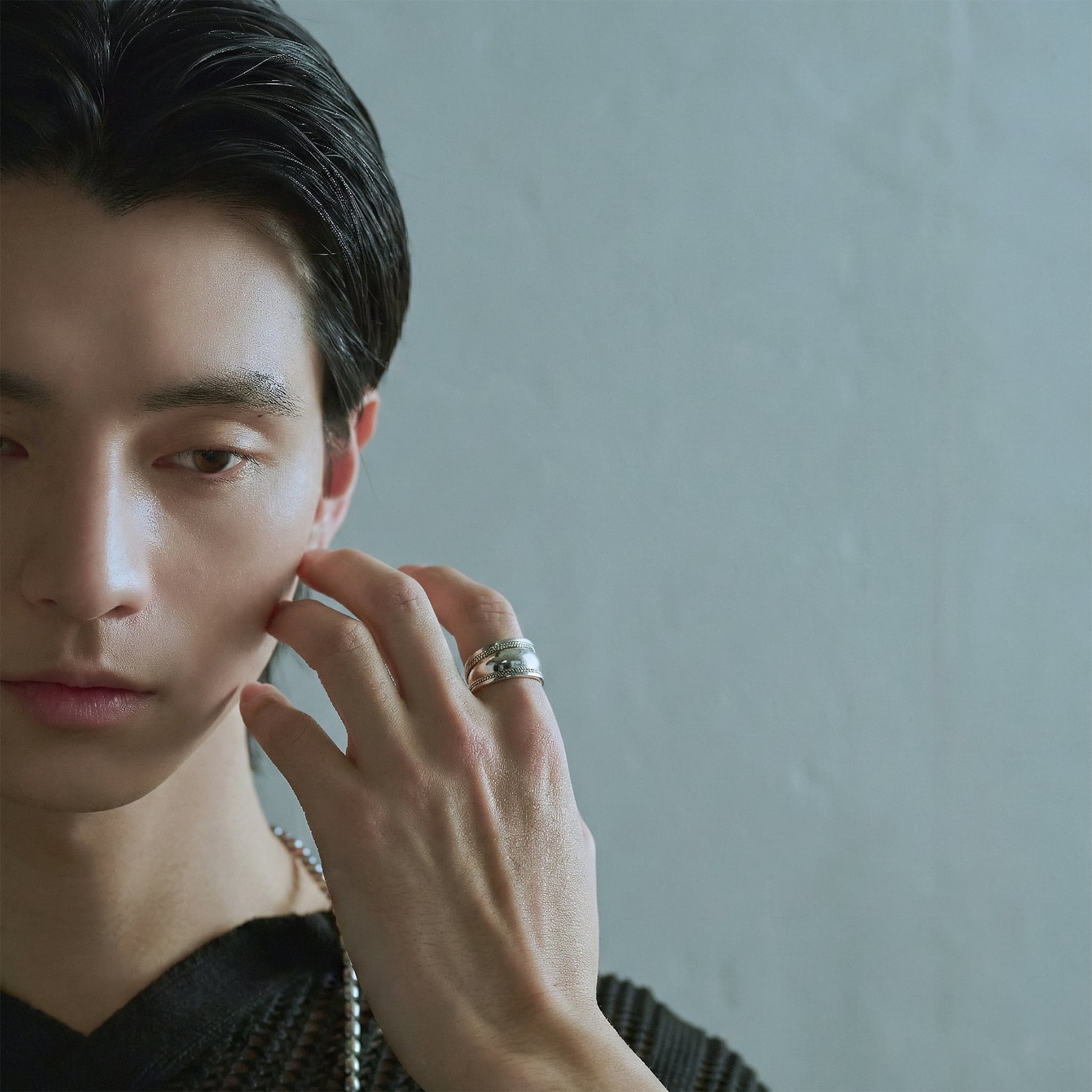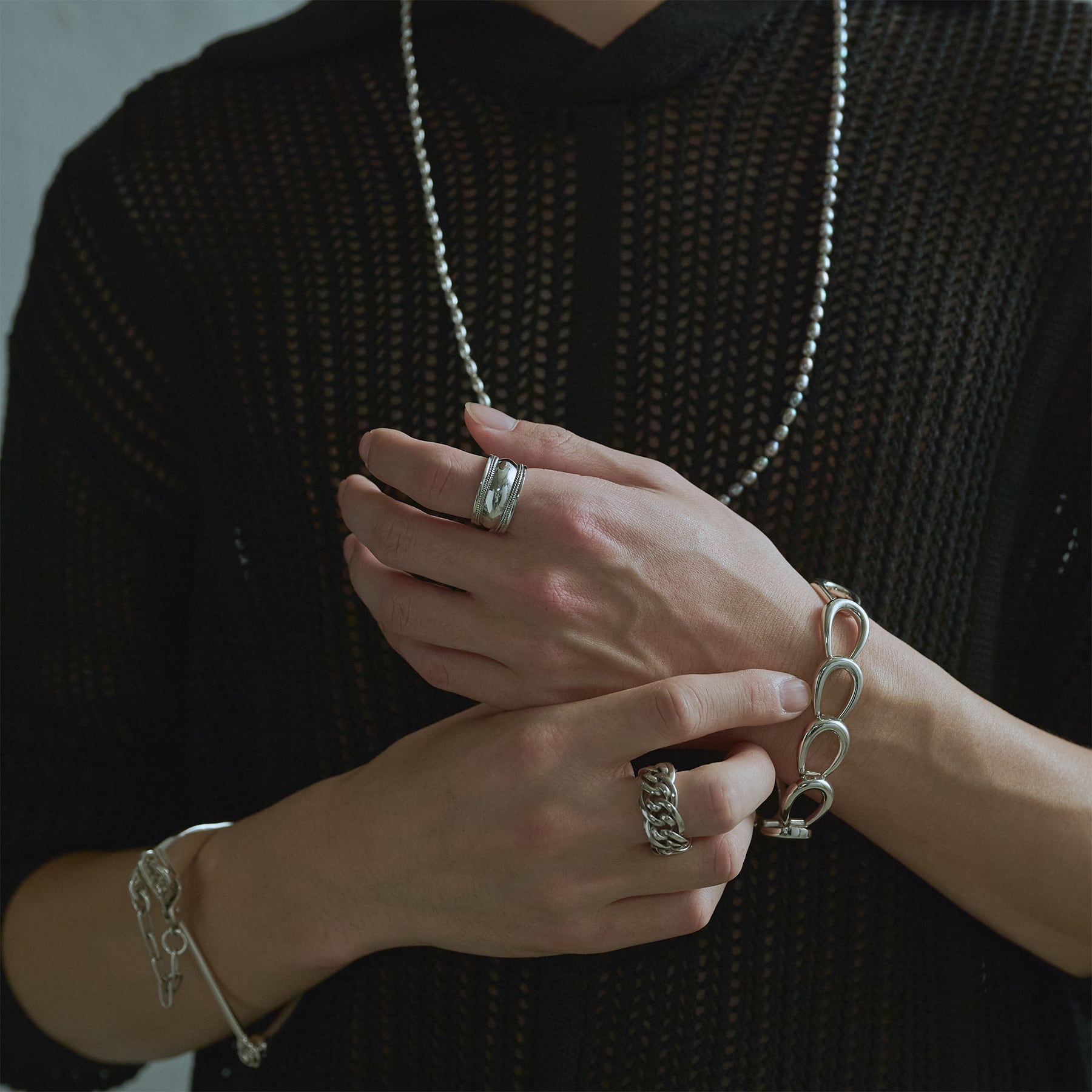 珠のような膨らみを、繊細な鎖の装飾で囲う。
