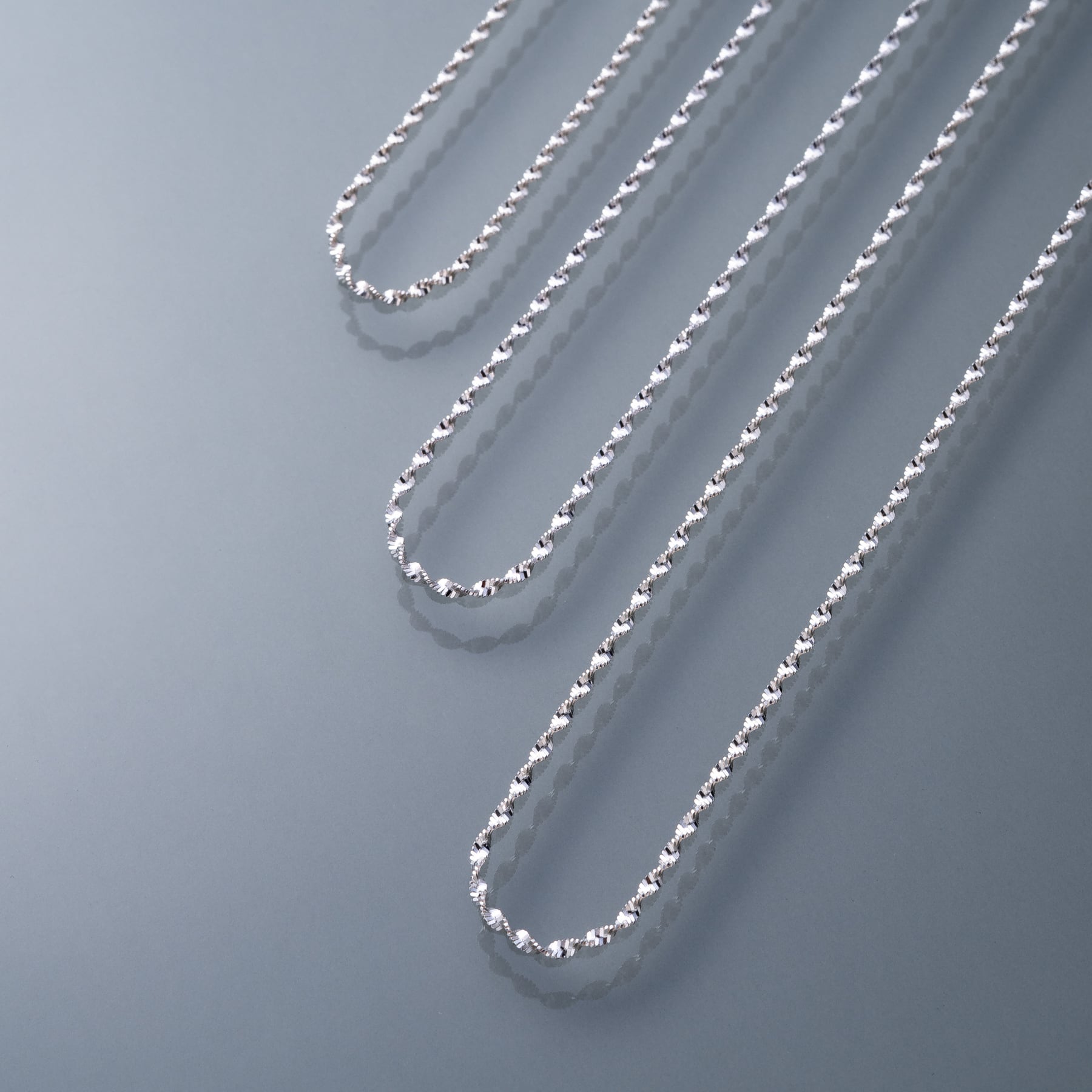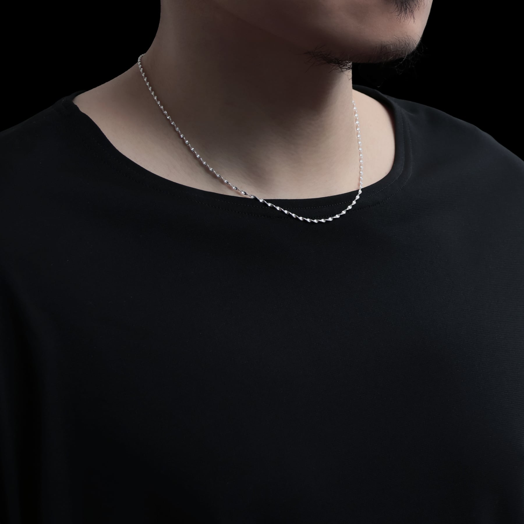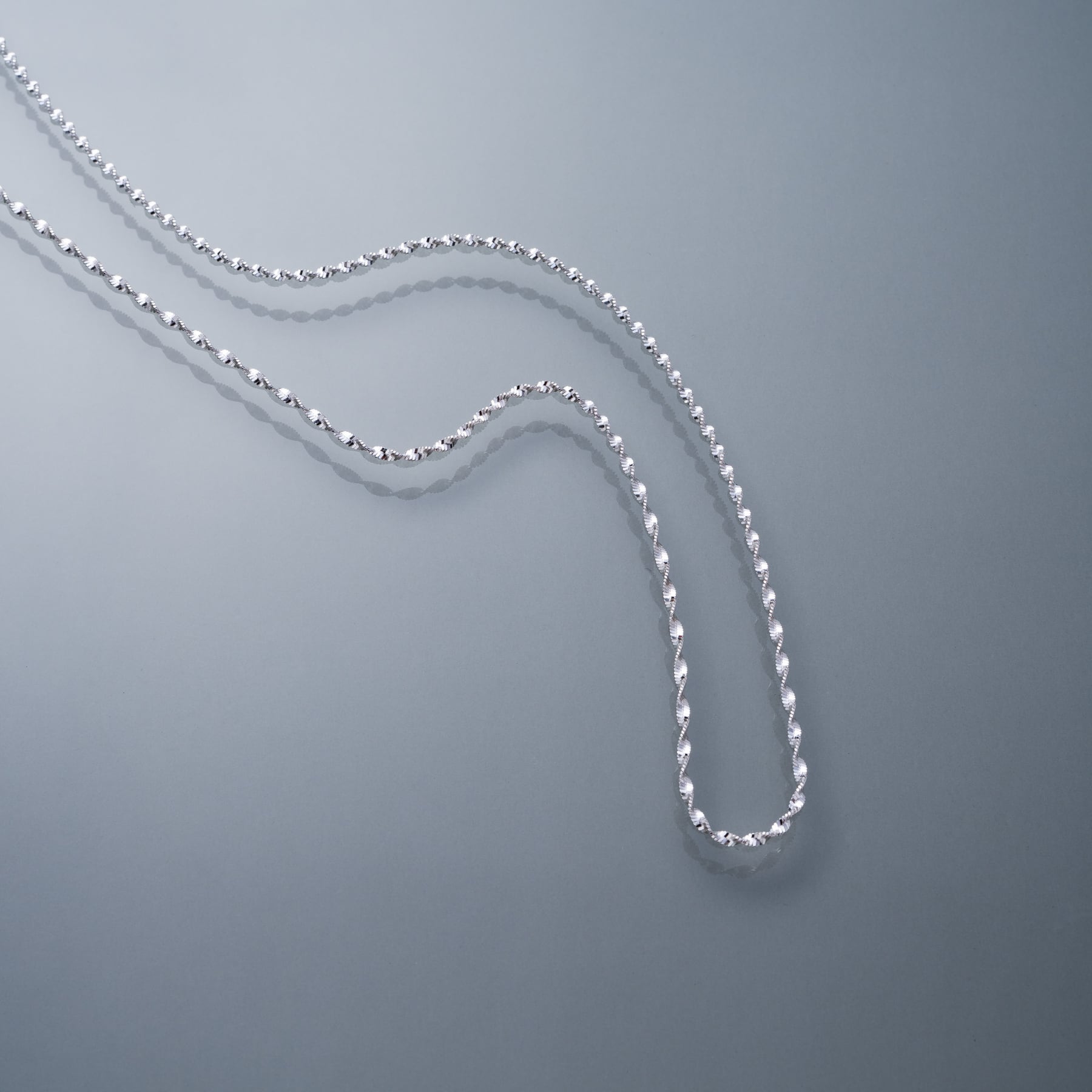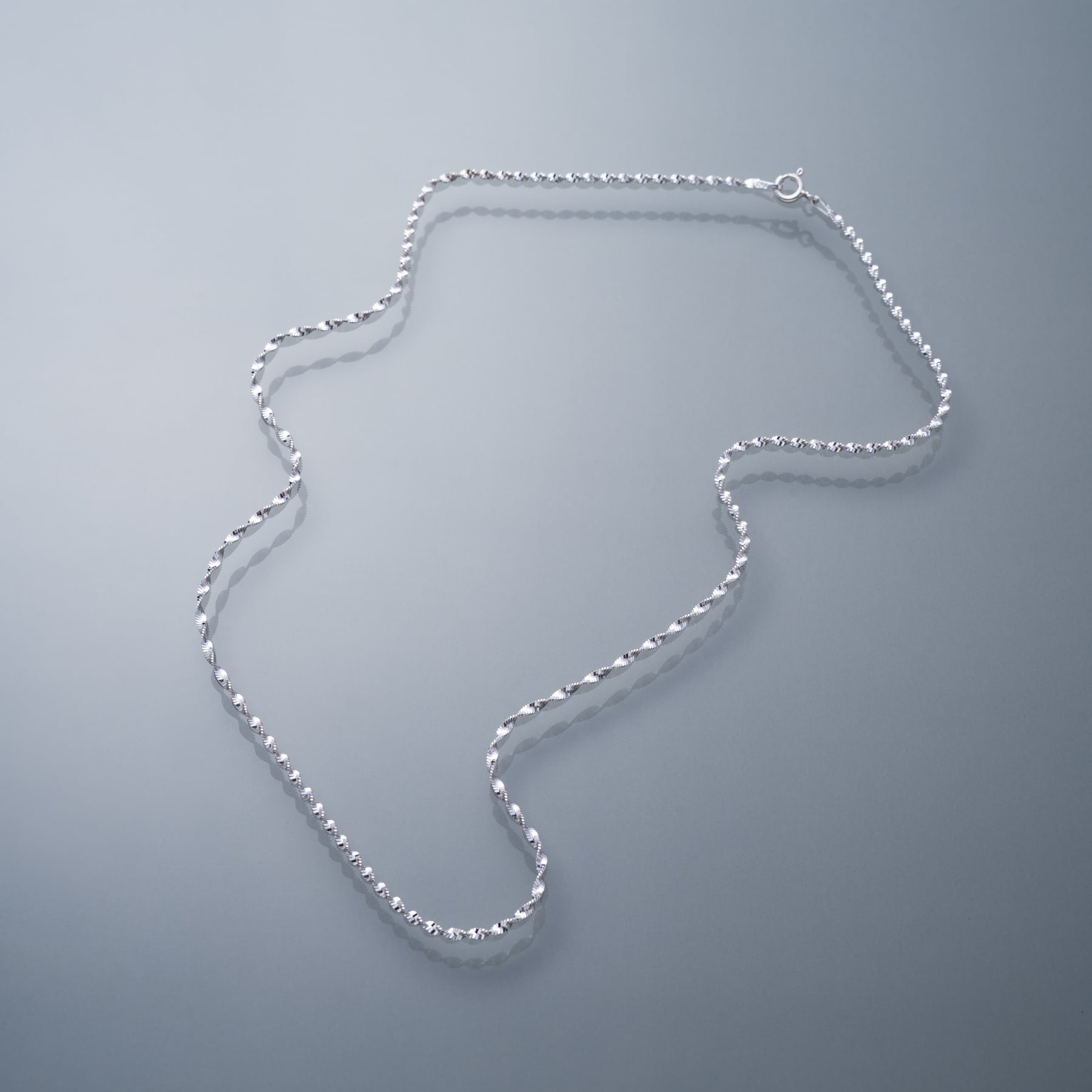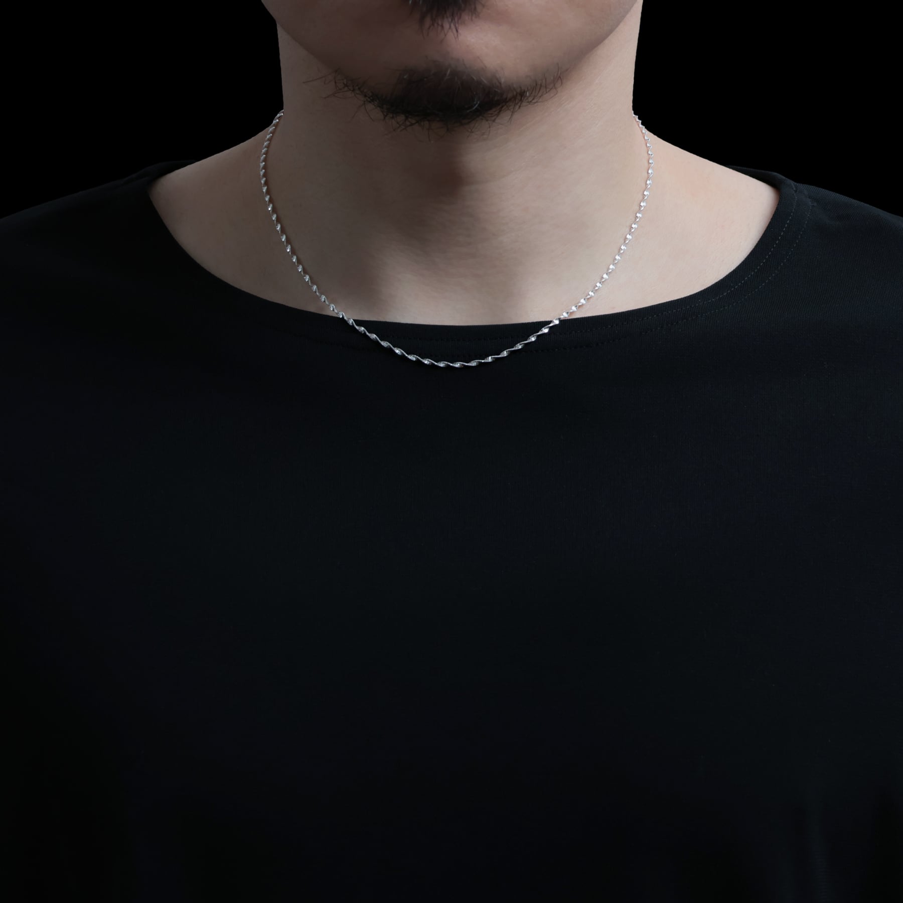 ・ねじれたチェーン連なり角度ごとに異なる輝きを生み出すネックレス。