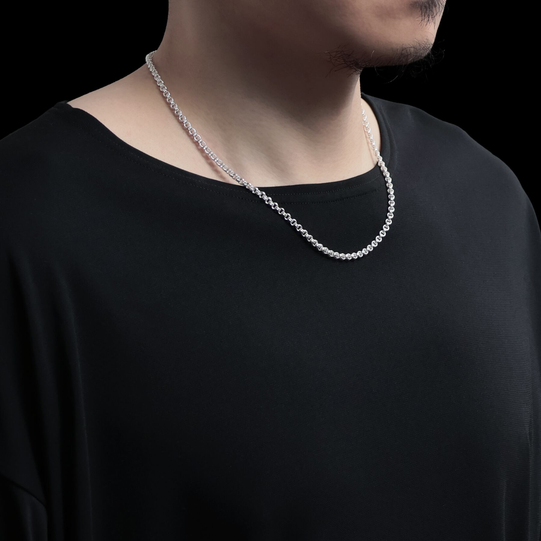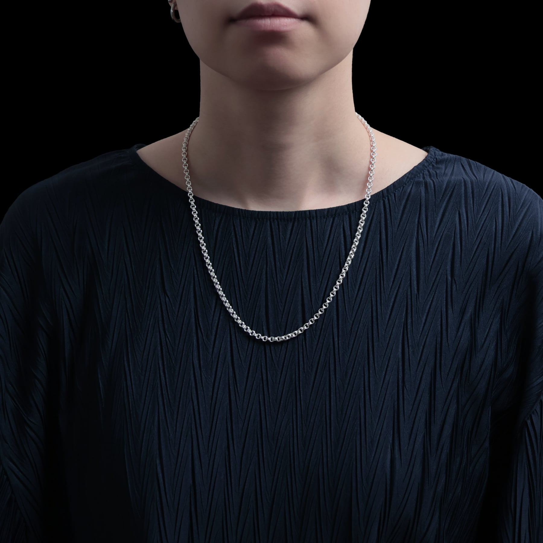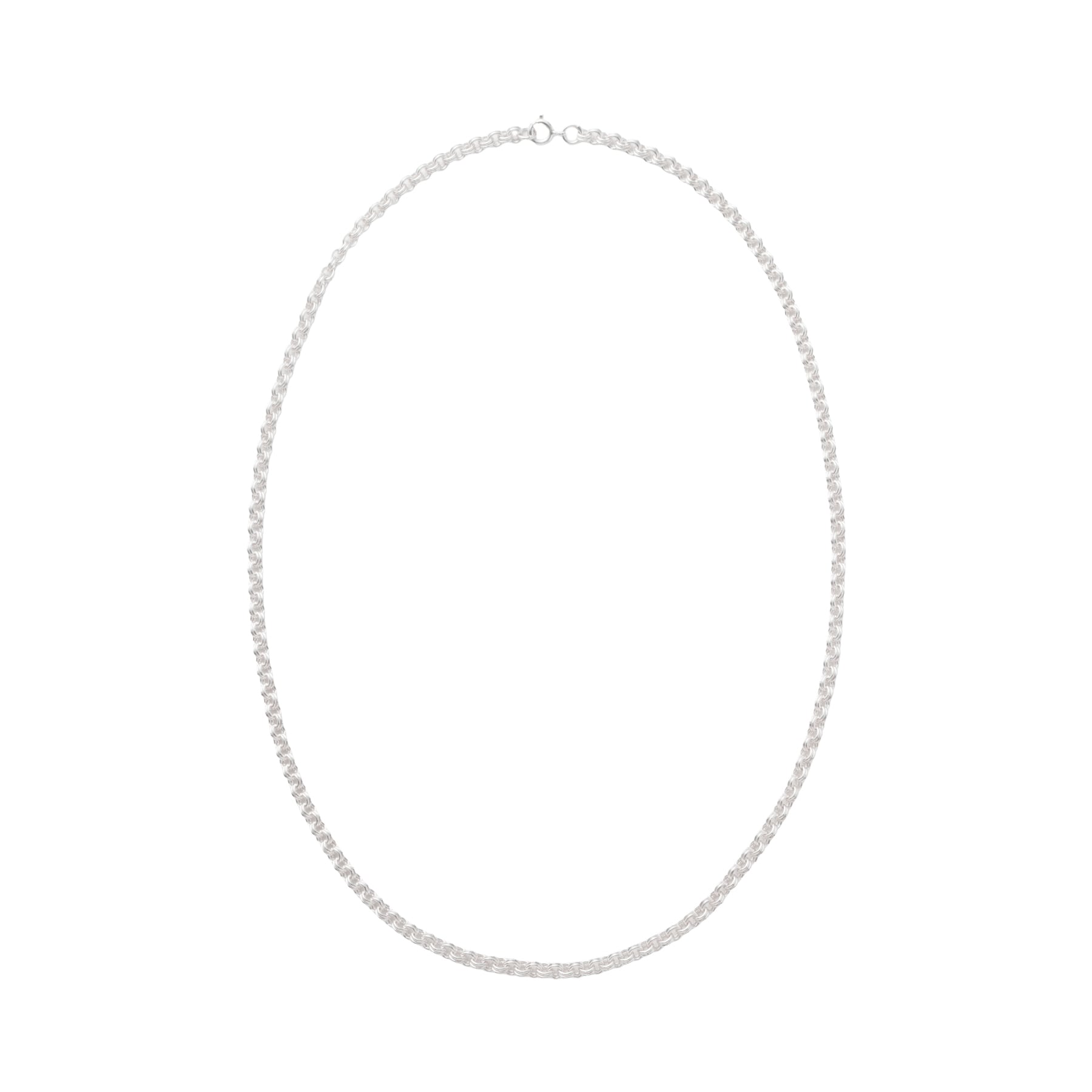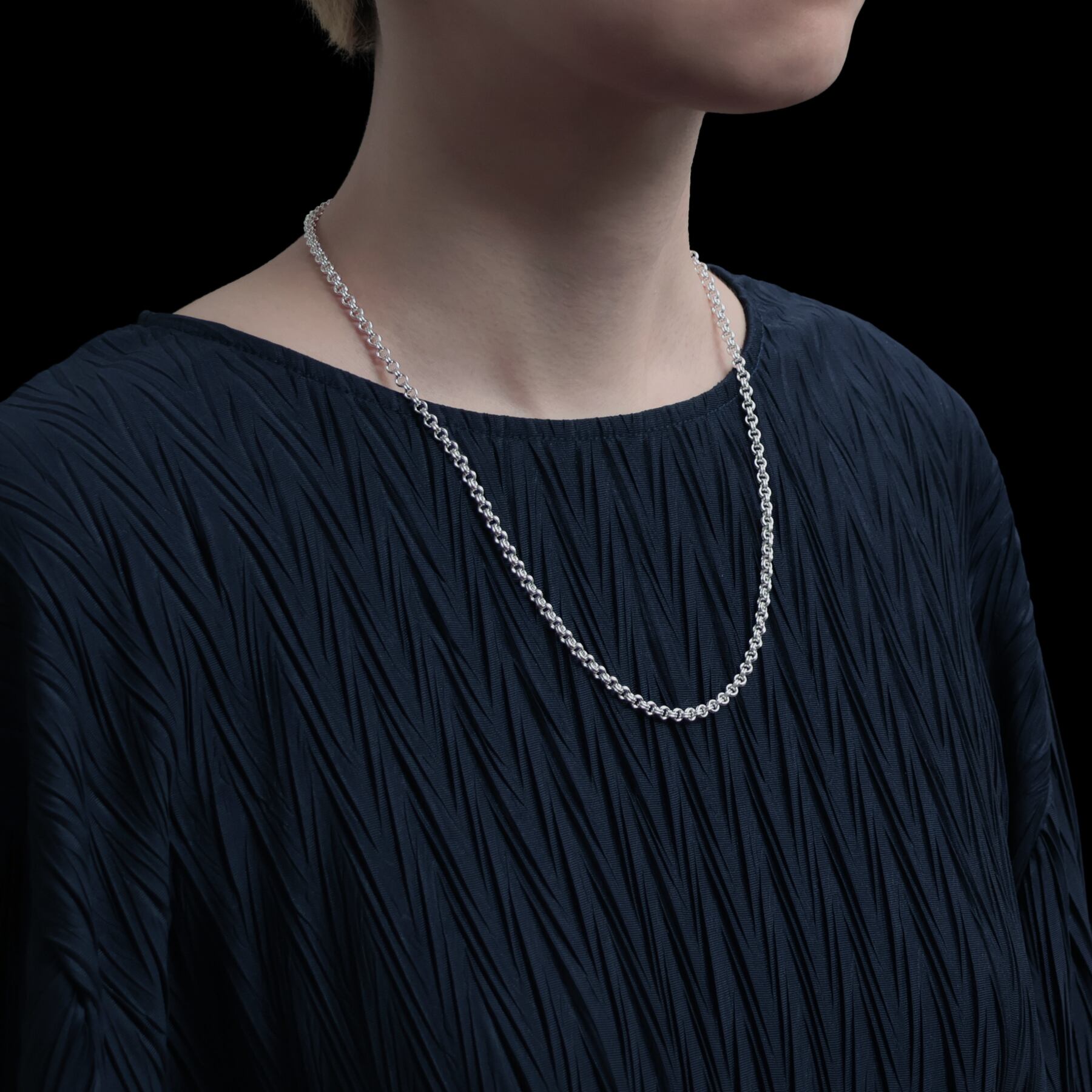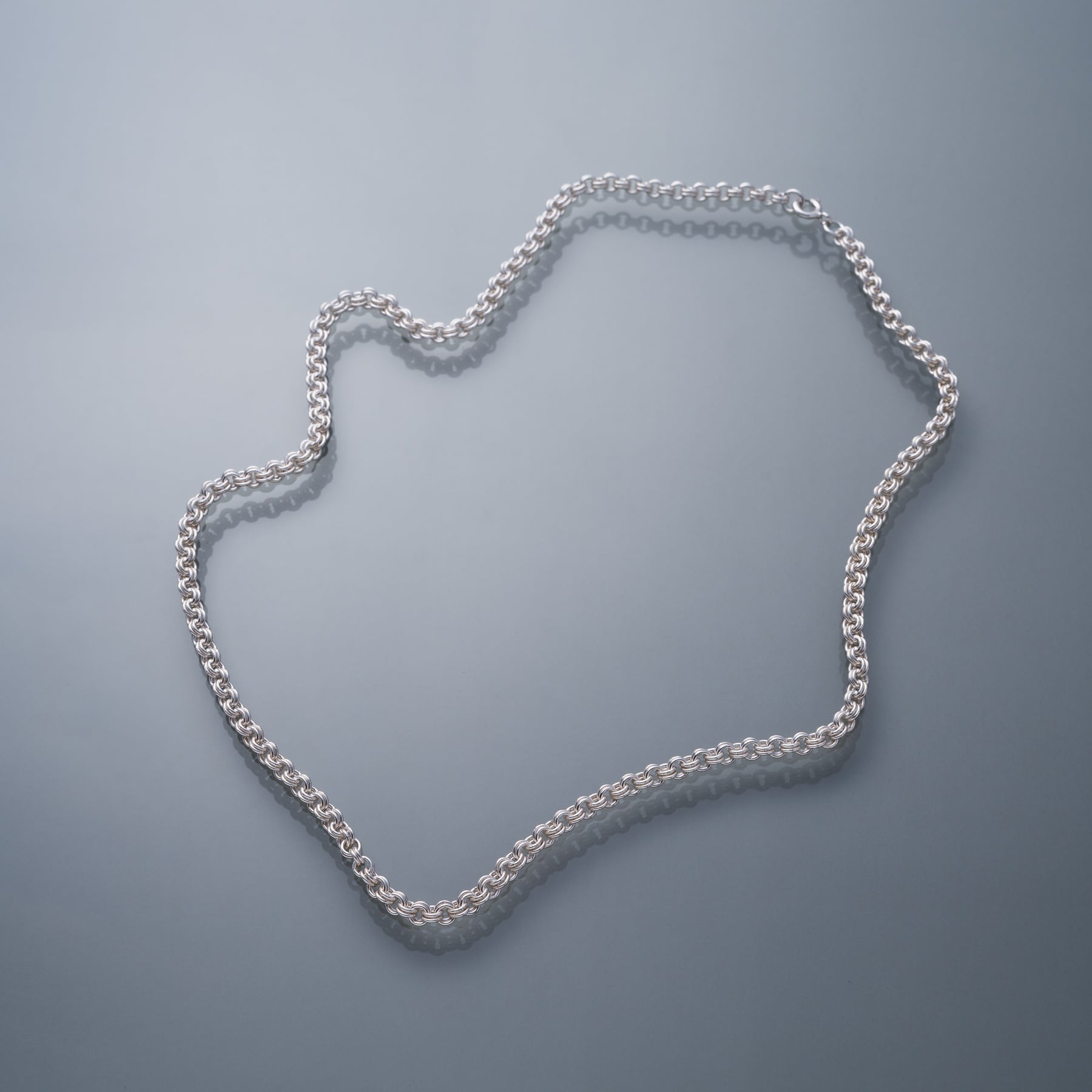 ・緻密に編み込まれた輪が連なり、しなやかな曲線を描くシルバーネックレス