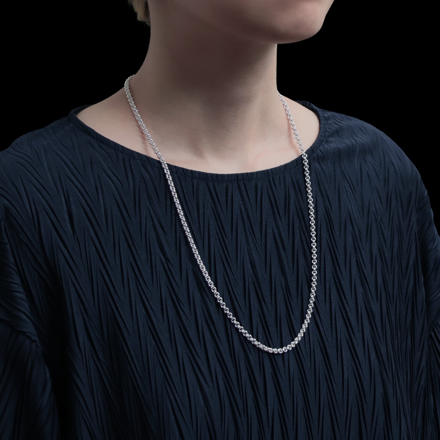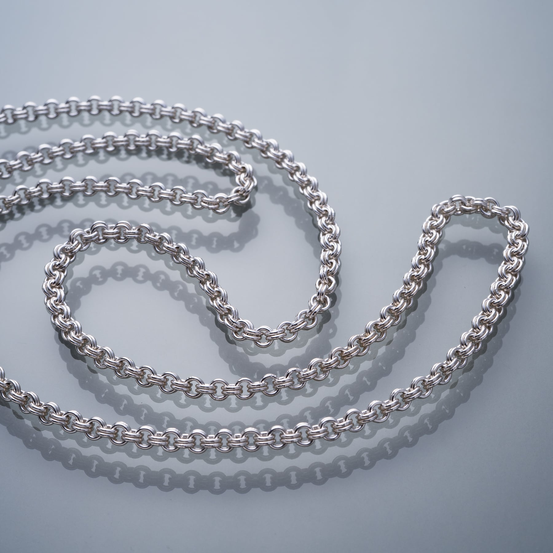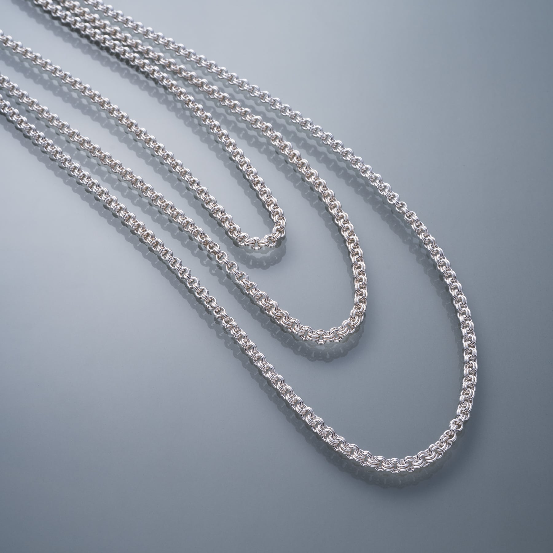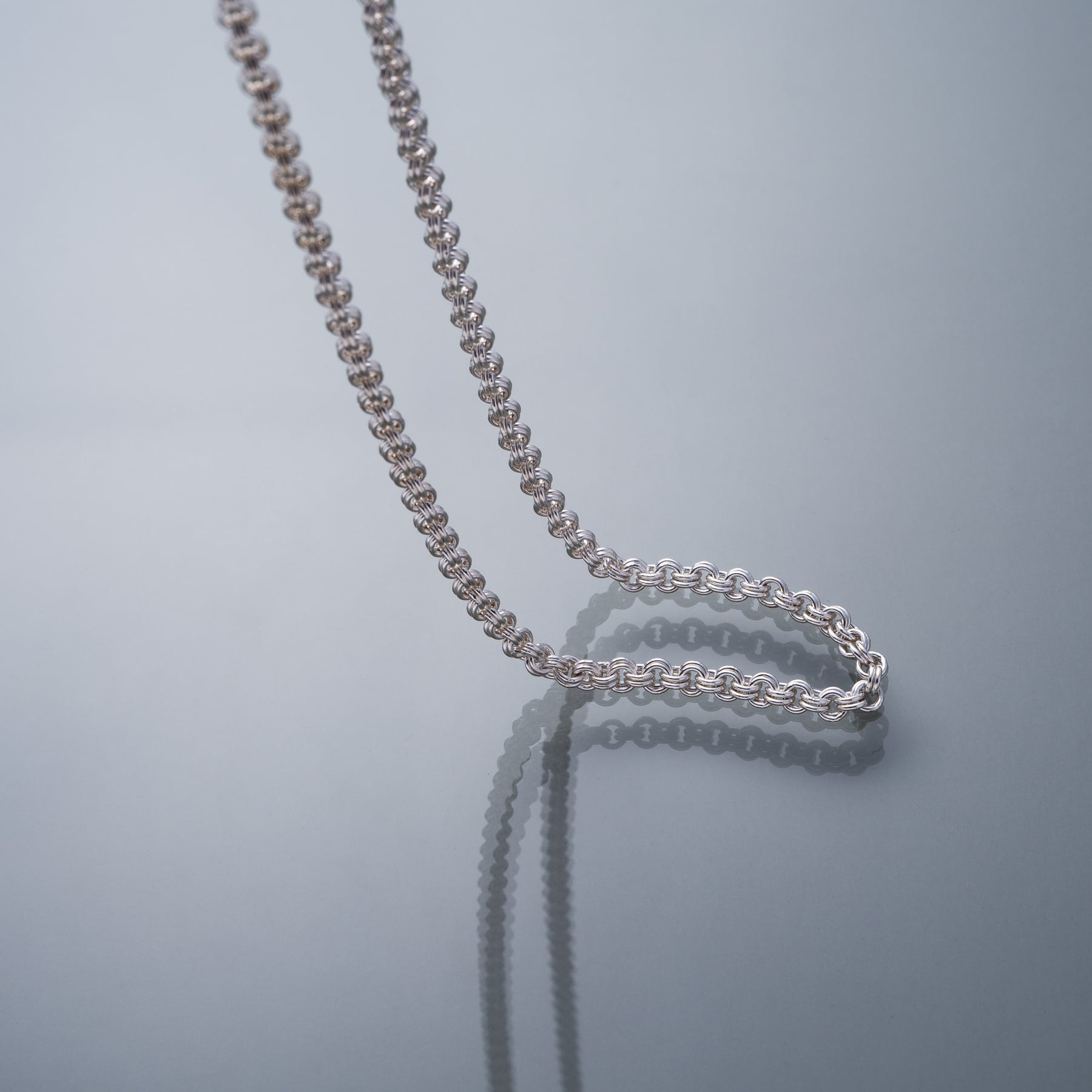 ・緻密に編み込まれた輪が連なり、しなやかな曲線を描くシルバーネックレス