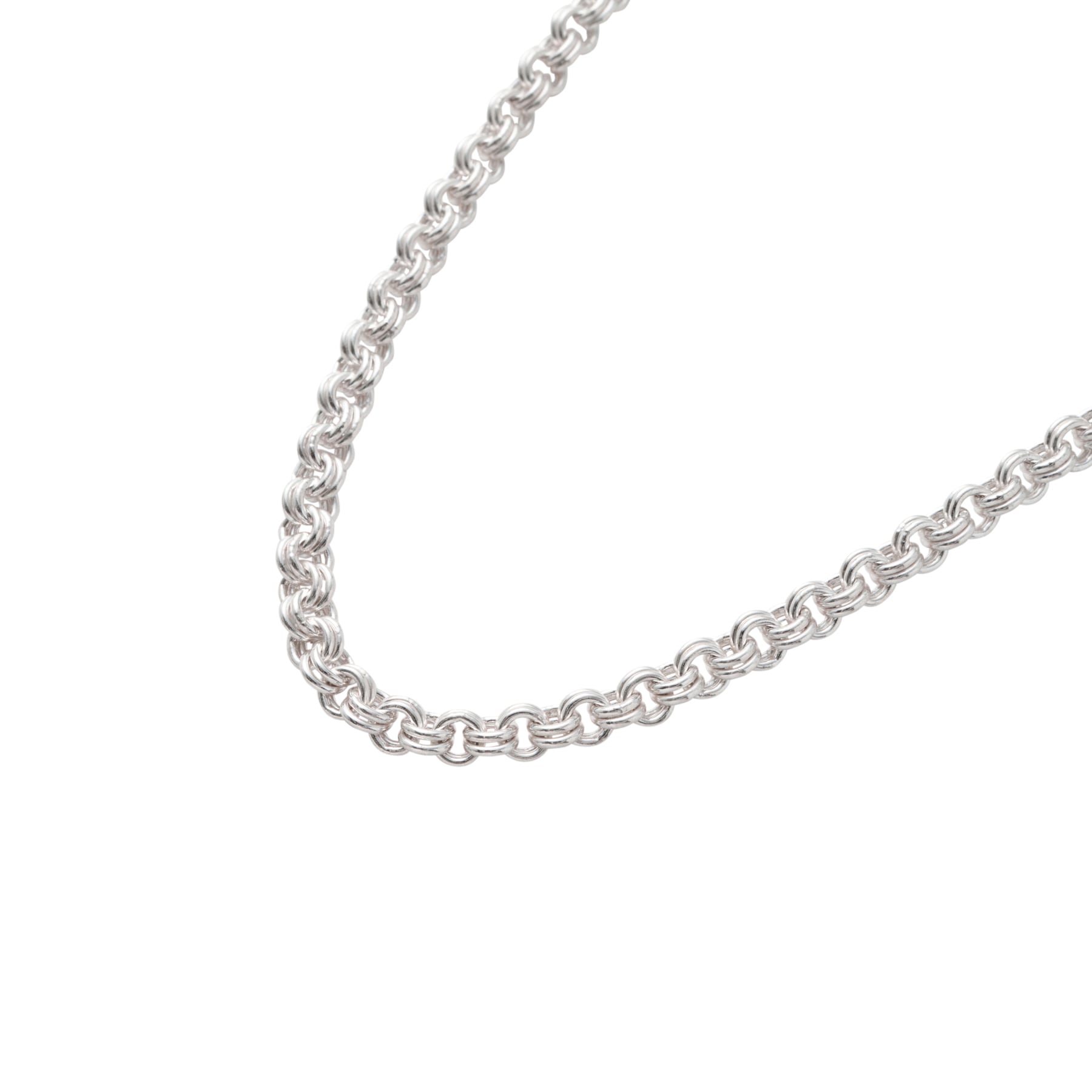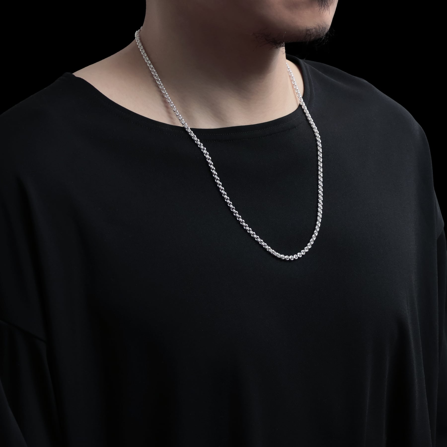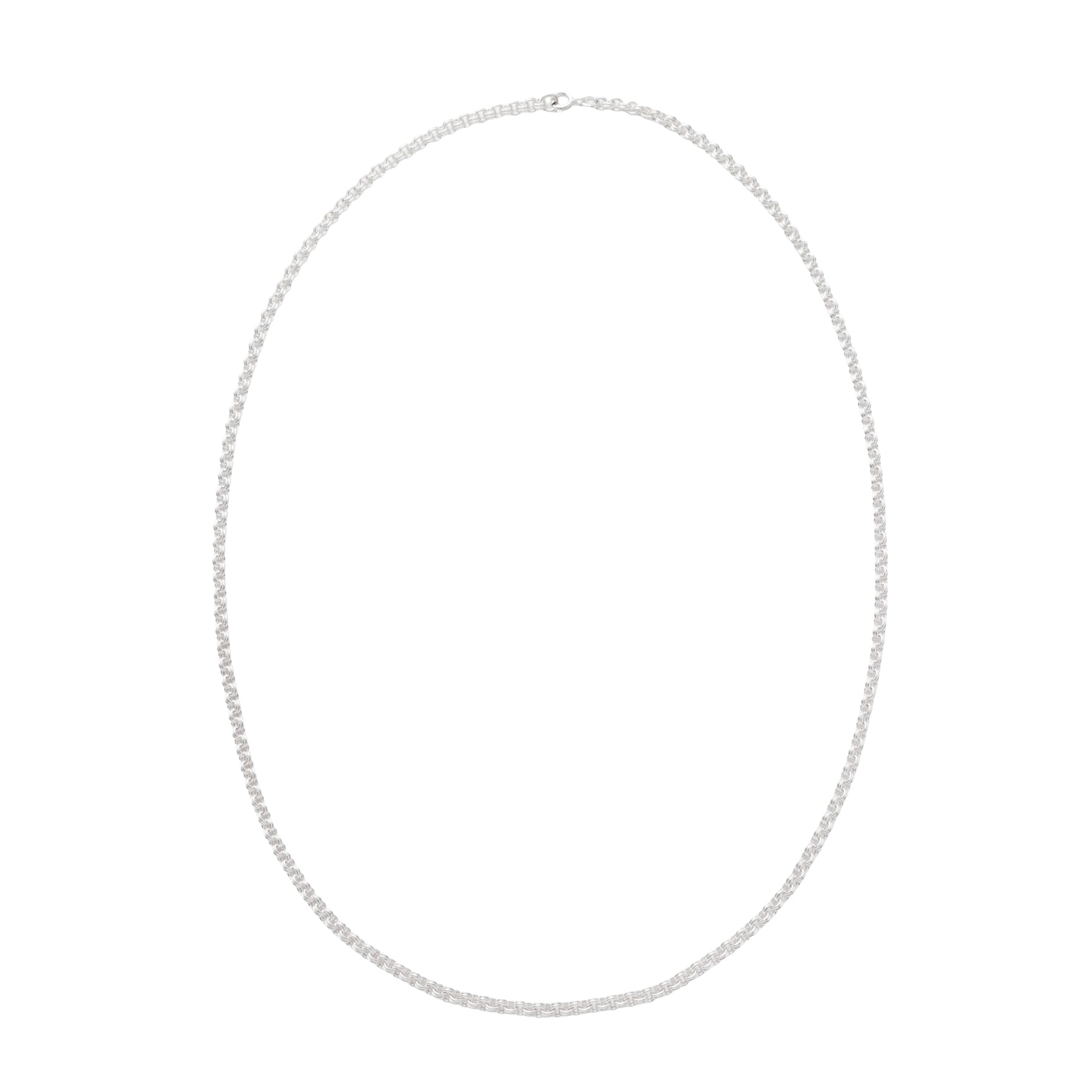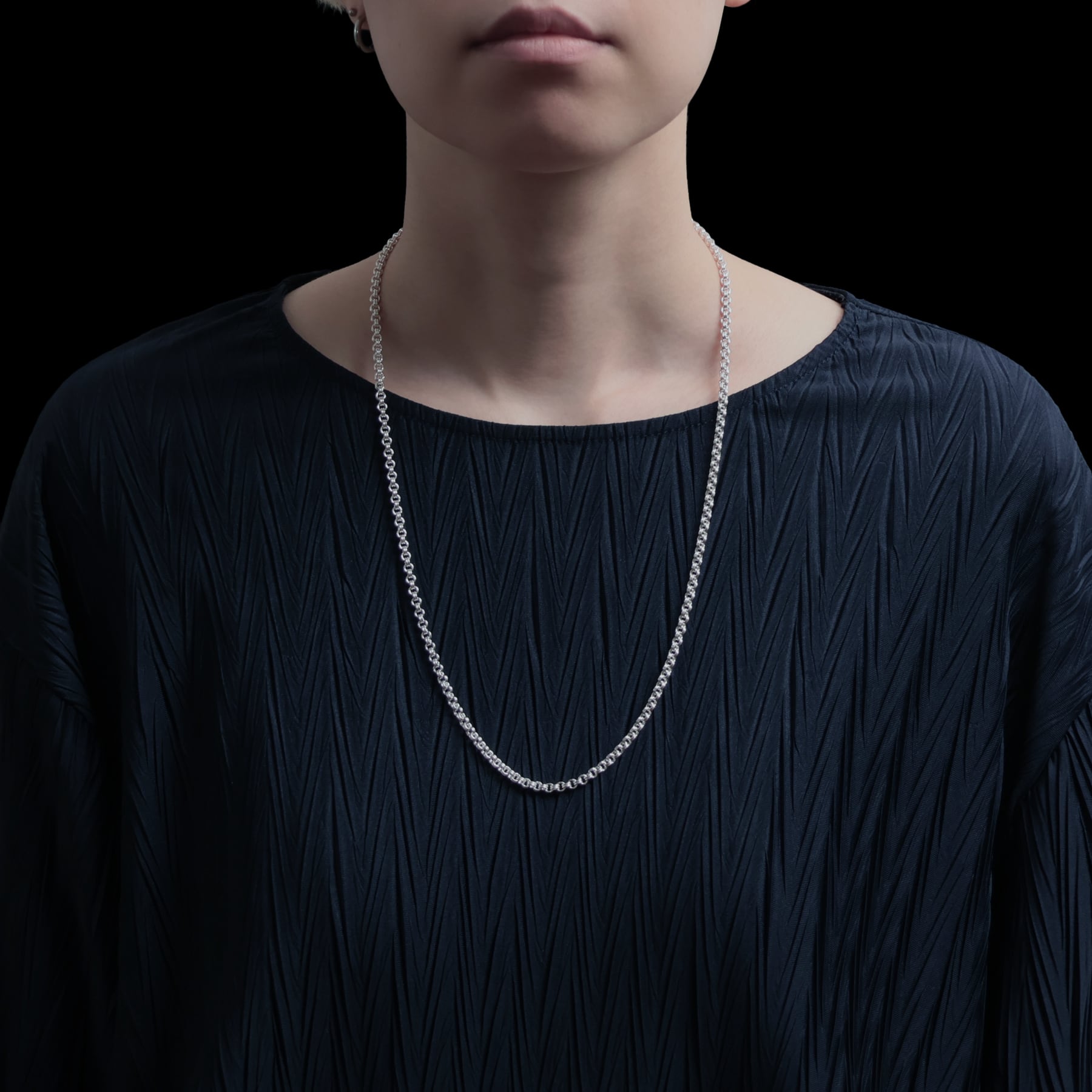 ・緻密に編み込まれた輪が連なり、しなやかな曲線を描くシルバーネックレス