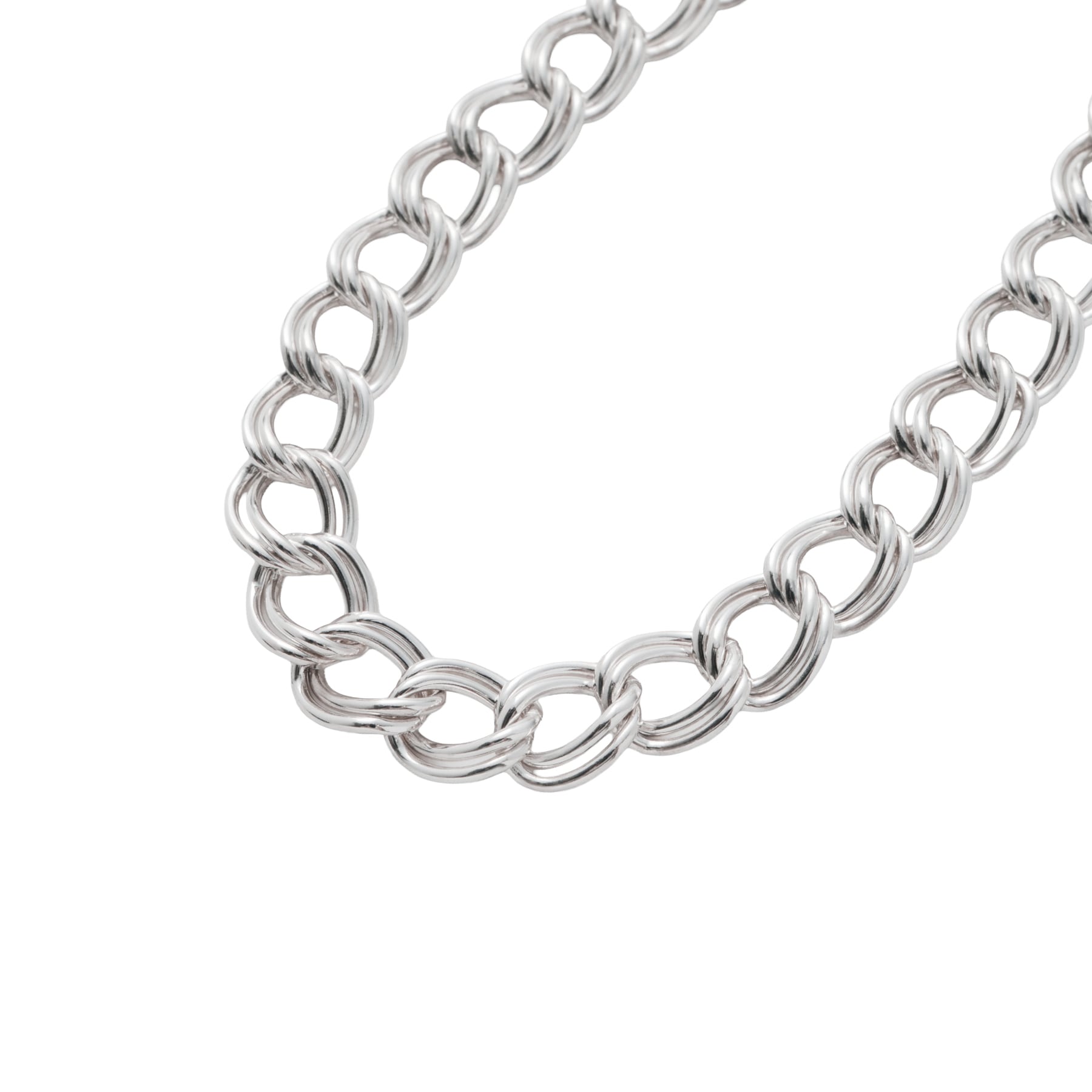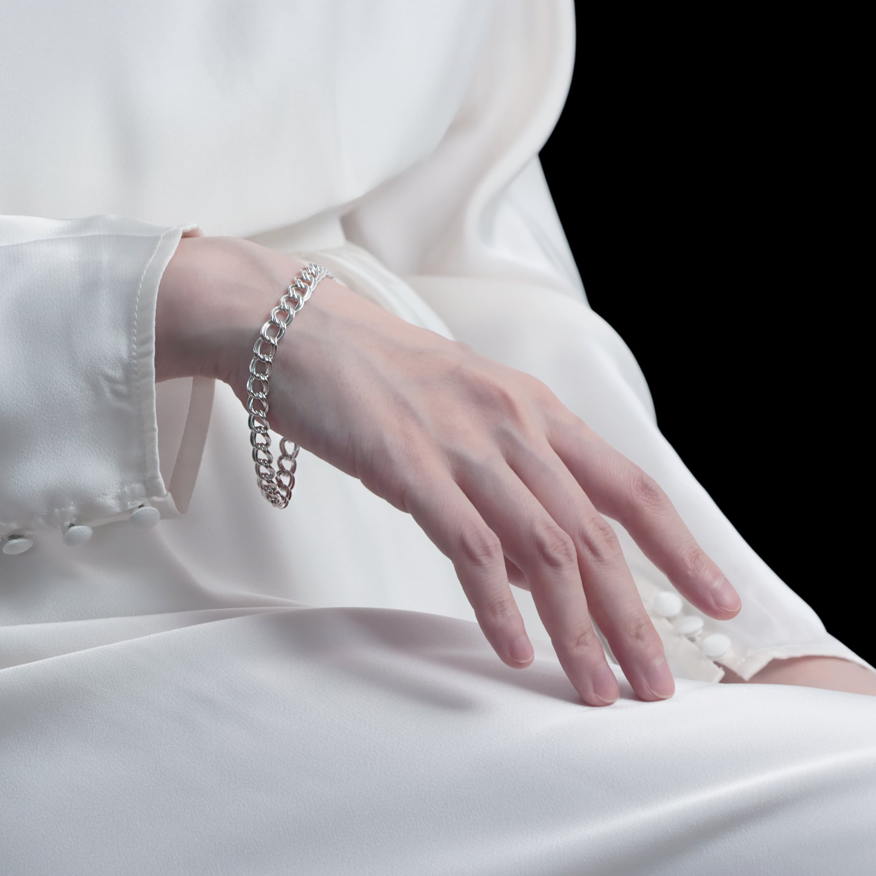 ・緻密に編み込まれた輪が連なり、しなやかな曲線を描くシルバーブレスレット。