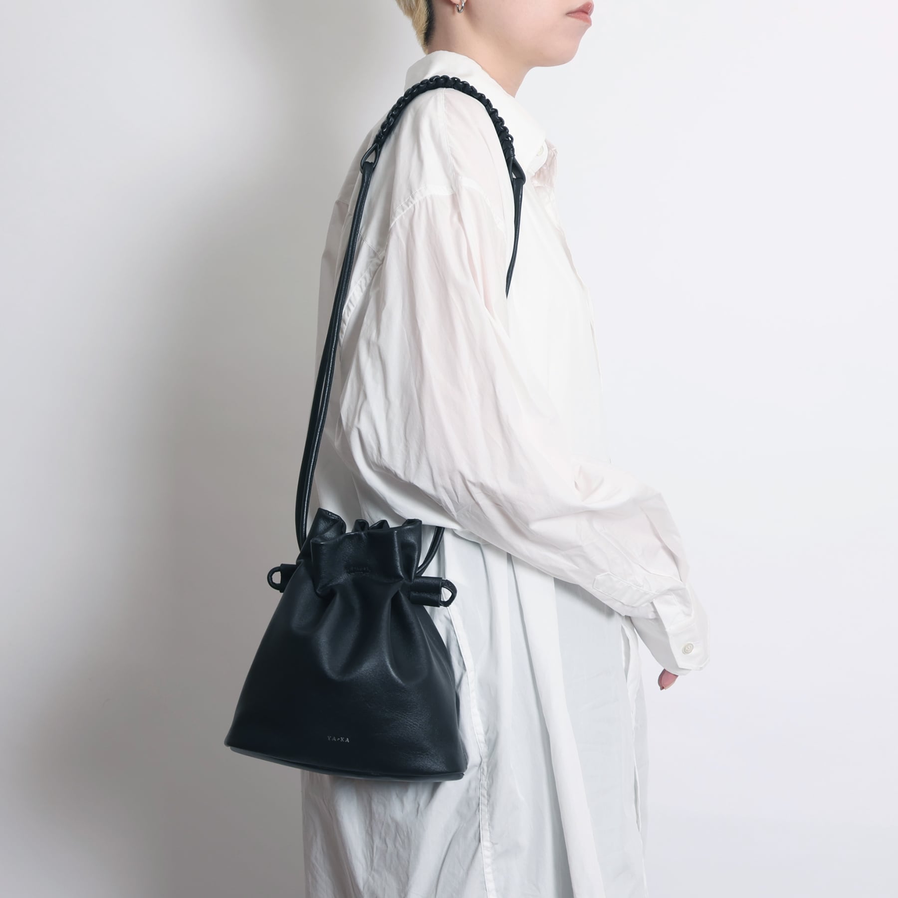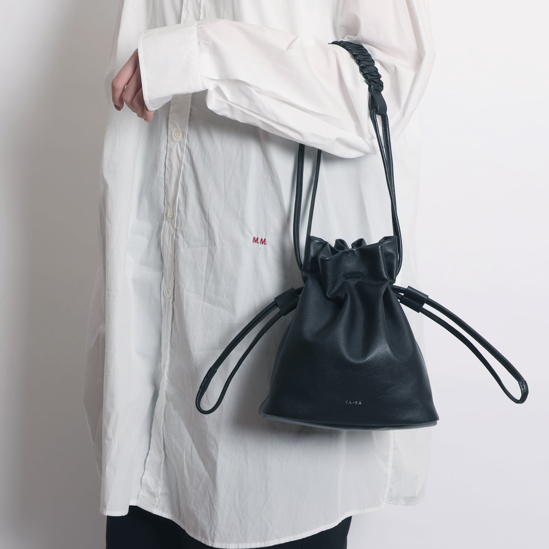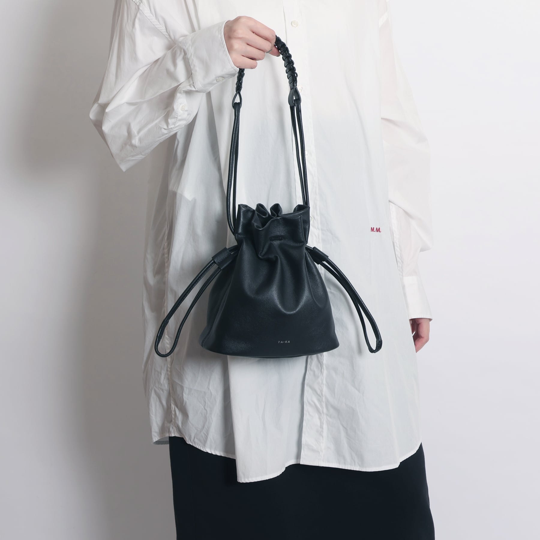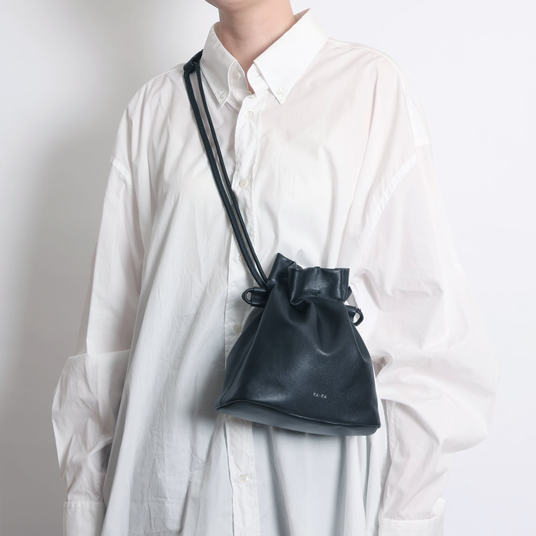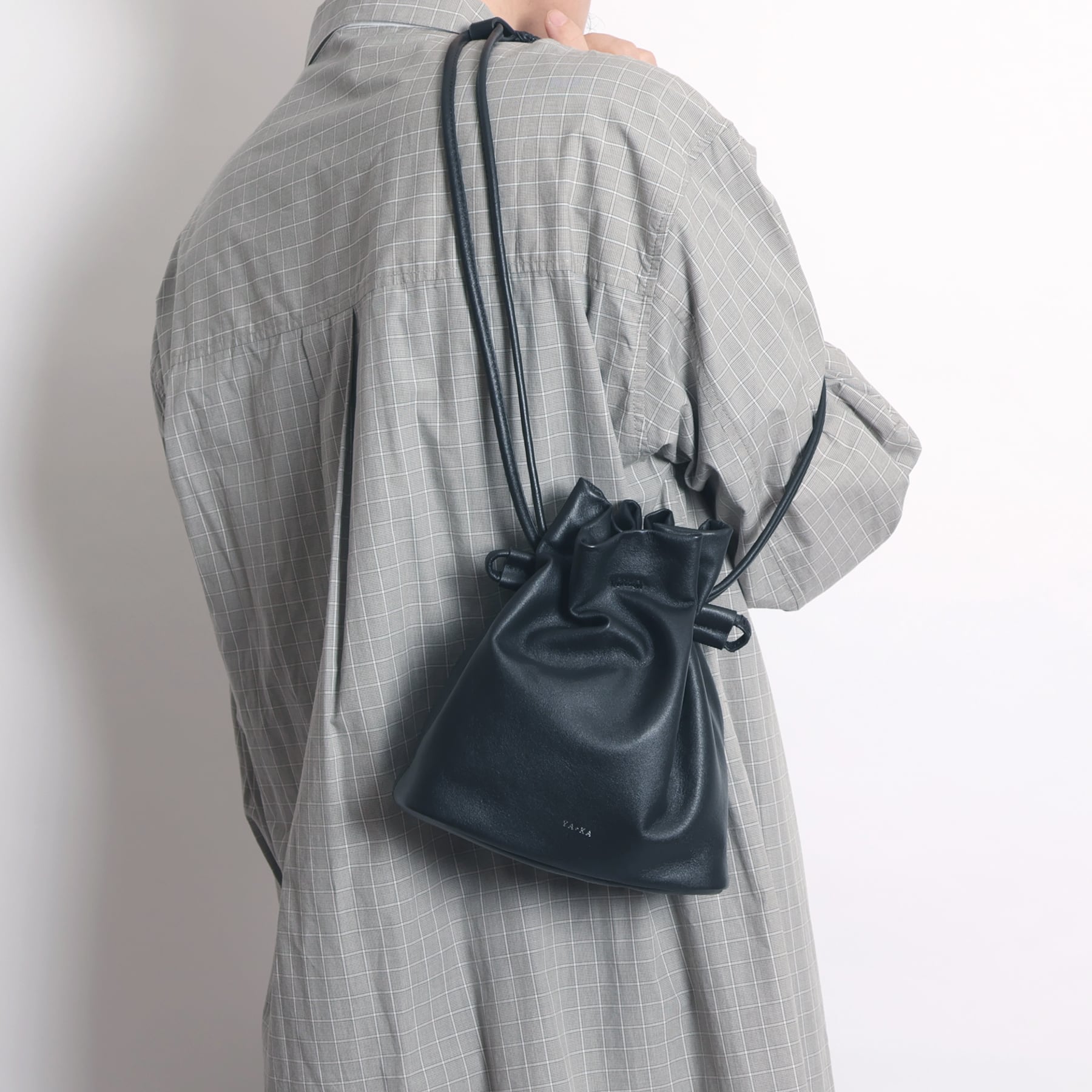 ・レザーの柔らかな質感を生かし、くしゅっとしたドレープ感のある巾着型に仕上げ抜け感を演出したアイテム。
