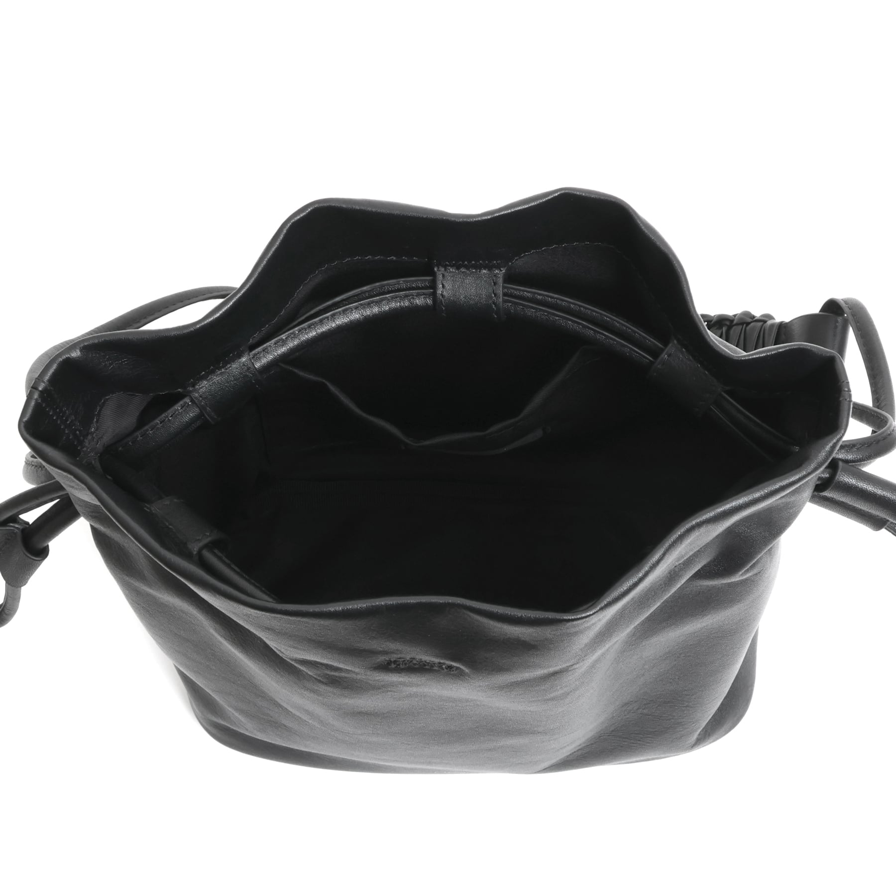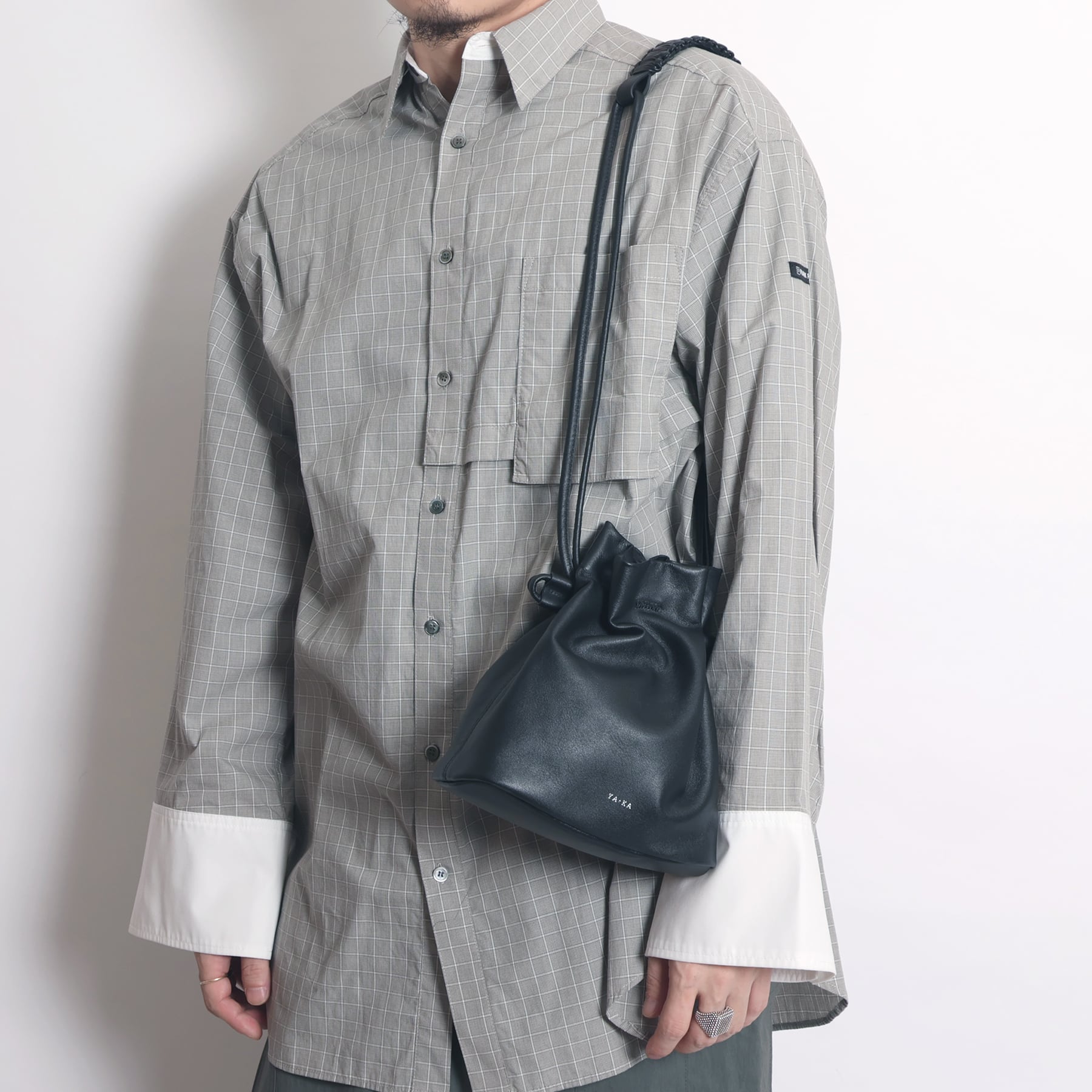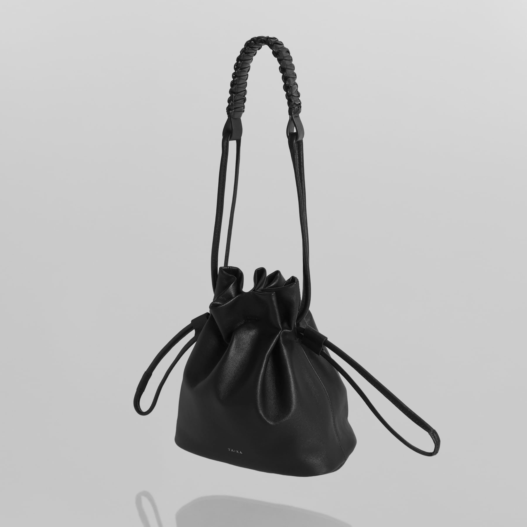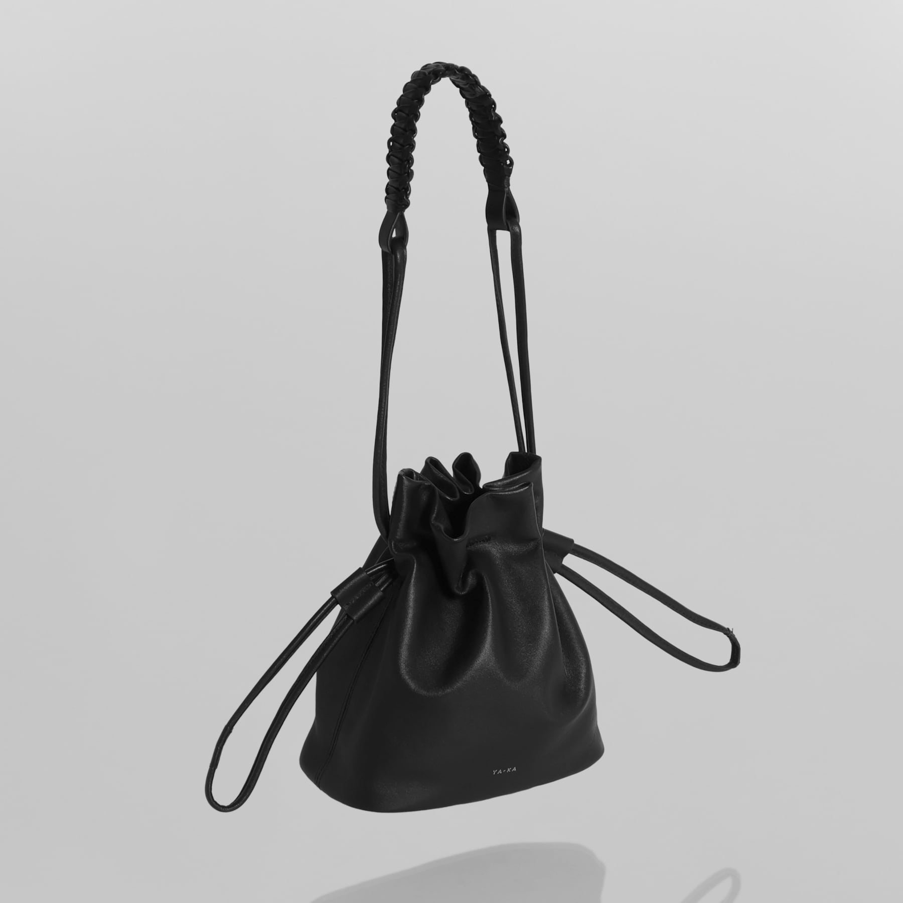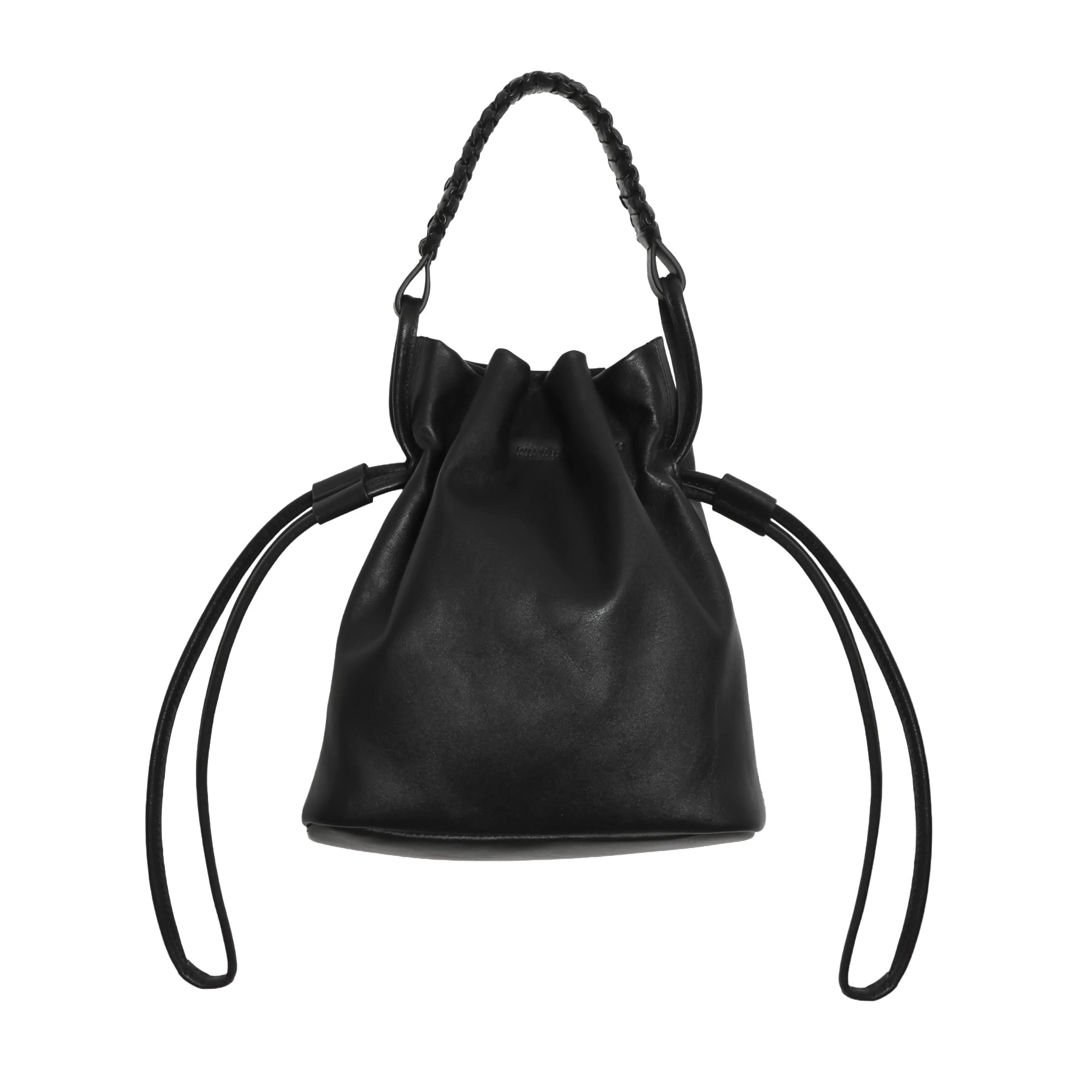 ・レザーの柔らかな質感を生かし、くしゅっとしたドレープ感のある巾着型に仕上げ抜け感を演出したアイテム。