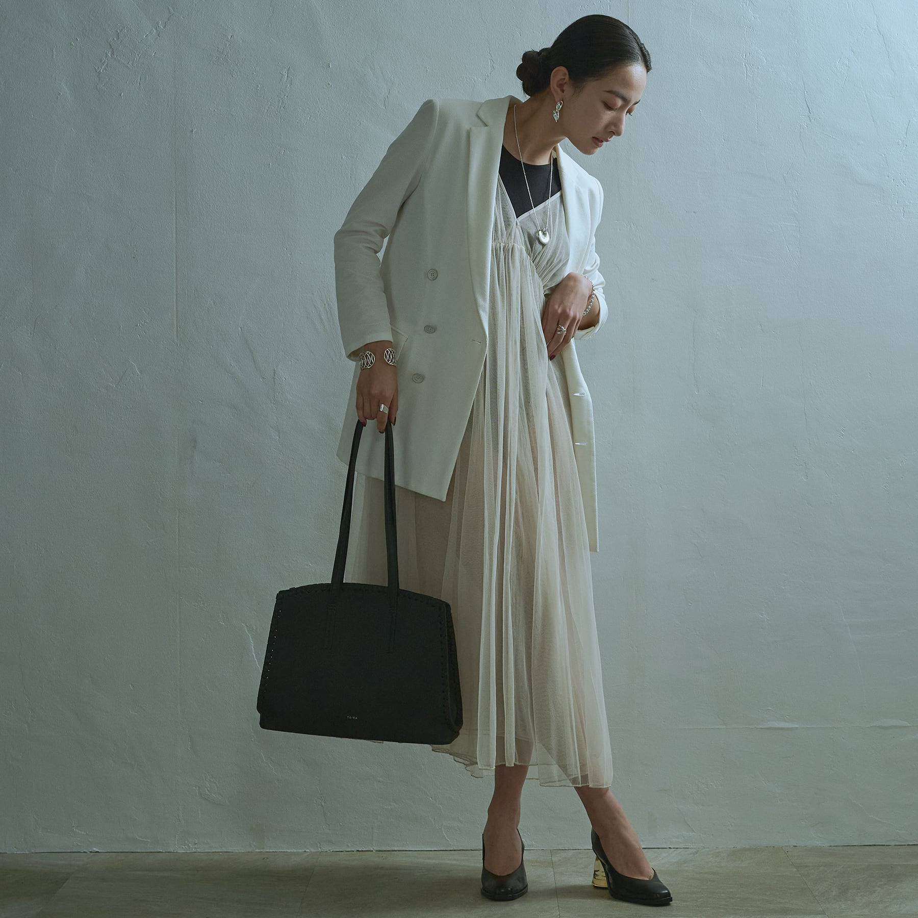 ・サイドをレースアップのようにレザーで縛り巻き上げたディテールがポイント。