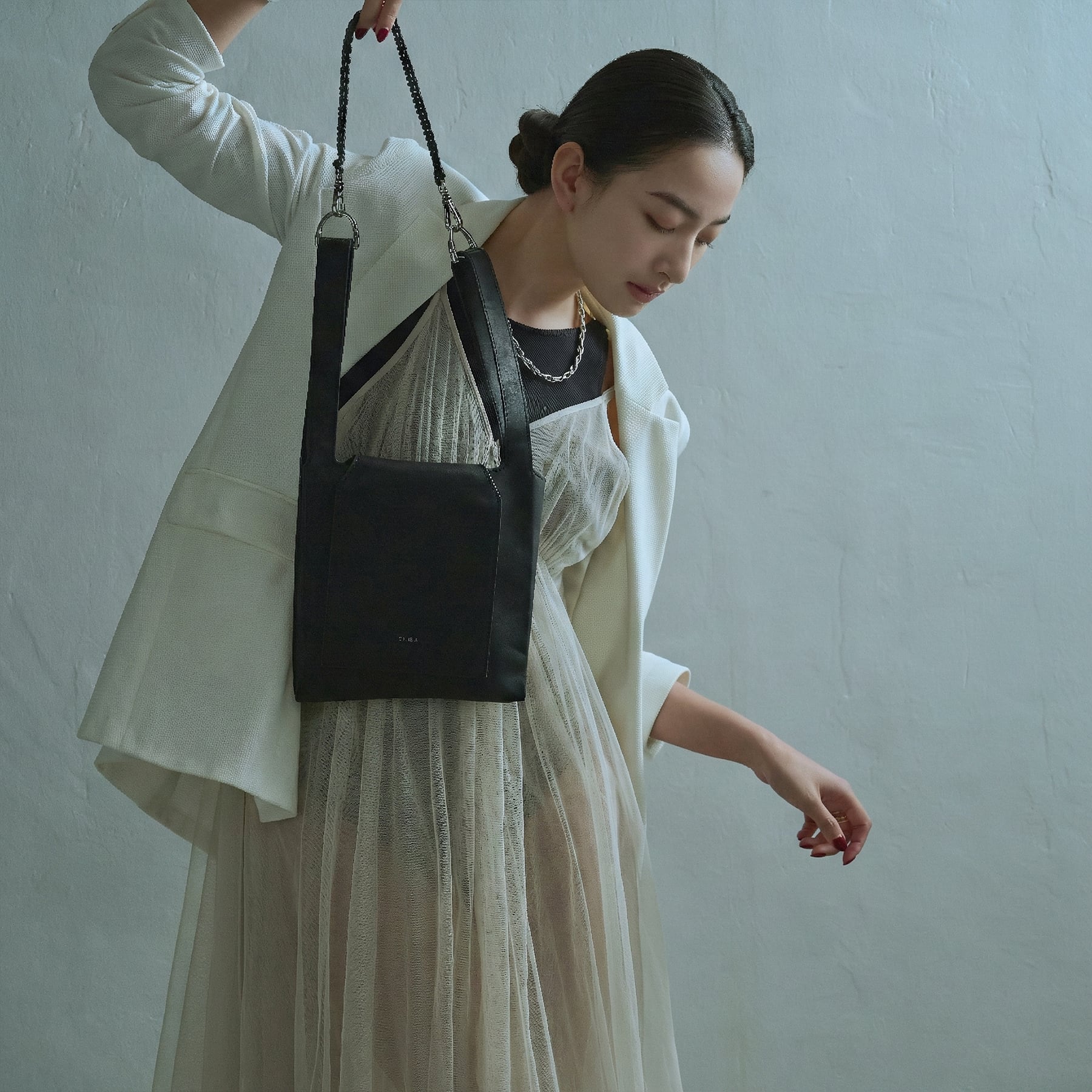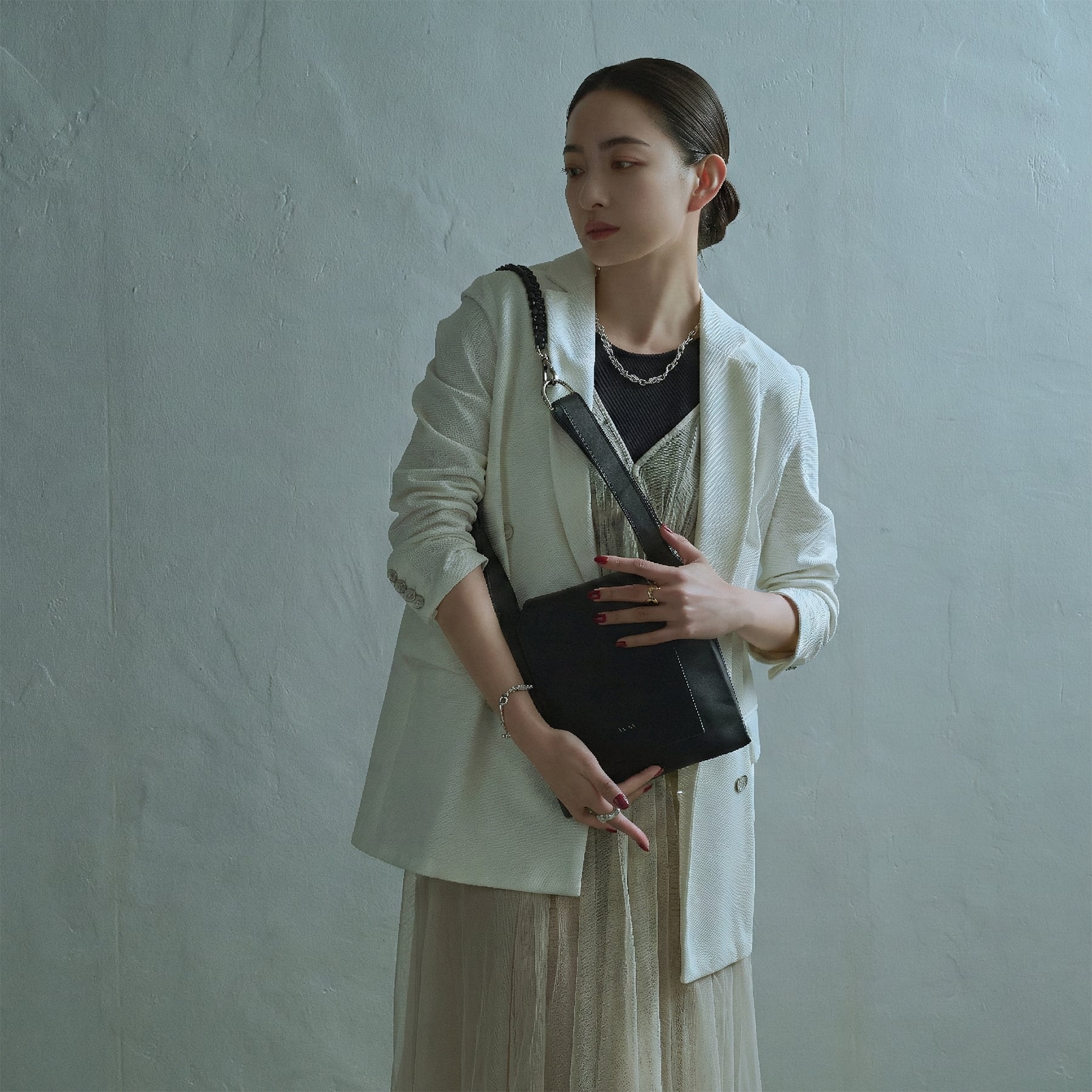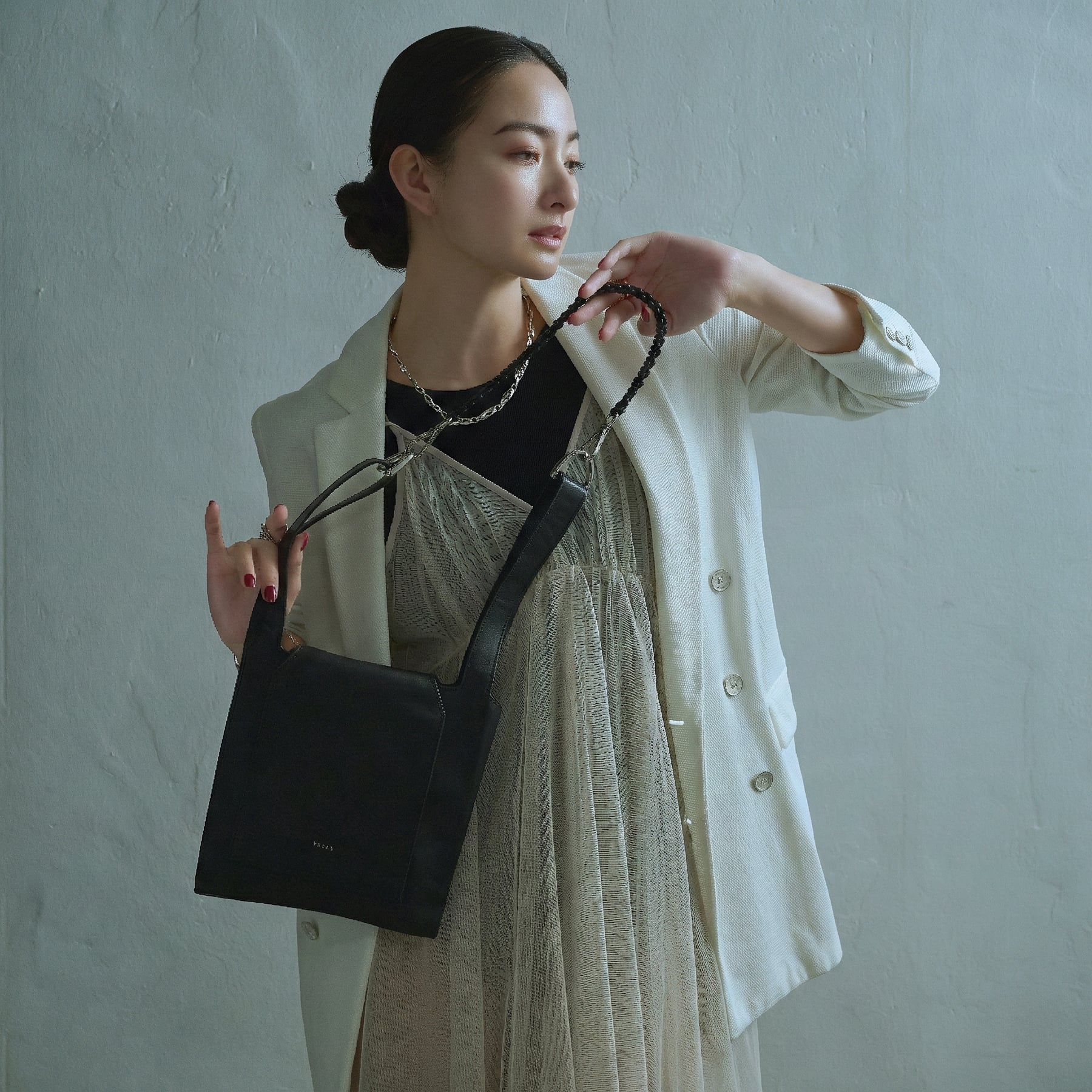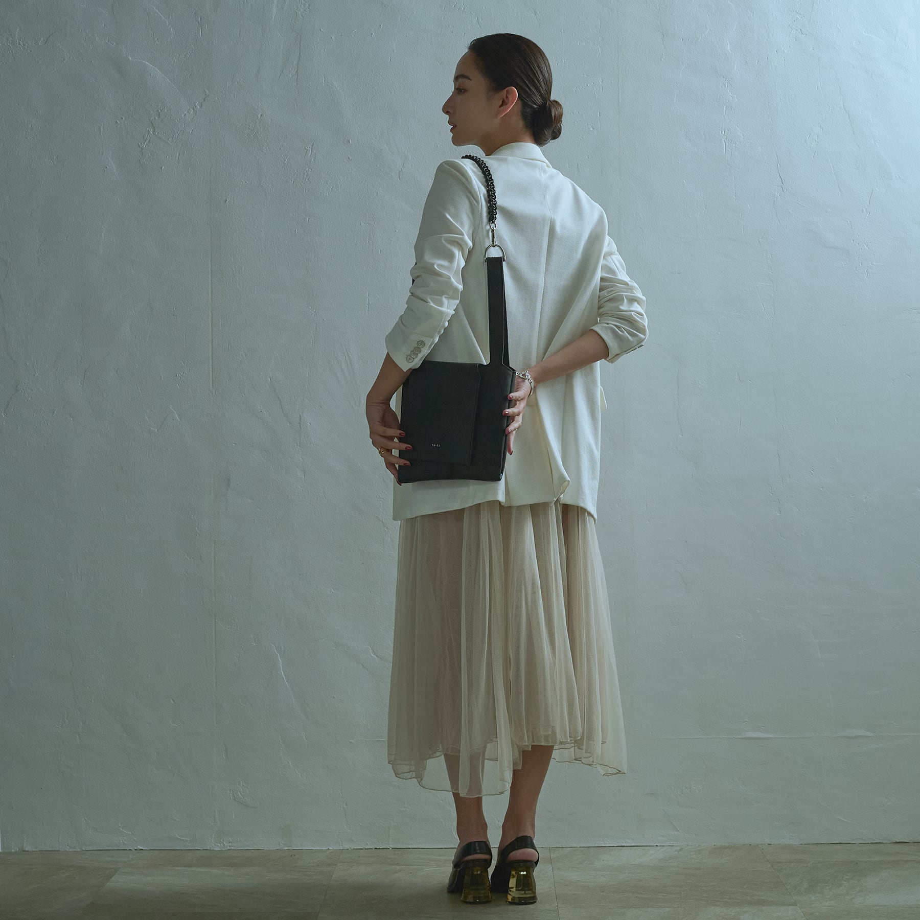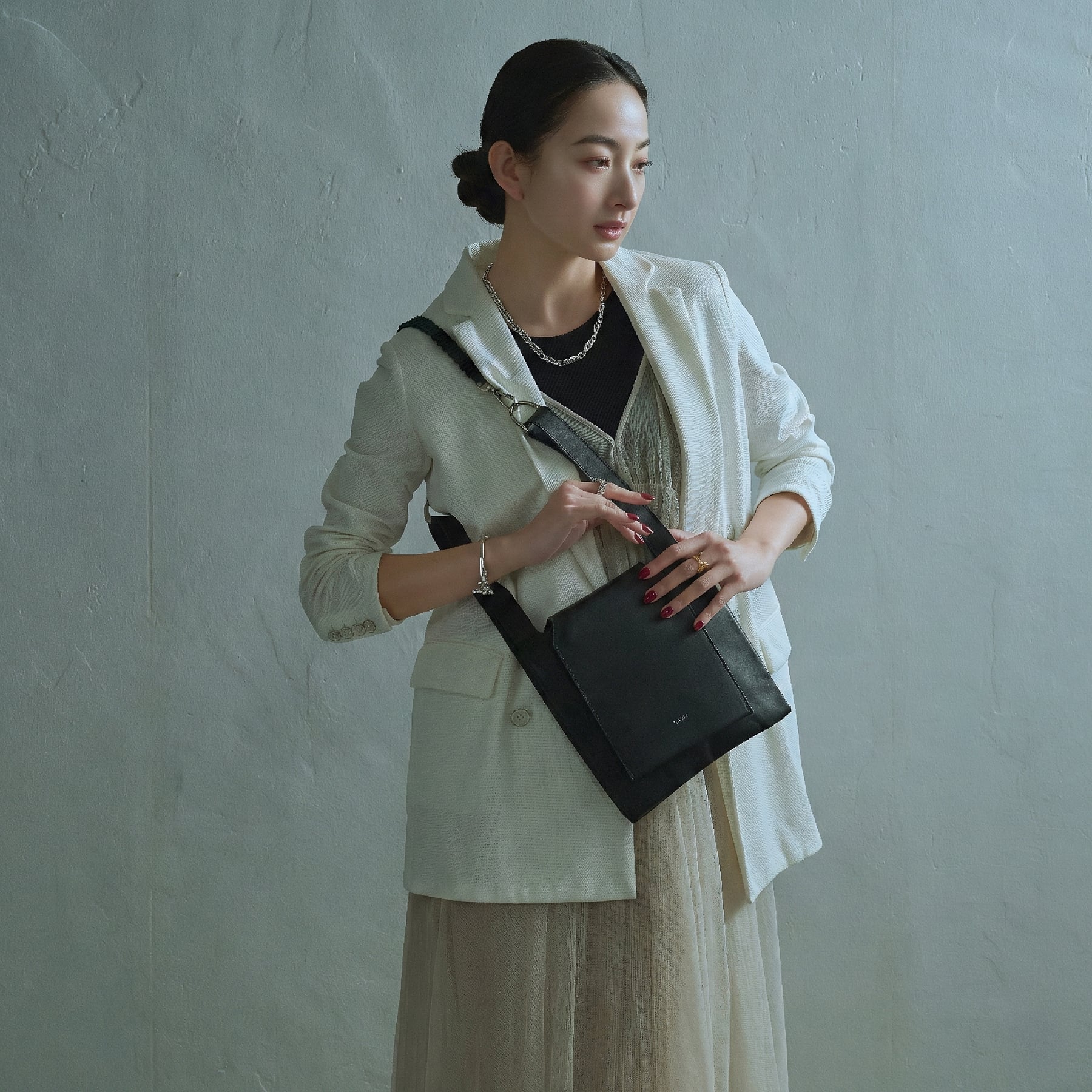 ・YArKAらしいシンプルで柔らかな質感バッグにスクエアフラップを用いてシャープさを混在させたデザインマルシェバッグ。