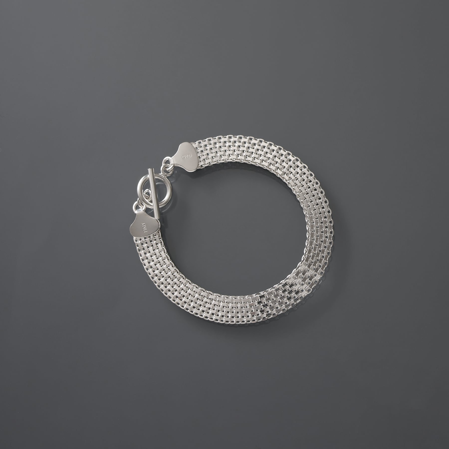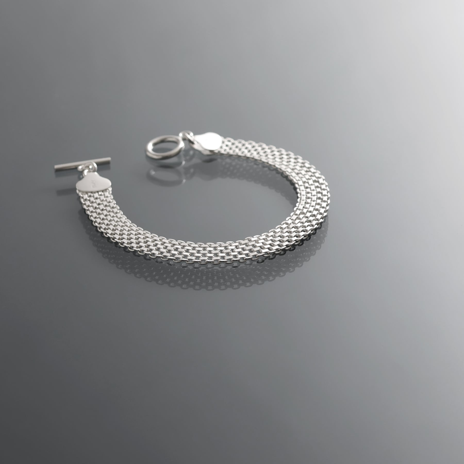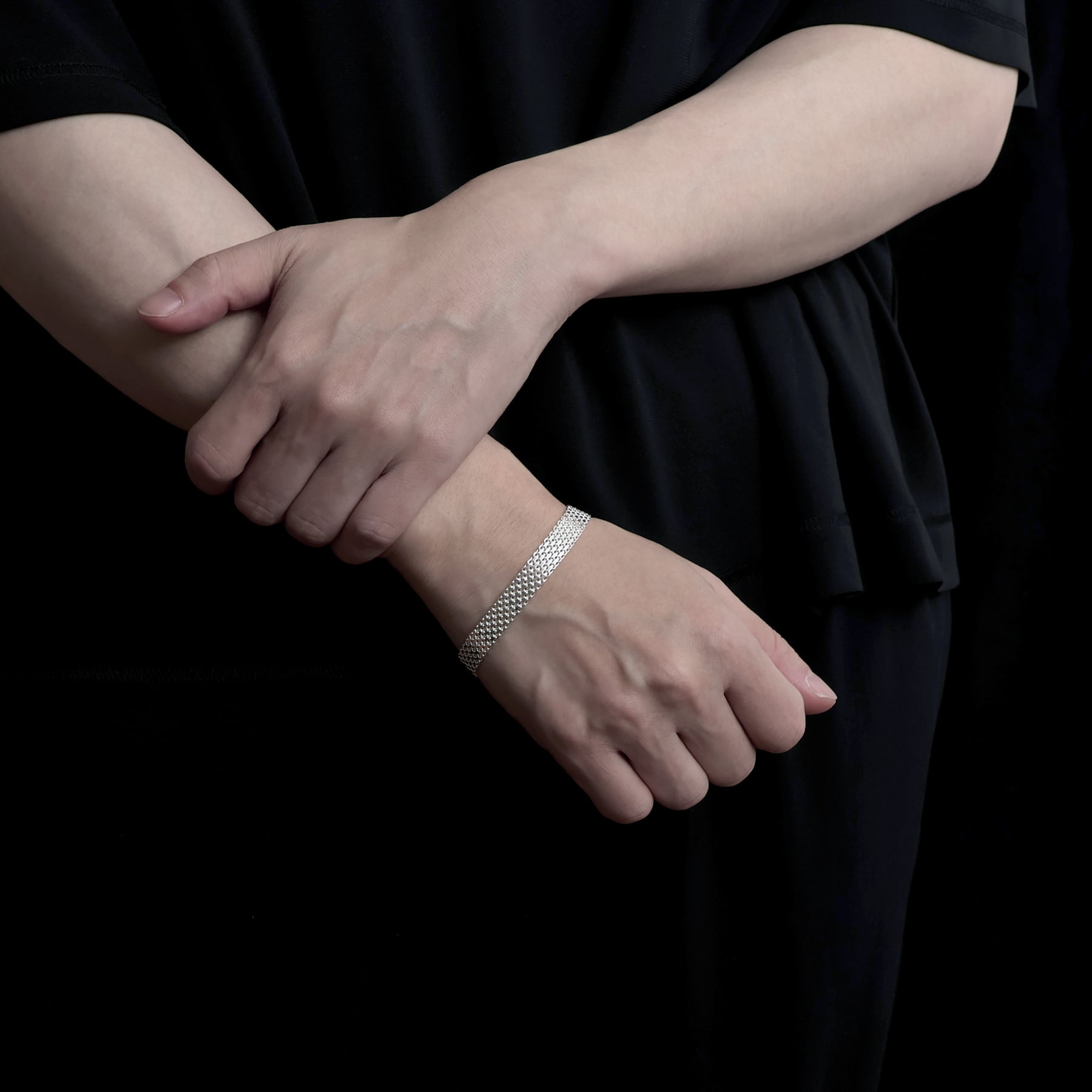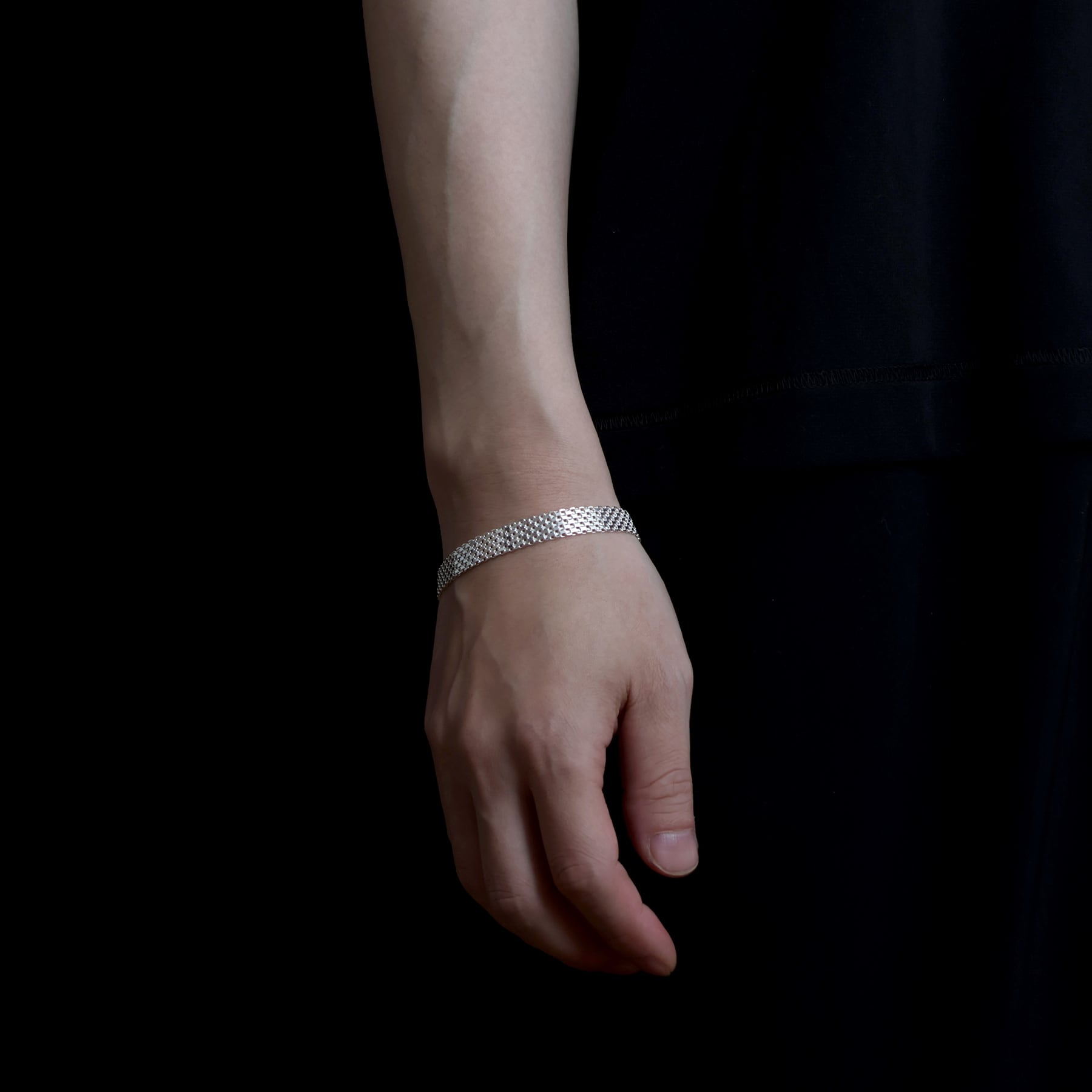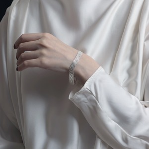 ・緻密に織り込まれた幅広のメッシュ構造を持つチェーンを採用したブレスレット。