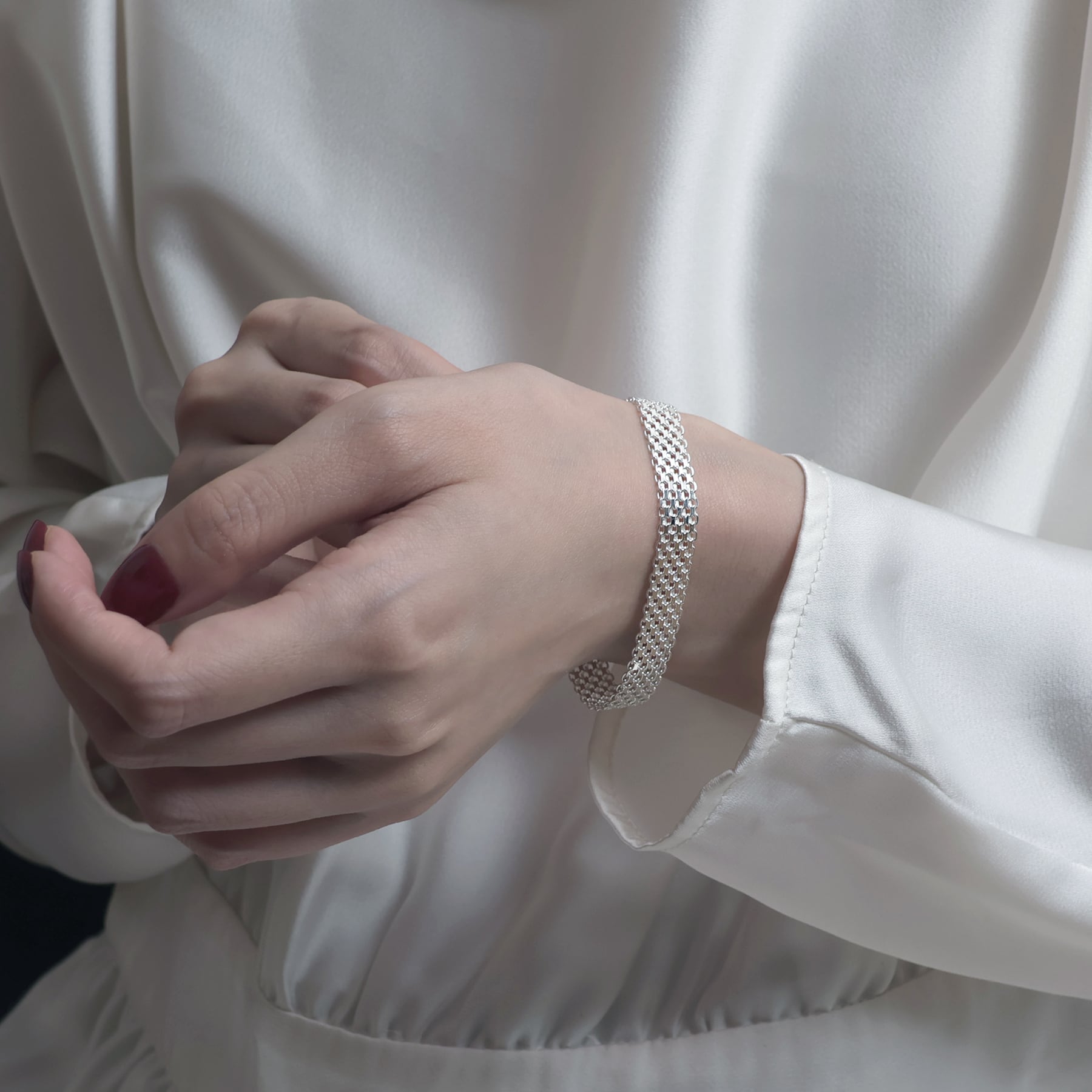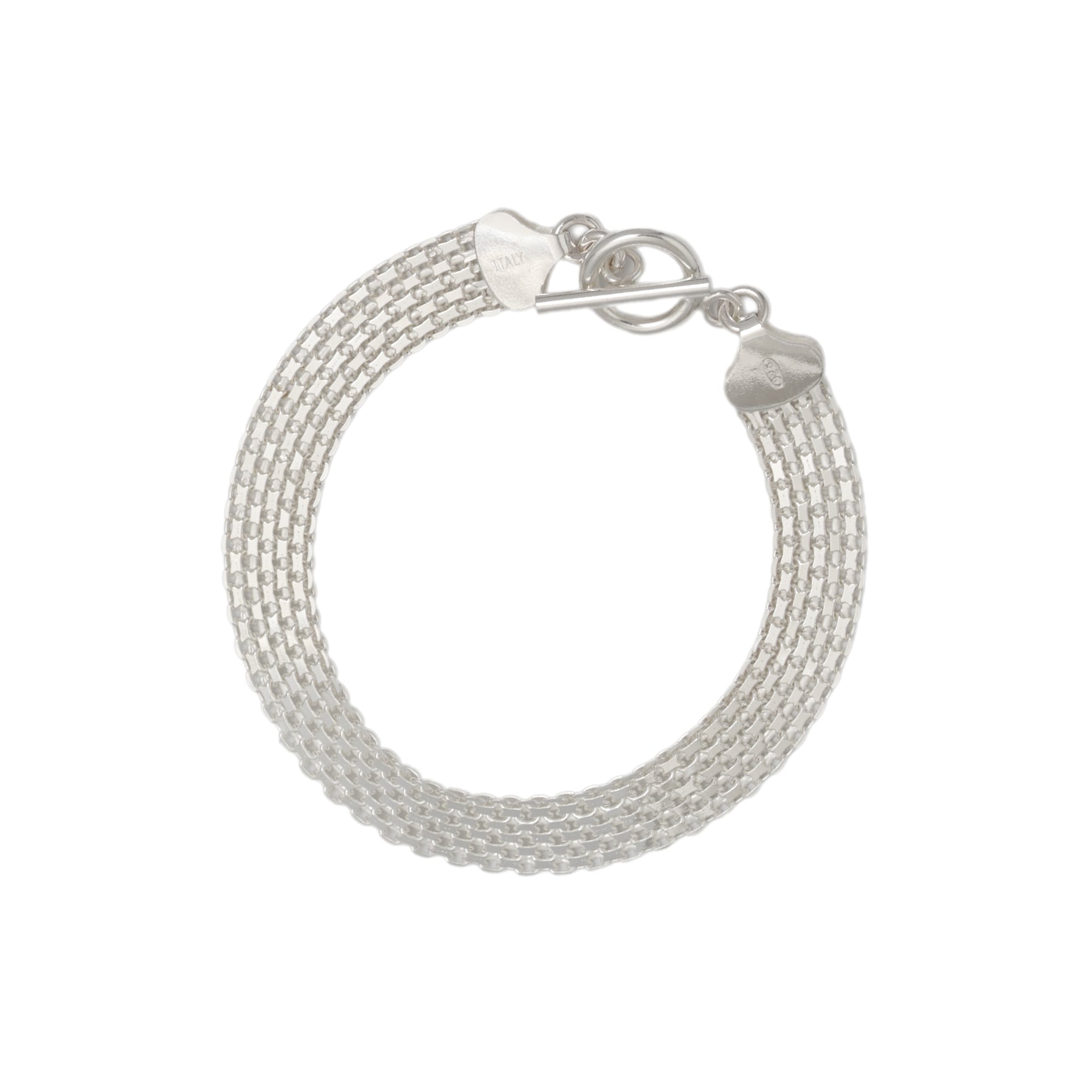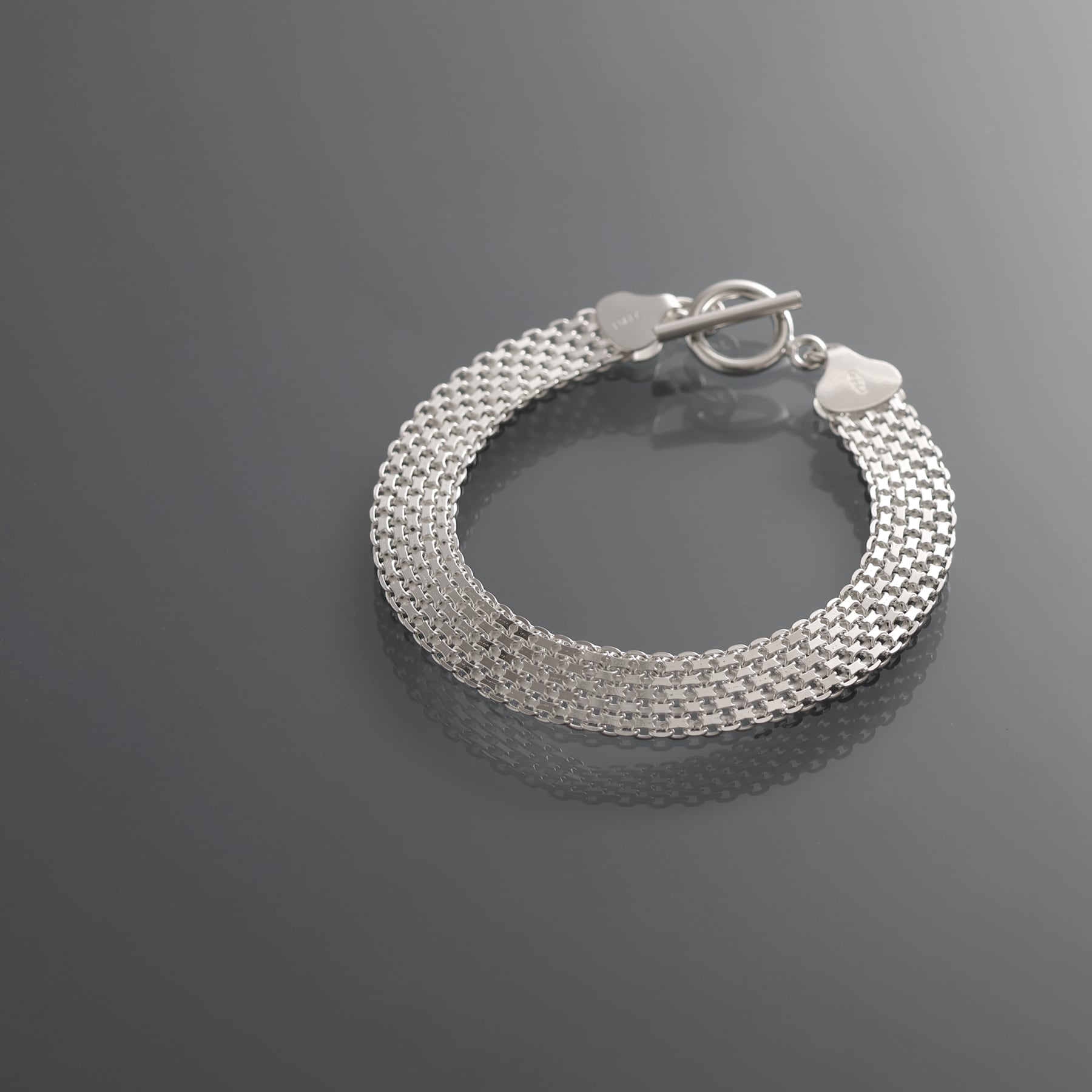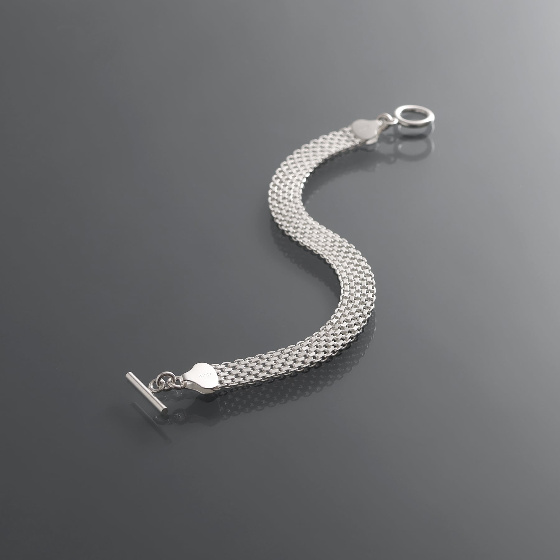 ・緻密に織り込まれた幅広のメッシュ構造を持つチェーンを採用したブレスレット。