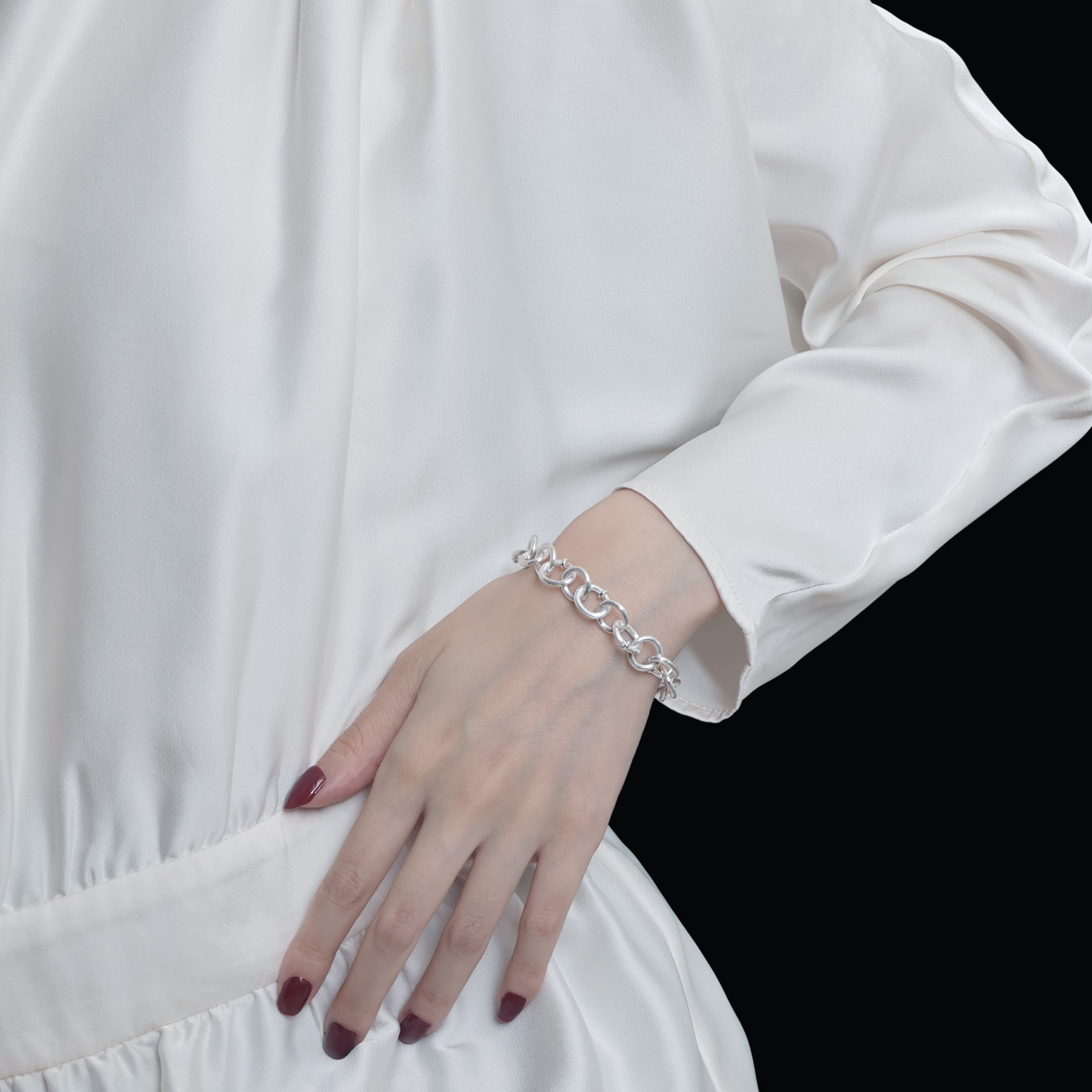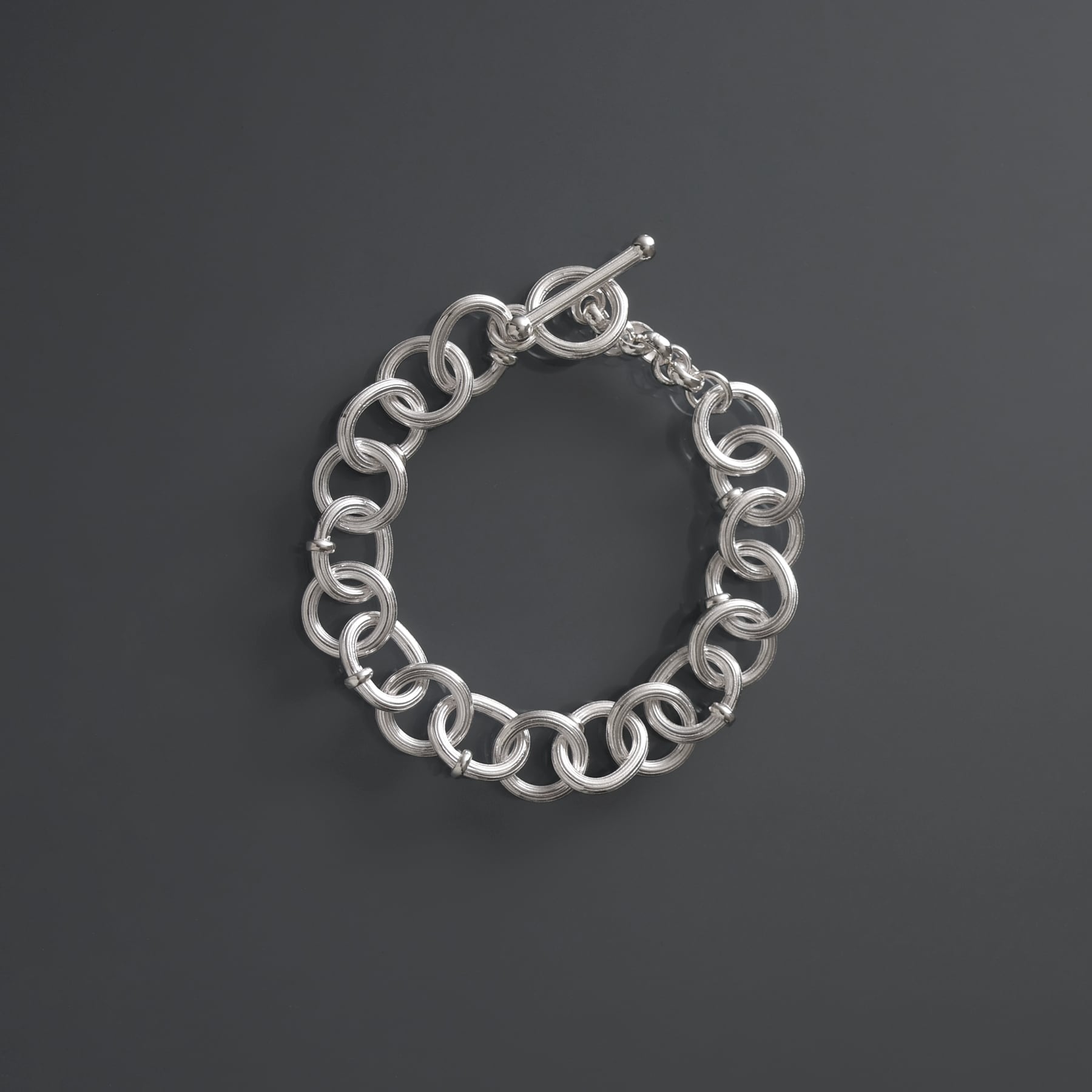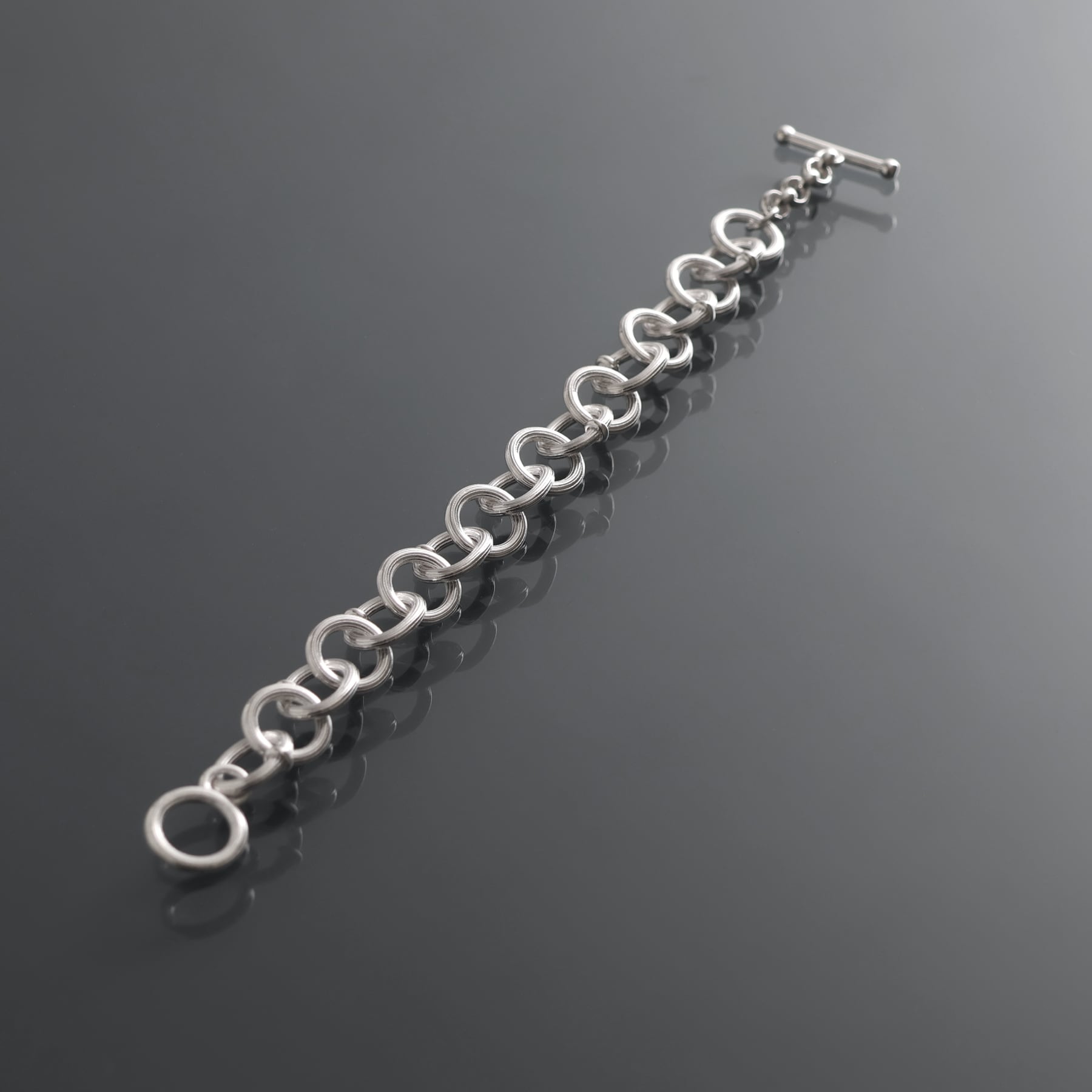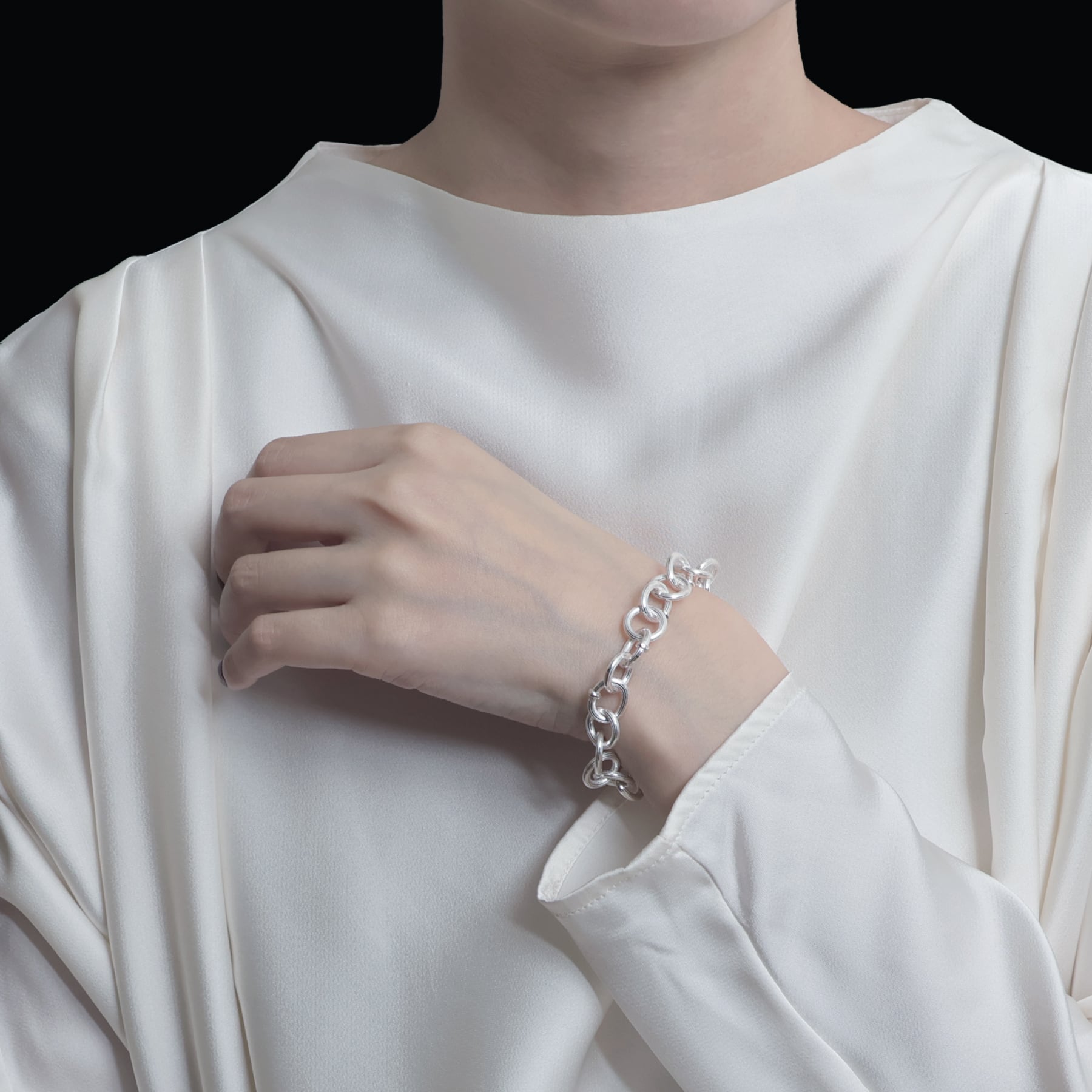 ・円と楕円を交互に繋ぐことで、一定ではないリズムが銀の帯を巻いているかのような、力強く流麗な輝きを生む。