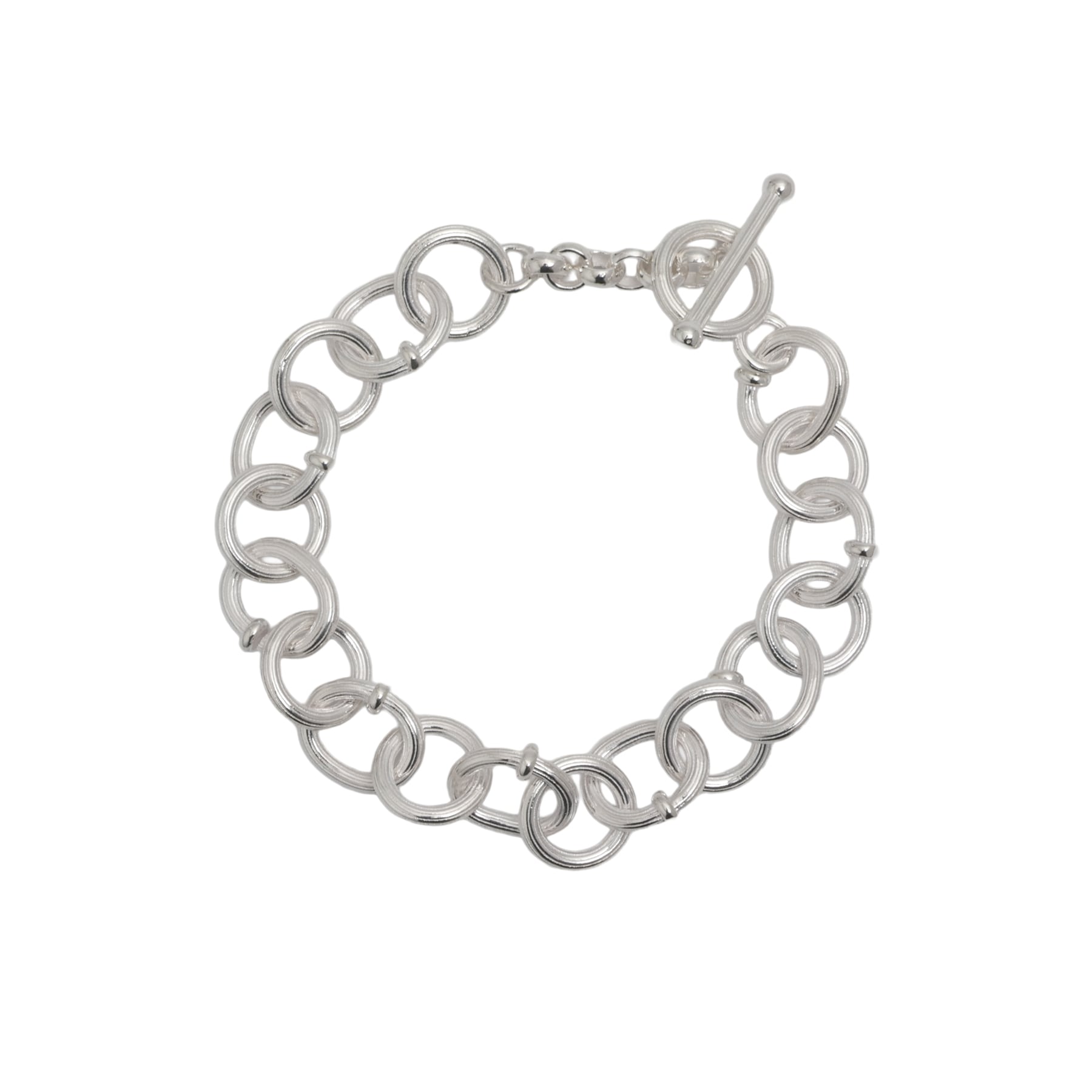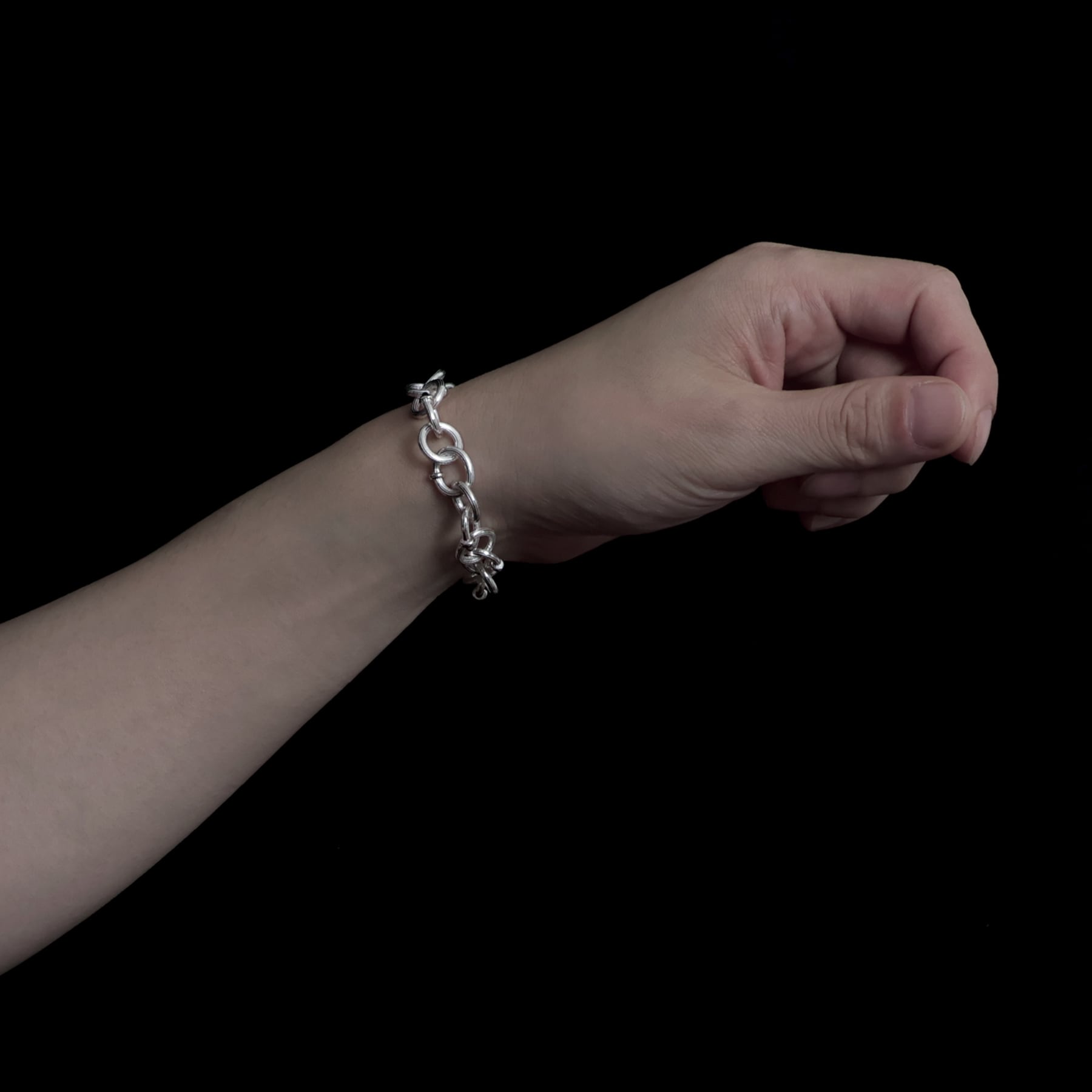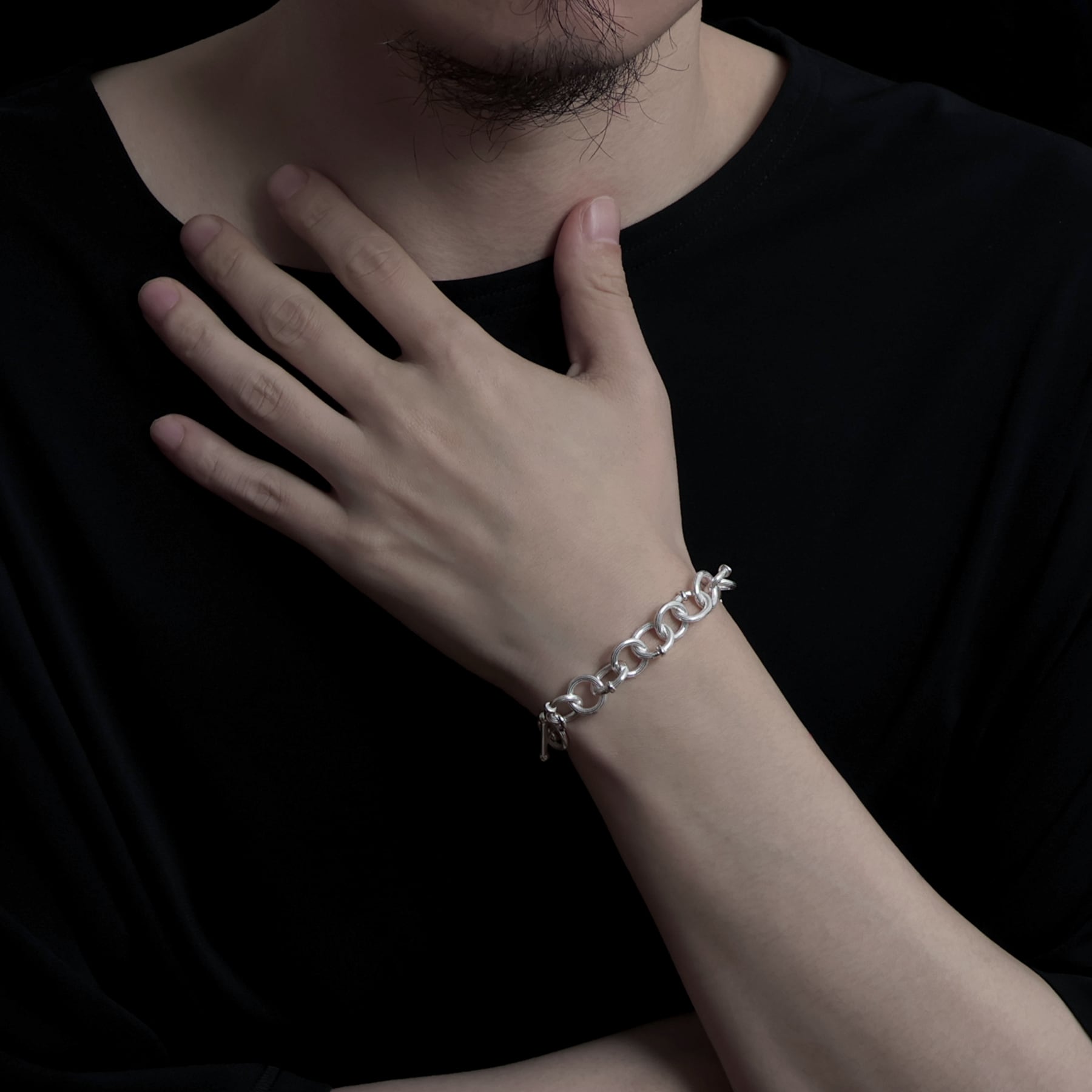 ・円と楕円を交互に繋ぐことで、一定ではないリズムが銀の帯を巻いているかのような、力強く流麗な輝きを生む。