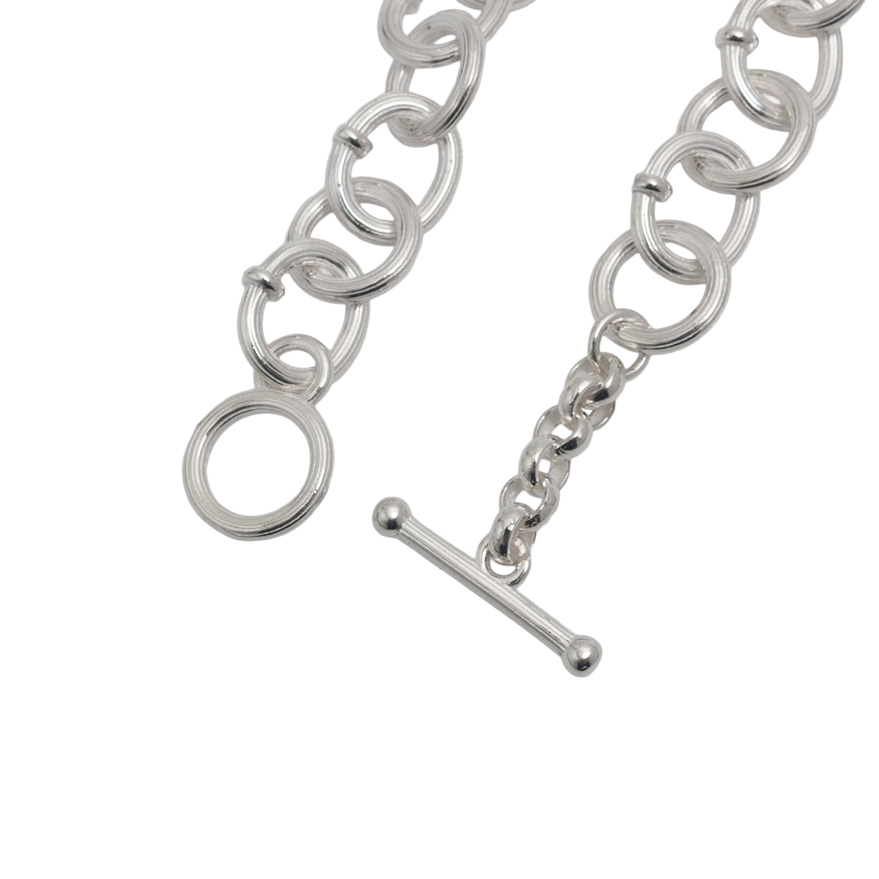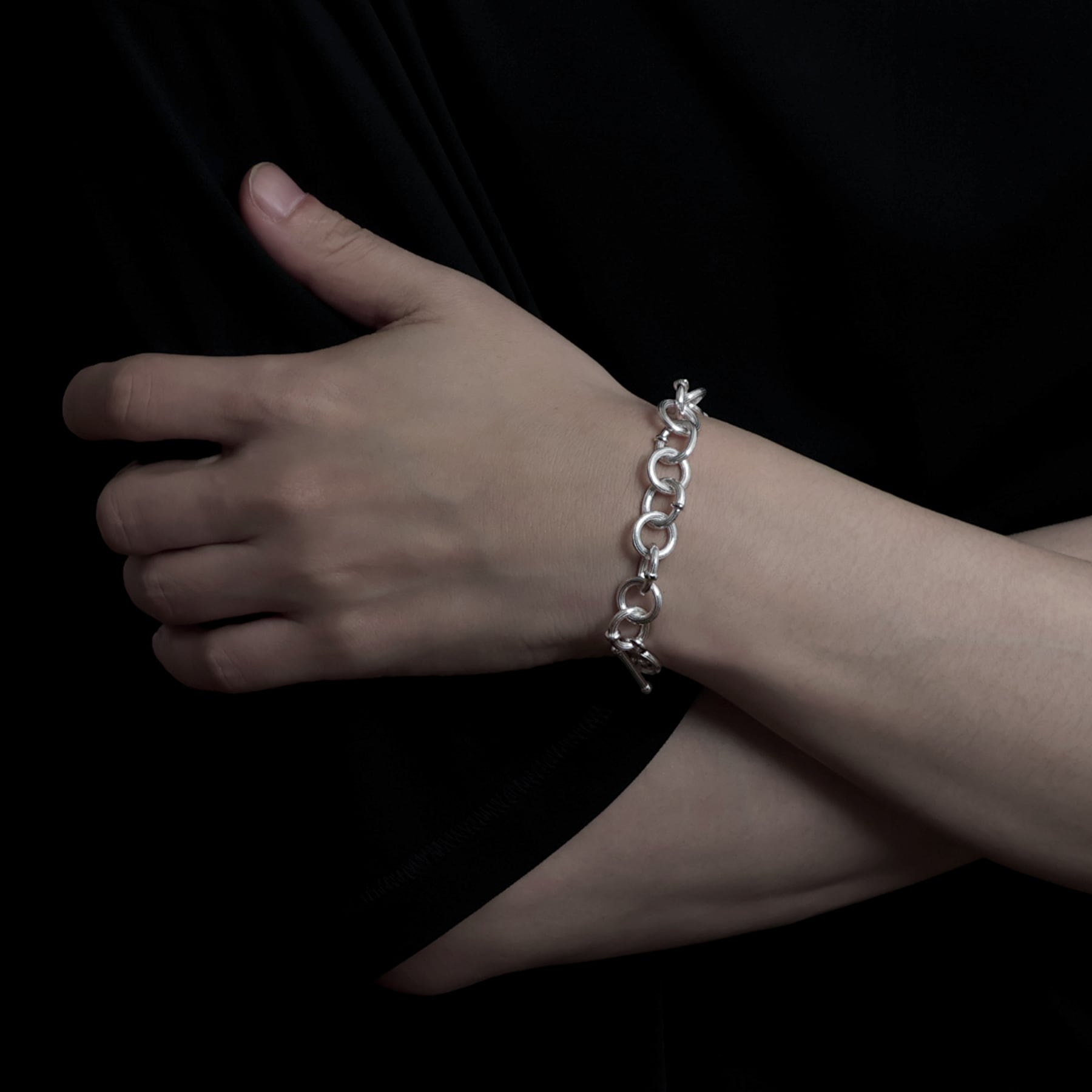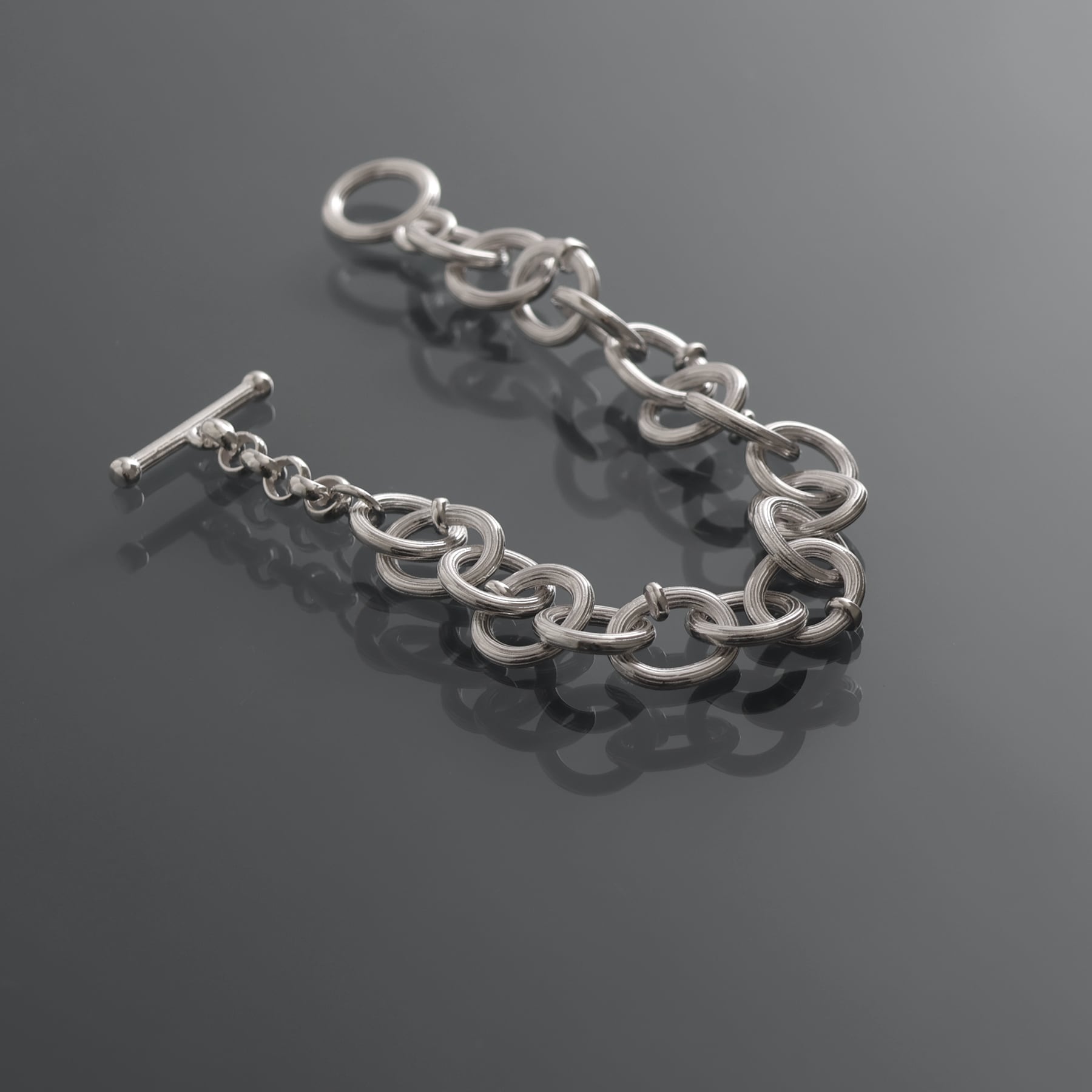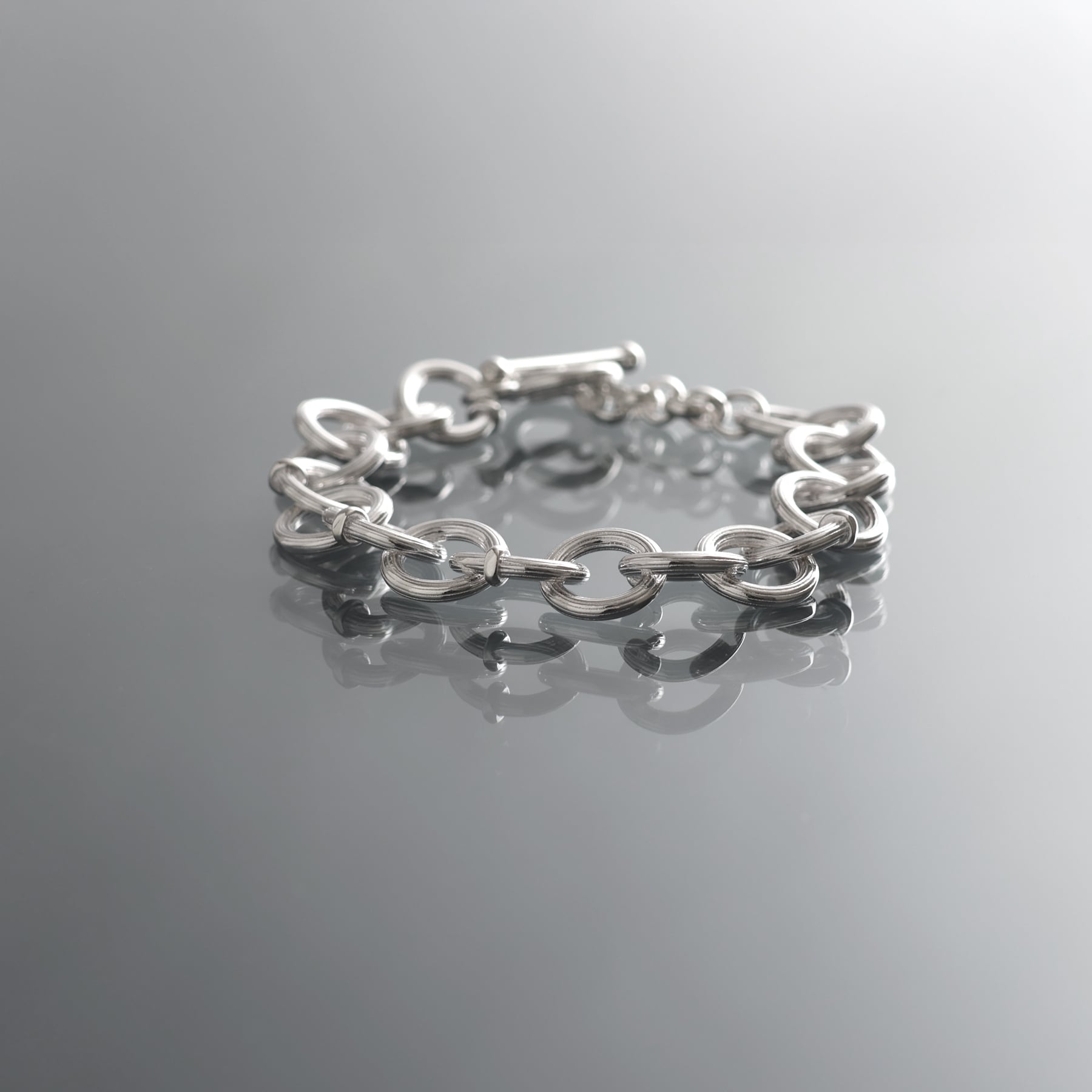 ・円と楕円を交互に繋ぐことで、一定ではないリズムが銀の帯を巻いているかのような、力強く流麗な輝きを生む。