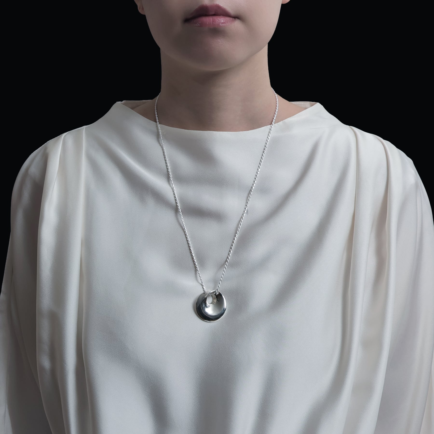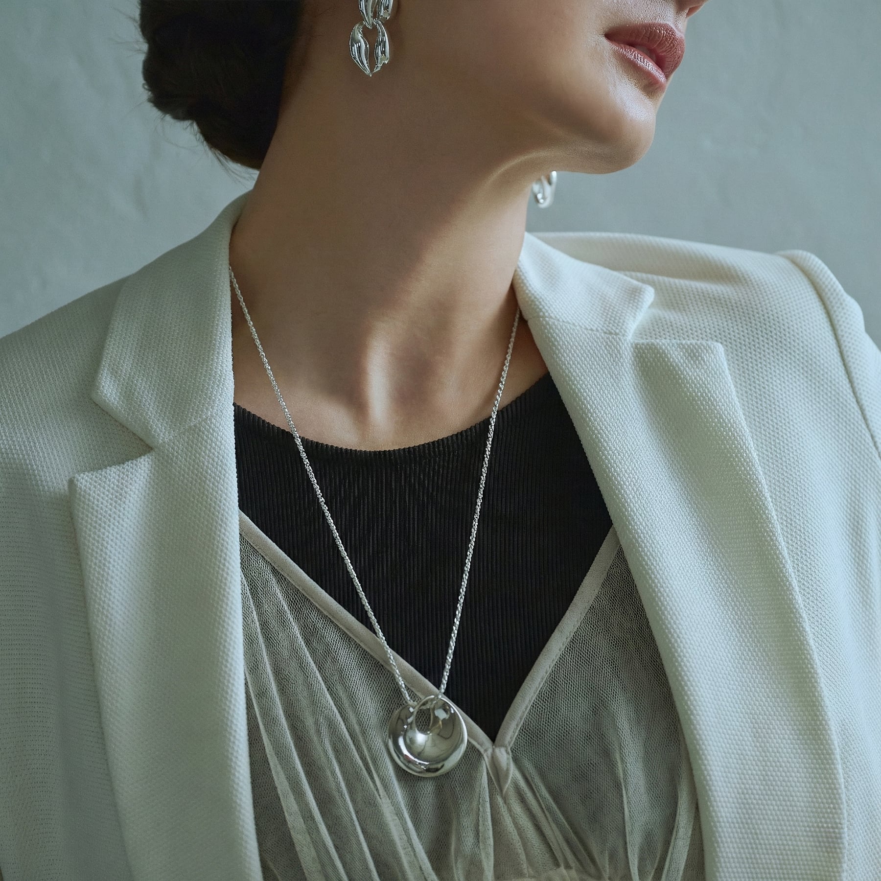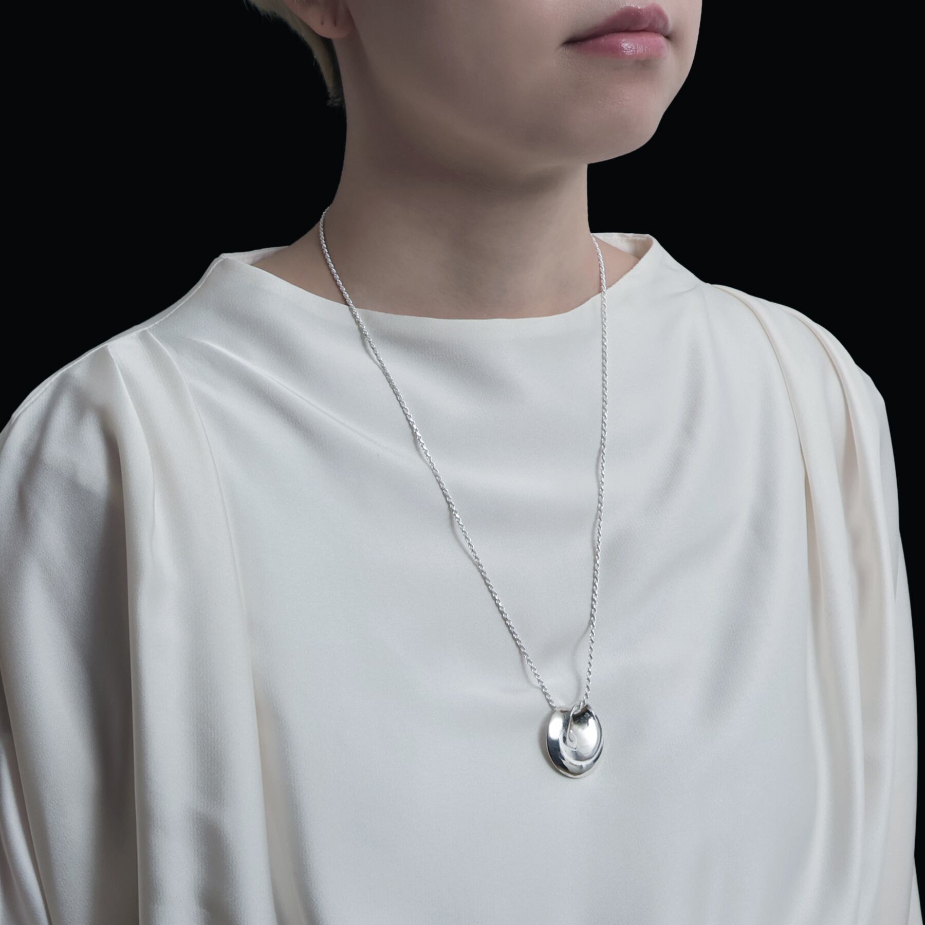 ・しなやかにねじれながら内側へと流れ込むような、彫刻的で錯覚を利用したシルエット。