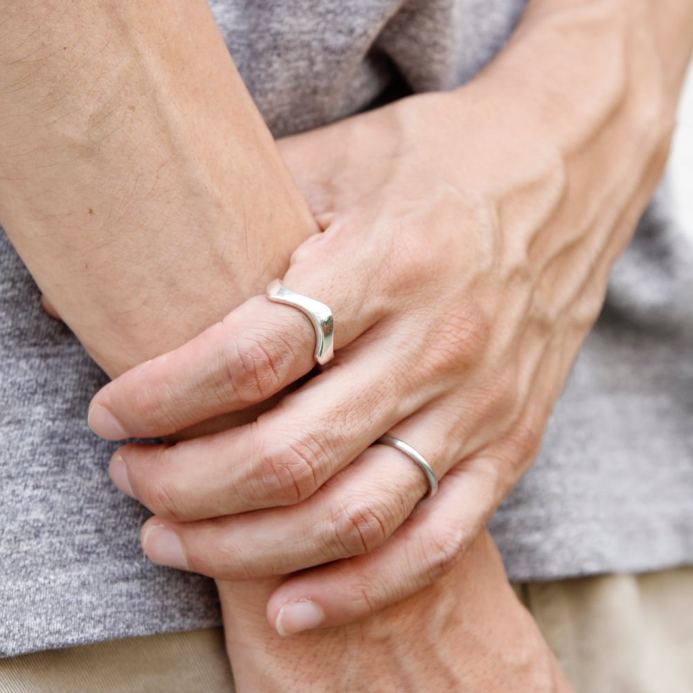 波をイメージしたデザインを考えている時に偶然出来上がった形のリング。