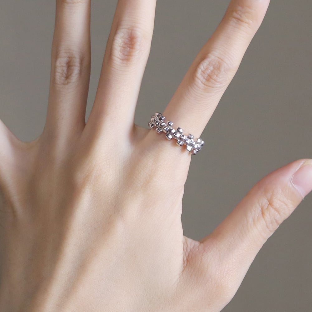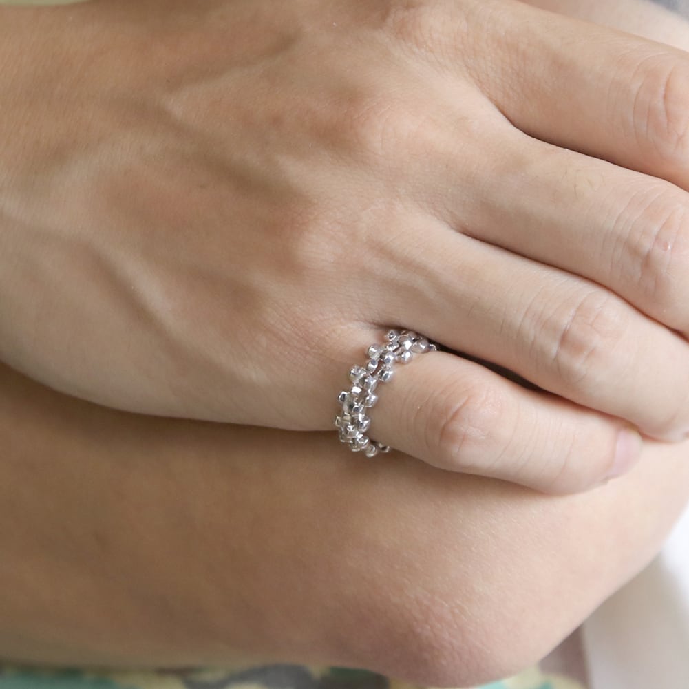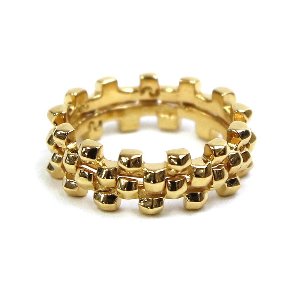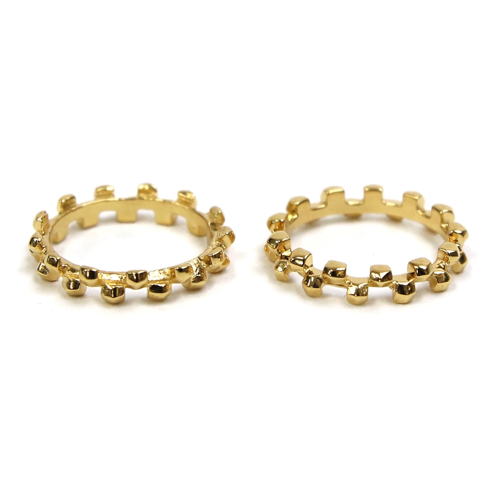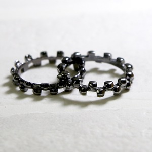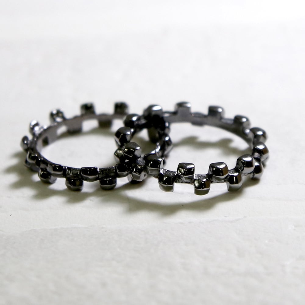 <kacha>は立体的な四角いパーツの連続で構成された商品で、2つのリングを重ね合わせることができます。