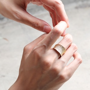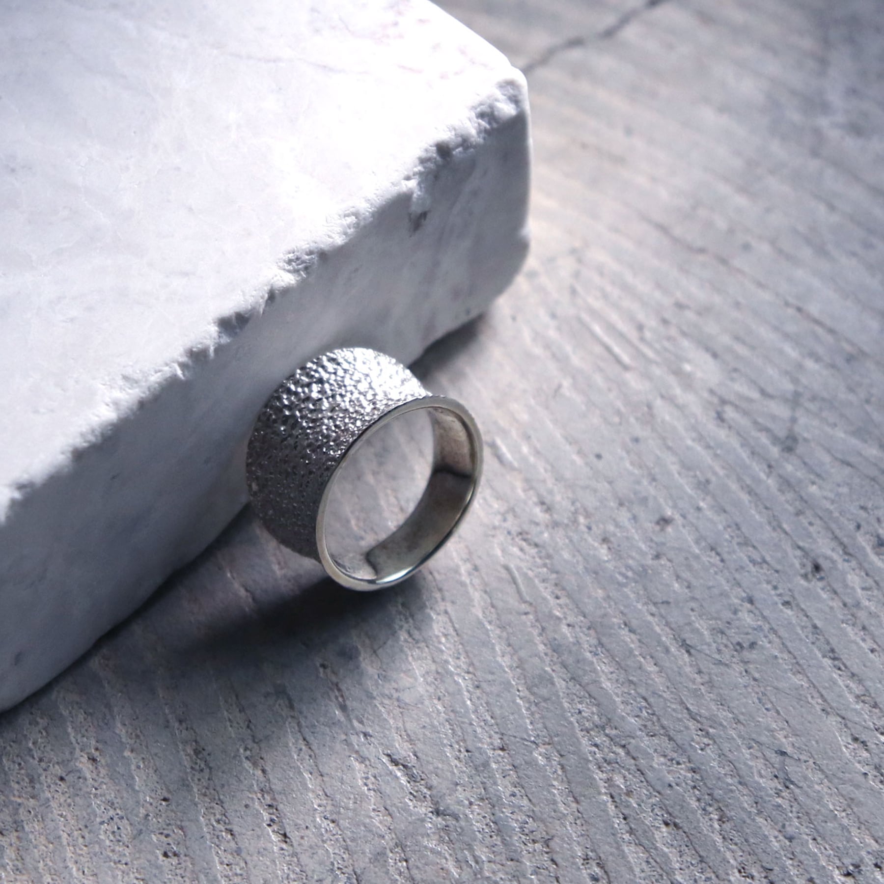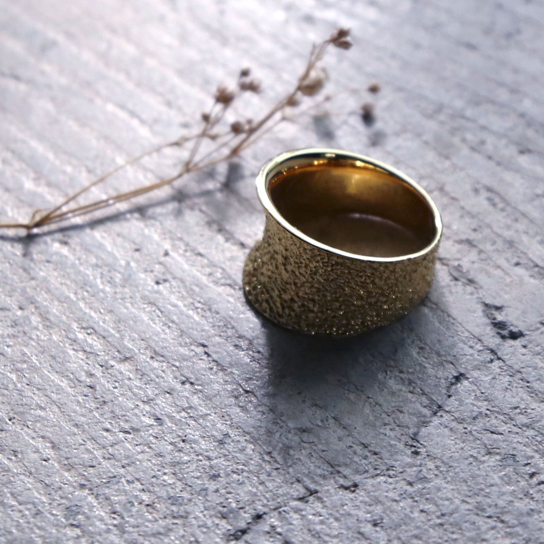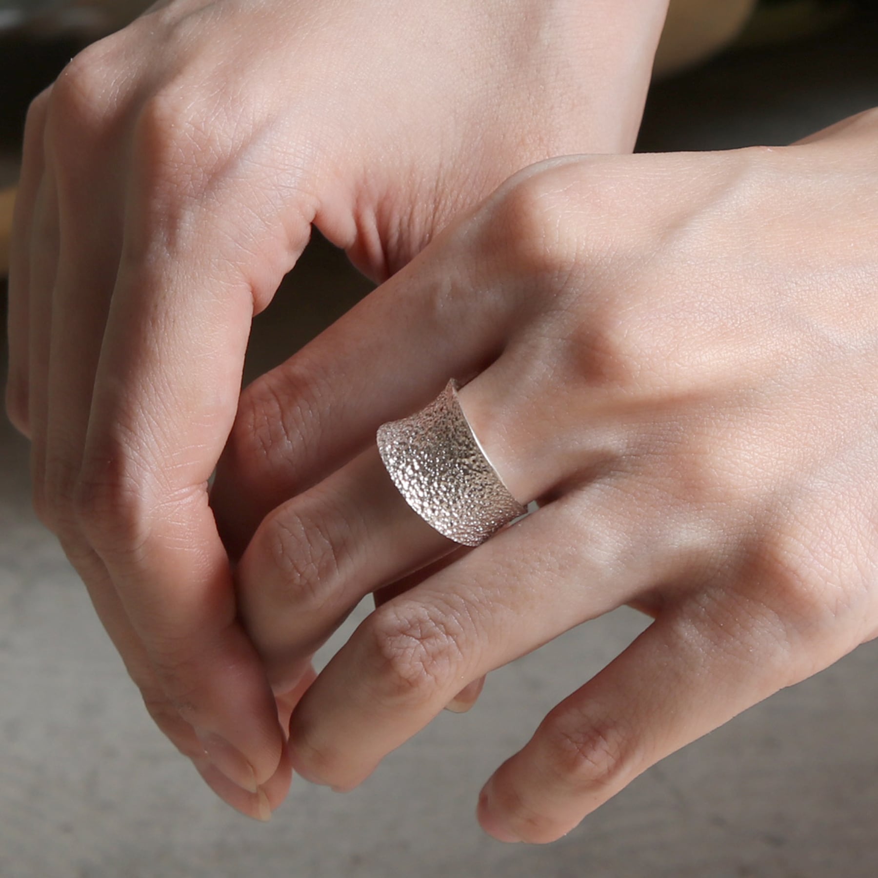 紙を極端にくしゃくしゃにし、それを開いたときの模様をデザインに落とし込んだリング。