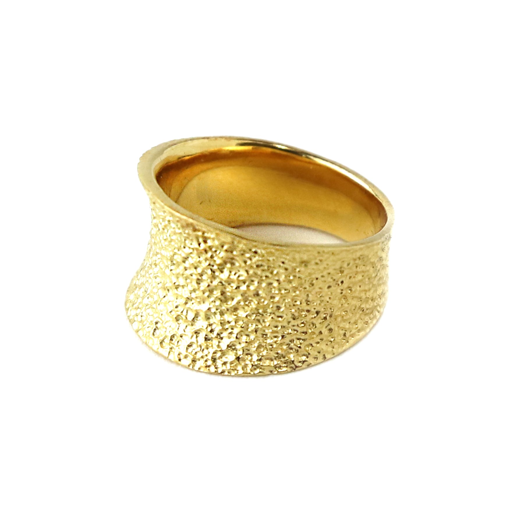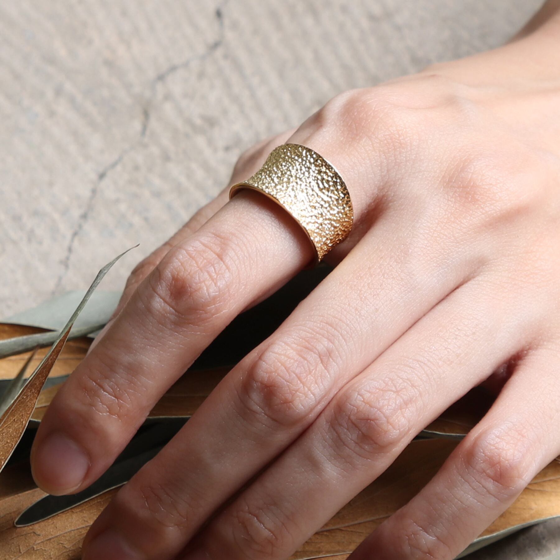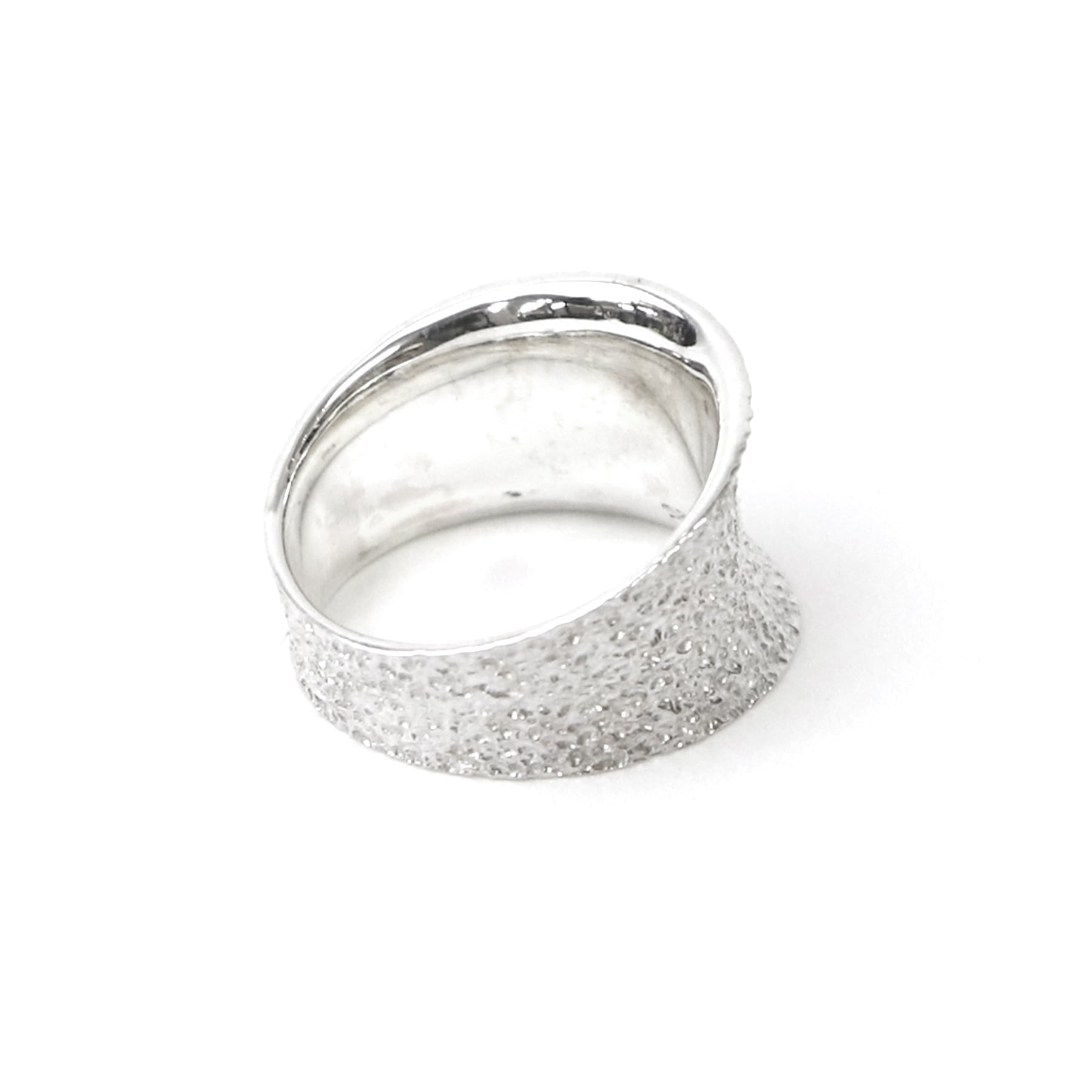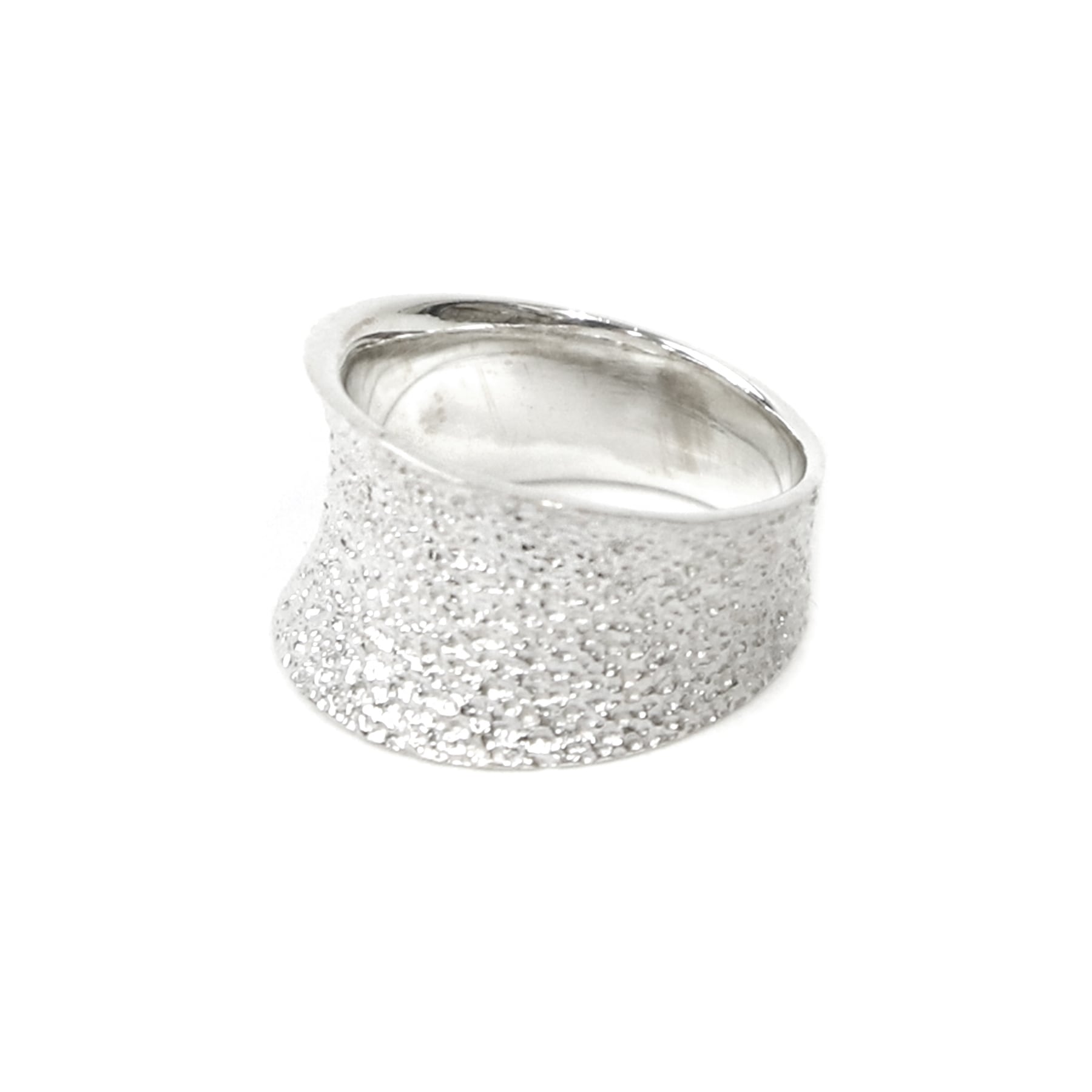 紙を極端にくしゃくしゃにし、それを開いたときの模様をデザインに落とし込んだリング。