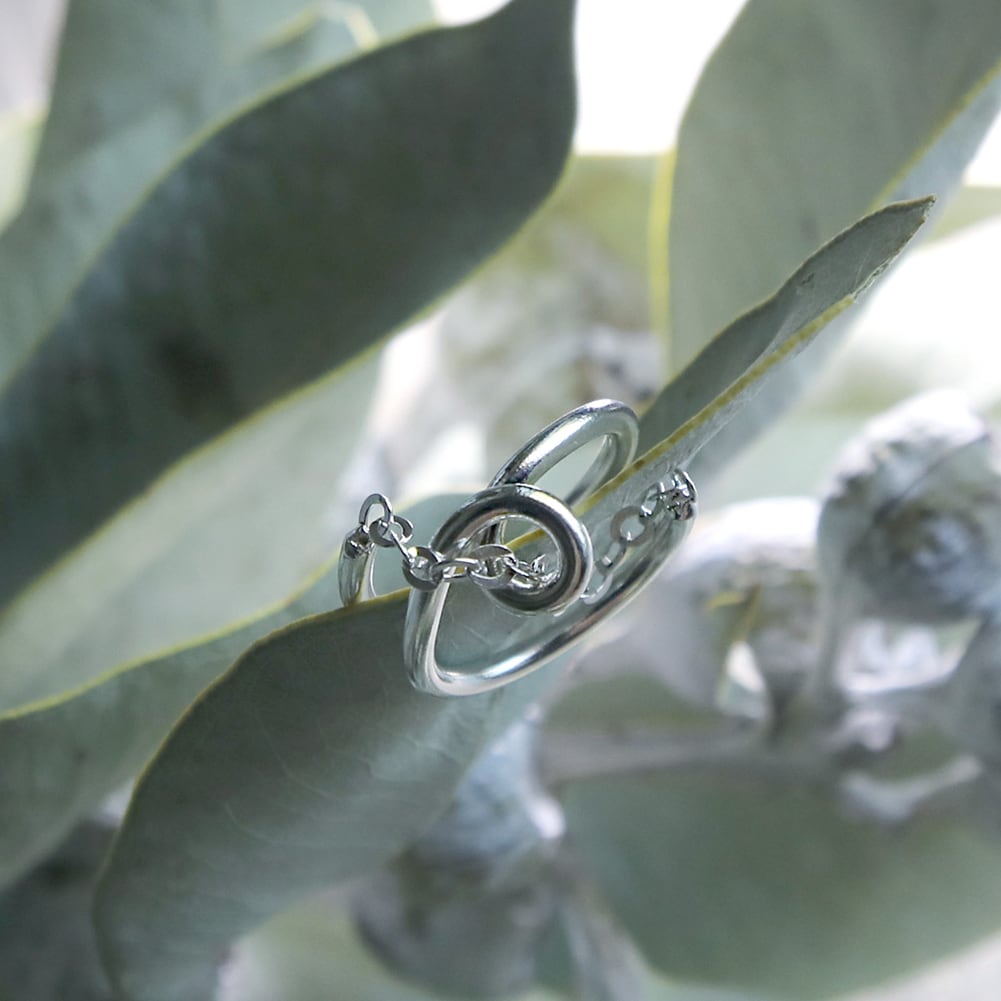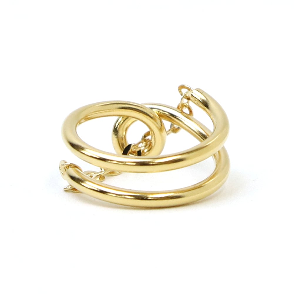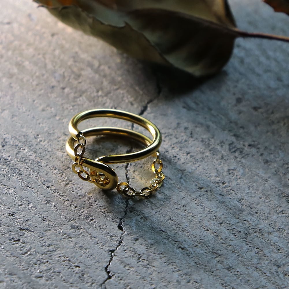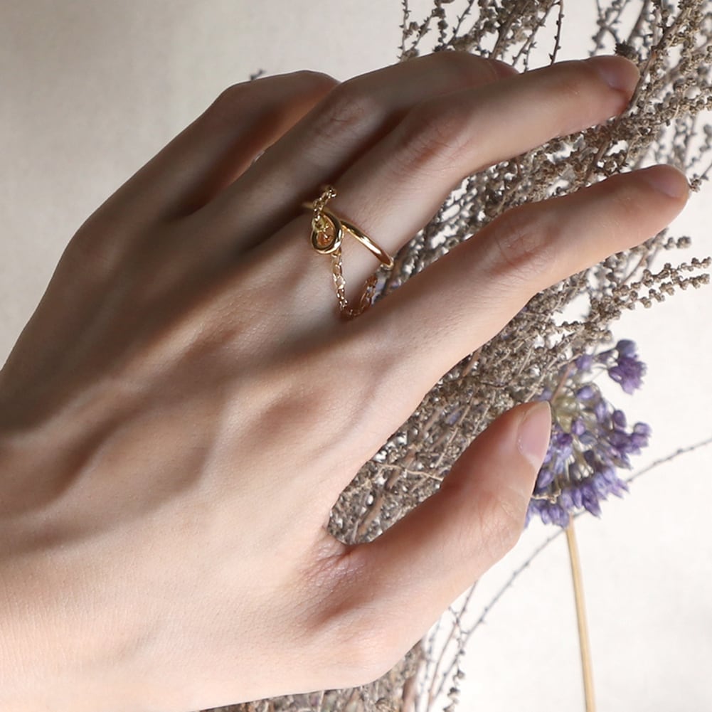 センターにチェーンで橋渡ししたようなデザインのリング。