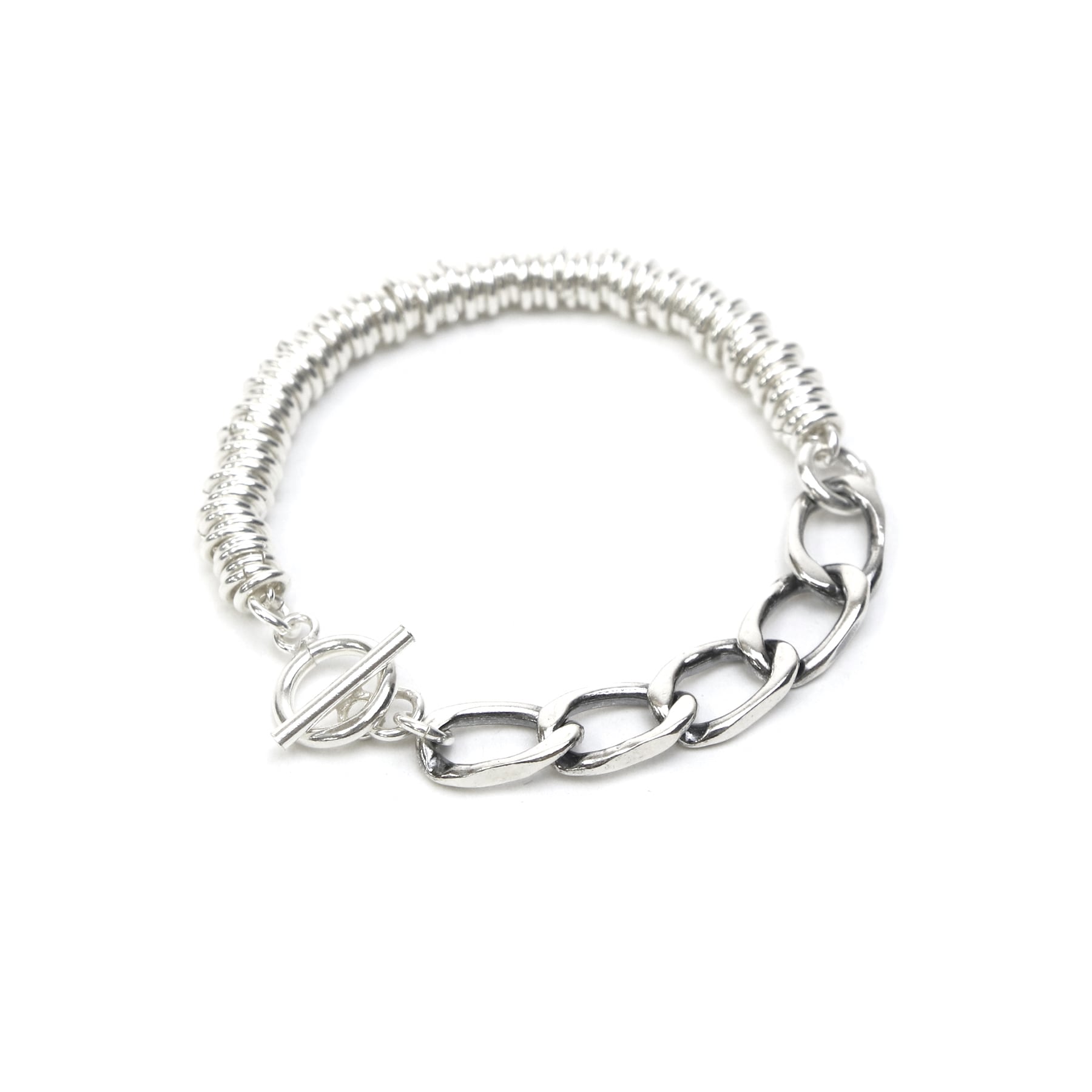 小さな丸のパーツ(マルカン)を重ね合わせ、チェーンと組み合わせたブレスレット。
