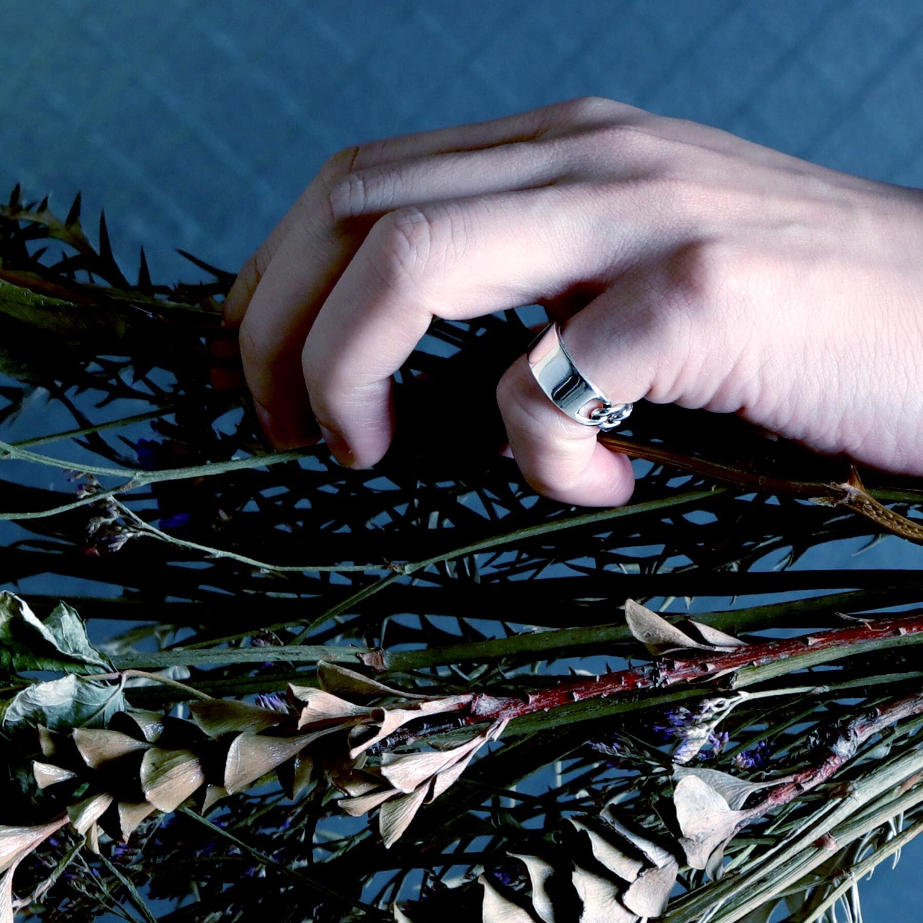 このようなリングは通常チェーン部分は可動しないものが多い(その方が生産効率がいい)のですが、こちらの商品はチェーン部分が動く仕様となっています。