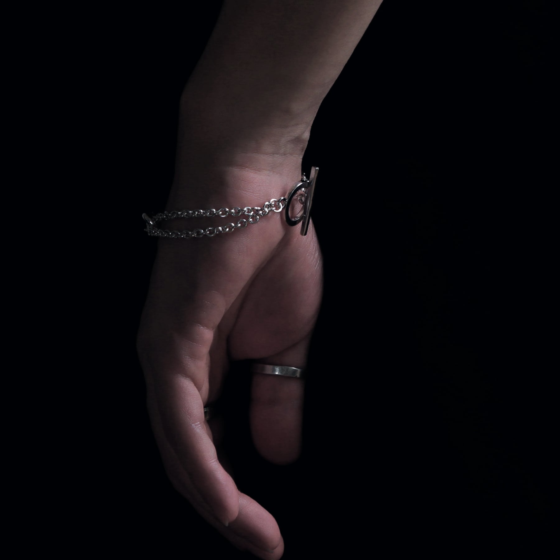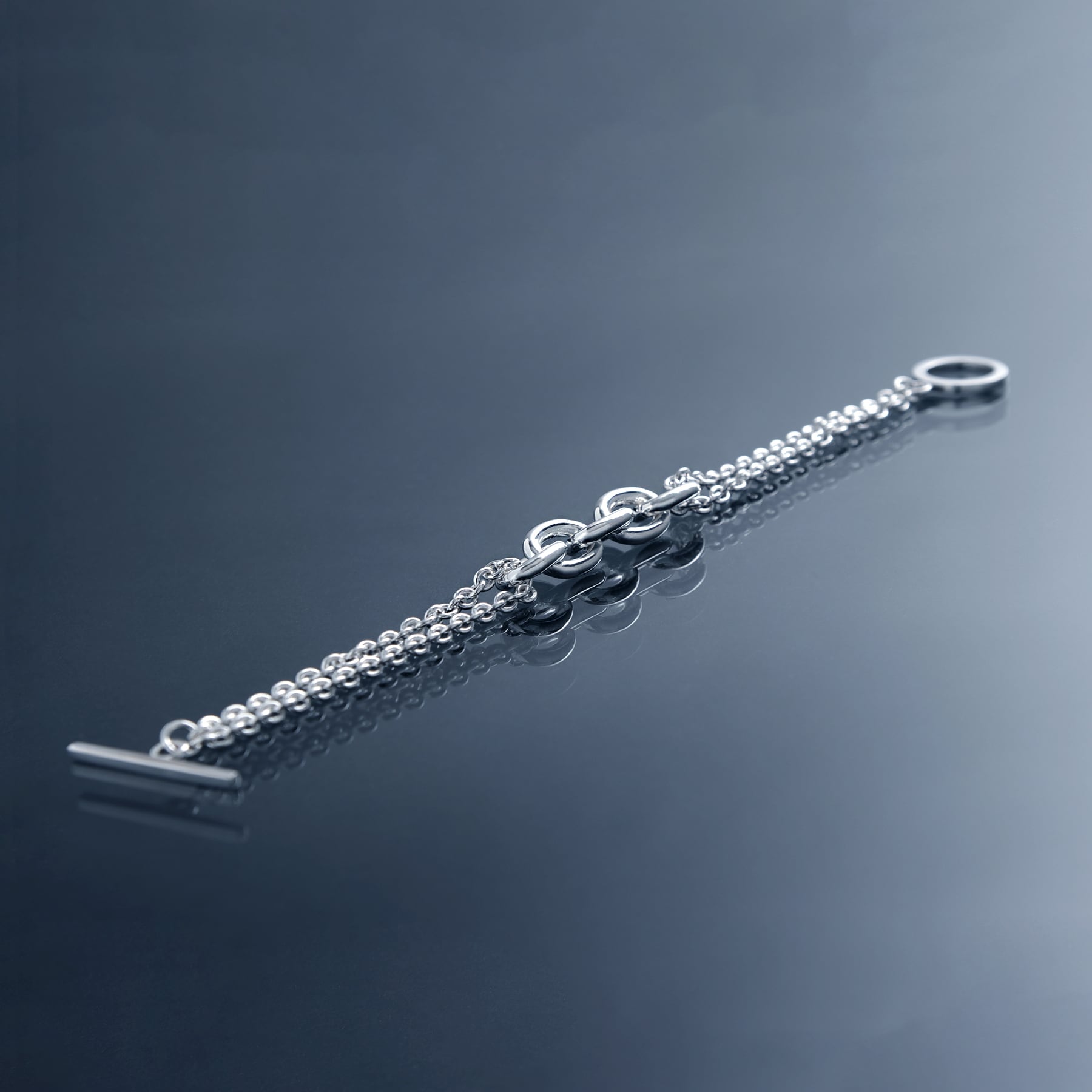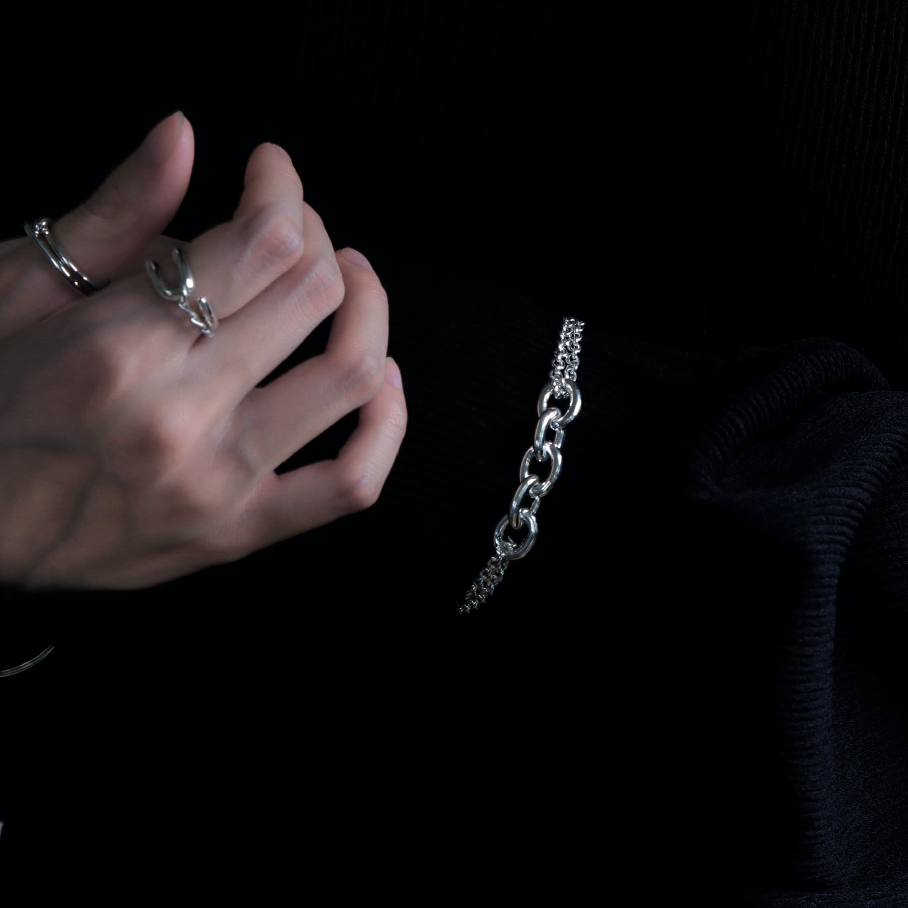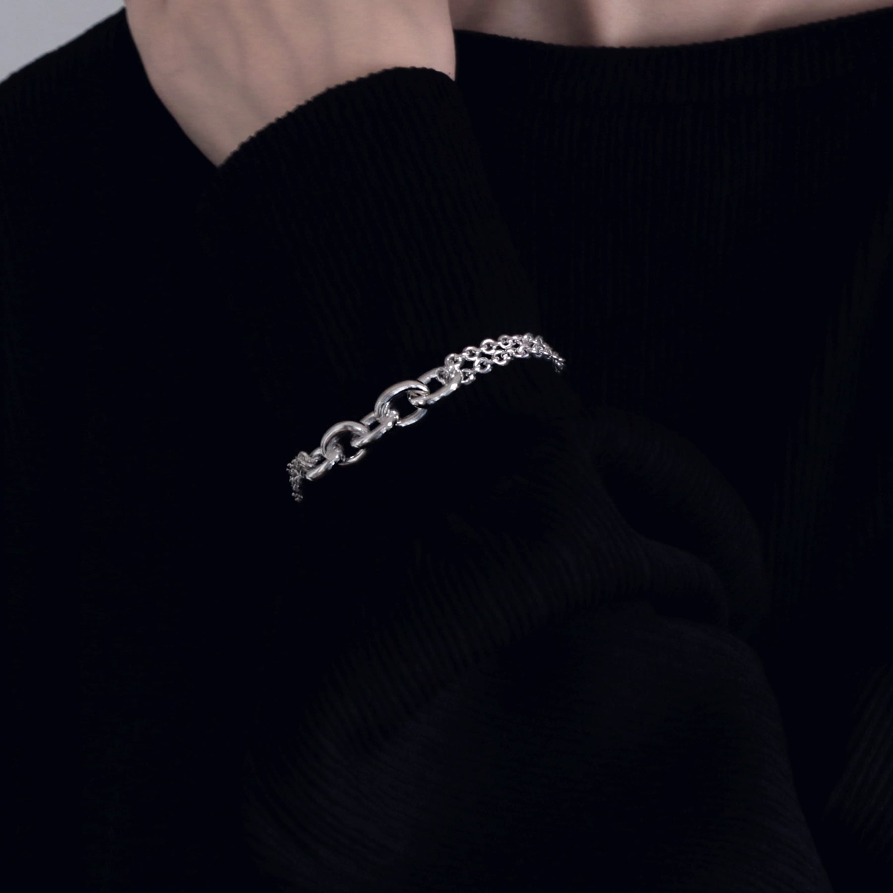 ・正面は重厚感がありハードな印象ですが、サイドにミドルサイズの2重あずきチェーンを配置することで、軽さも併せ持つユニセックスなアイテムに。