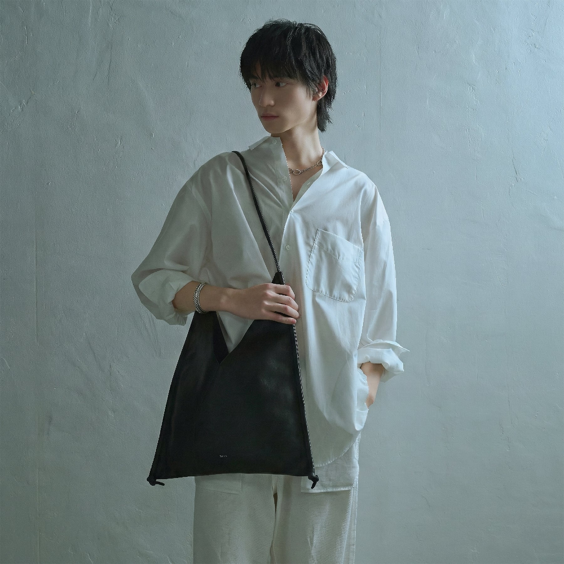 ・縛る位置で長さ調節が可能な革コードを用いたバッグ